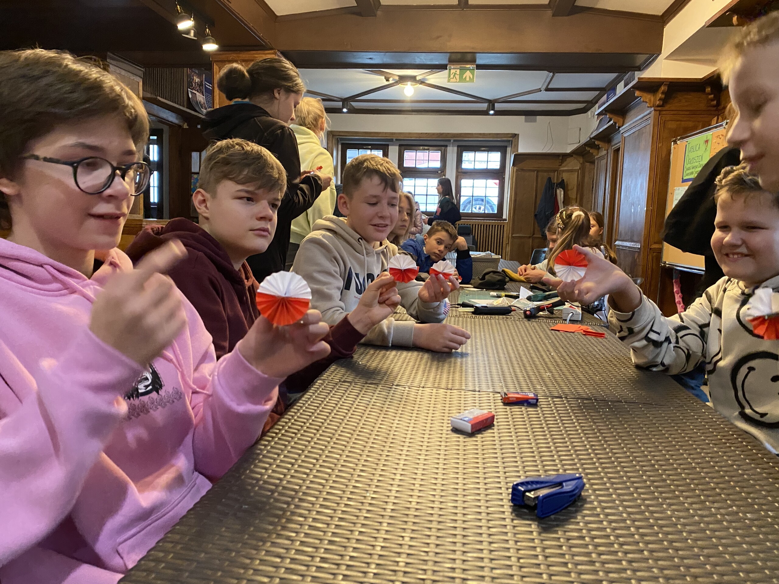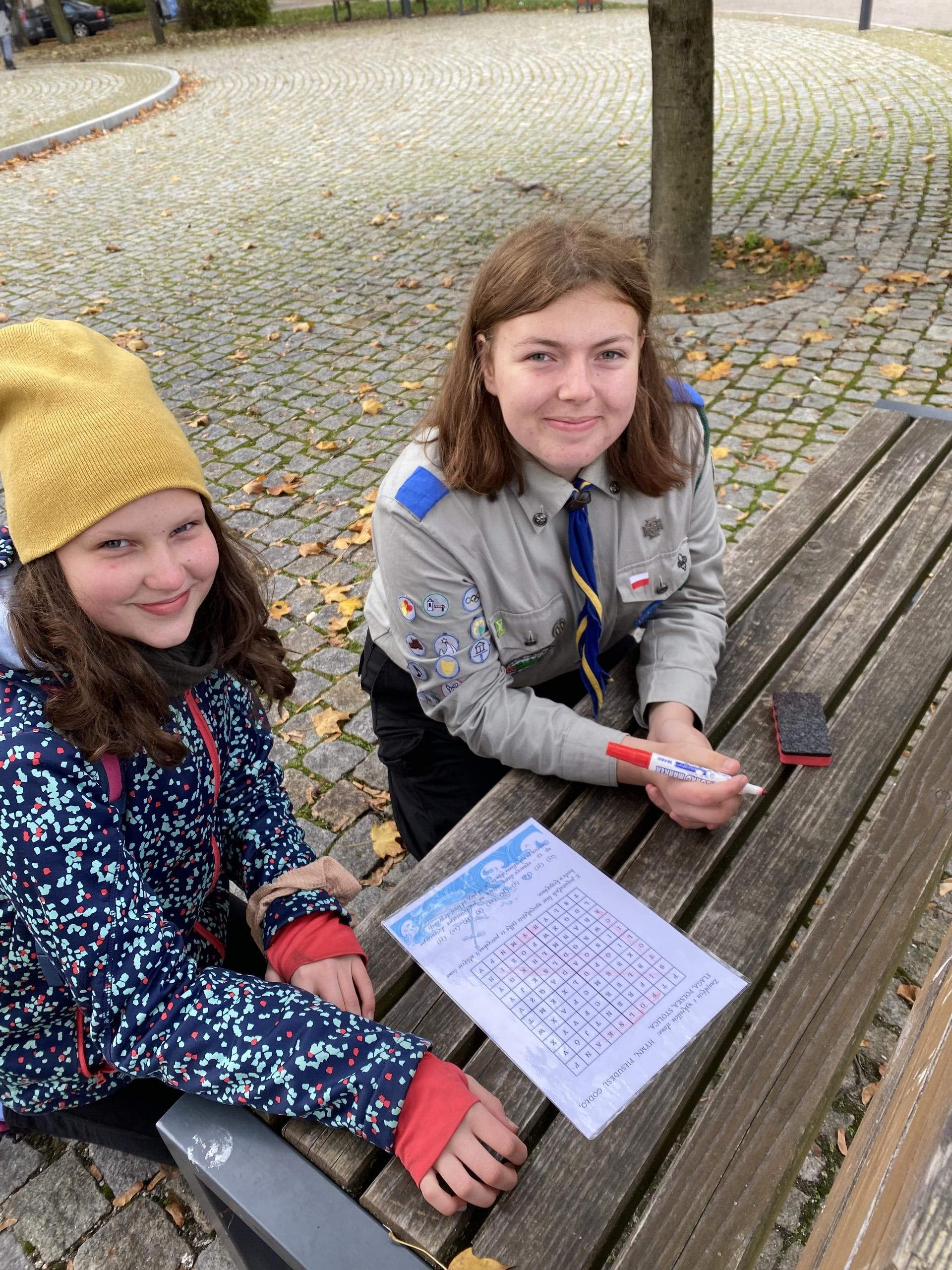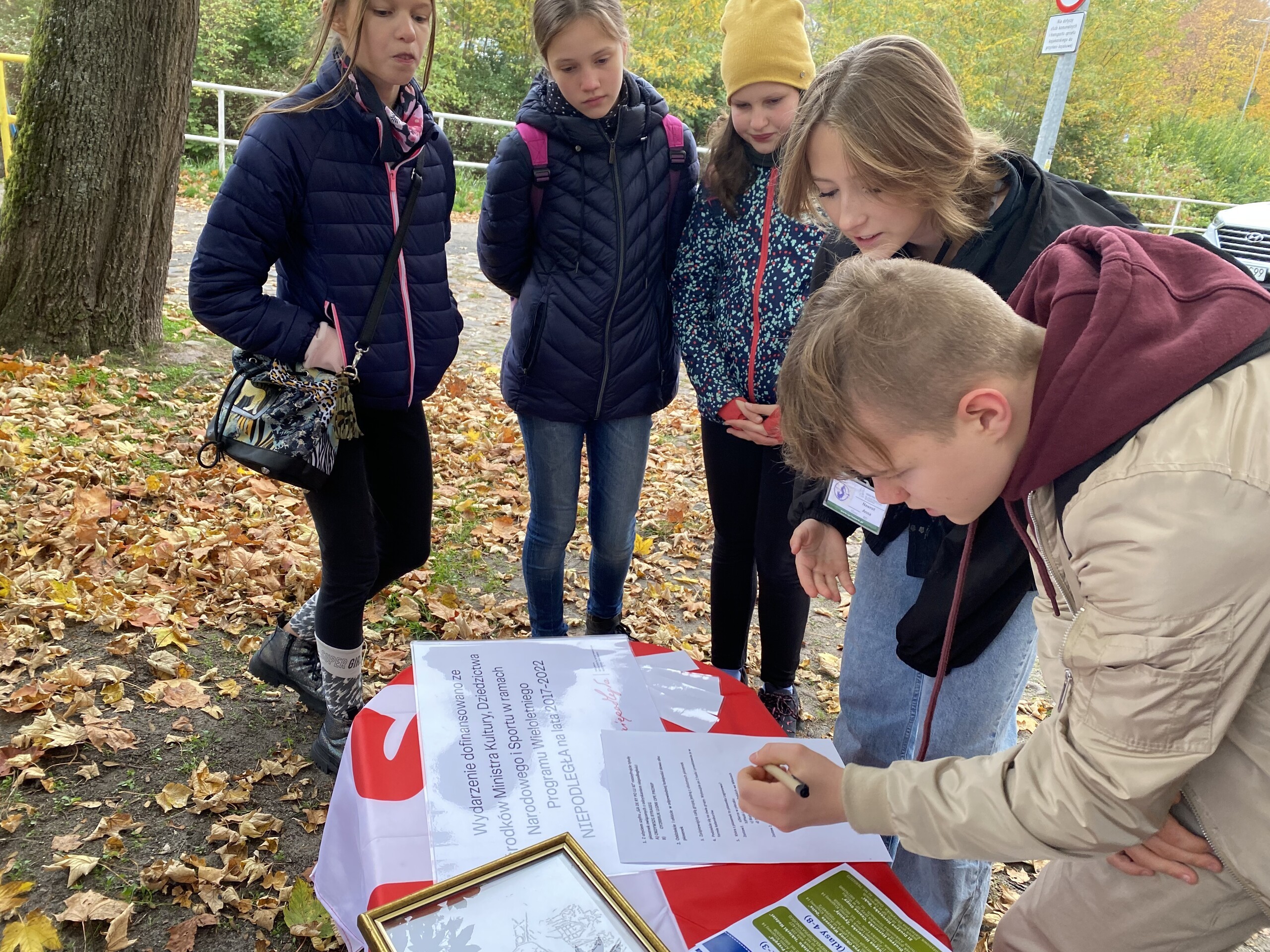 Pod tym hasłem odbyła się w piątek, 21 października, gra terenowa przygotowana przez Związek Harcerstwa Polskiego w Lęborku we współpracy z Chorągwią Gdańską oraz lęborskim muzeum. Nasza szkołę reprezentowała grupa uczniów z klas V, VI i VIII. Każdy zespół otrzymał Kartę patrolową oraz plan sytuacyjny gry. Podzieleni na różne zadania mieliśmy okazję zgłębić historię naszego miasta oraz przypomnieć sobie podstawowe pojęcia związane z patriotyzmem oraz symbolami narodowymi państwa polskiego. Punkt zorganizowany pod lęborskim sądem był okazją do przypomnienia sobie słów pieśni legionowych. Kalambury w wykonaniu uczniów w tym miejscu sprzyjały przypomnieniu symboli narodowych. Przy obelisku Niepodległości przy pomocy kodów QR uczniowie rozszyfrowywali hasło do ułożonej krzyżówki. W tym miejscu dwie harcerki zapewniły także wspólne śpiewanie pląsów harcerskich. Lęborskie muzeum wyświetliło film o kształtowaniu granic w latach 1918-1922. Nie zabrakło odniesień do historii lokalnej. Uczniom przybliżono postaci walczące o przyłączenie ziemi lęborskiej do państwa polskiego po II wojnie światowej: Stefana Hazukę, ks. Szczepana Gracza czy Józefa Kustusza. Ostatnim akcentem dla naszej grupy była wizyta w siedzibie Hufca w Lęborku, gdzie uczniowie mogli samodzielnie wykonać własne kotyliony.