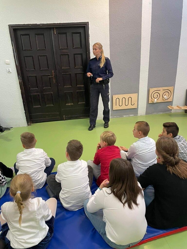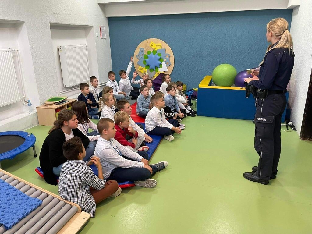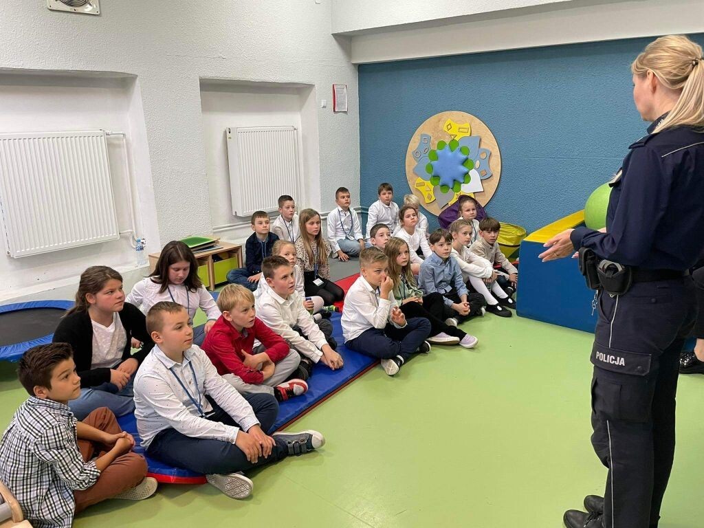 Dnia 13 października 2022r. do szkoły przybyli zaproszeni przez panią pedagog policjanci, którzy przeprowadzili z uczniami klas III spotkania dotyczące bezpieczeństwa w drodze do i ze szkoły. Funkcjonariusze mł. asp. Marta Bąciaszek, mł. asp. Jarosław Sadkowski i asp. szt. Łukasz Kwiatkowski przypomnieli uczniom zasady bezpiecznego poruszania się i zachowania na drodze oraz przestrzegali przed niewłaściwym zachowaniem w jej pobliżu. Uczniowie chętnie odpowiadali na pytania zadawane przez funkcjonariuszy i wykazali się dużą wiedzą na temat przepisów ruchu drogowego. Ponadto policjanci poruszyli ważny temat związany z zachowaniem wobec osób nieznajomych.