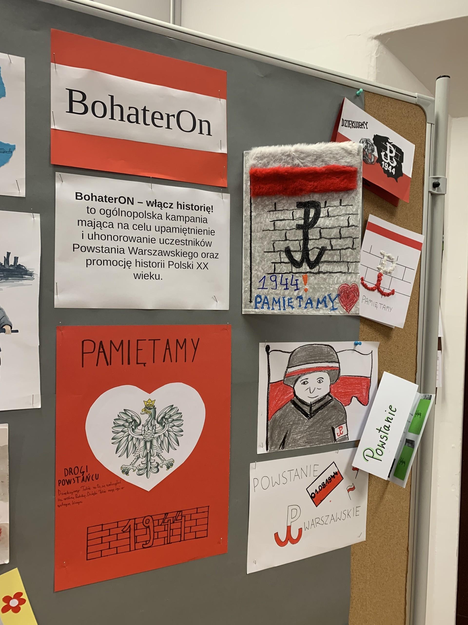 W tym tygodniu zakończyliśmy udział w projekcie BohaterOn. Jest to kampania nakierowana na podtrzymywanie tradycji narodowej związanej z wydarzeniami powstania warszawskiego. Inicjatorzy akcji zachęcają do propagowania historii XX wieku, przybliżania jej młodym pokoleniom w postaci projektu. Nasi uczniowie w ramach akcji wykonali kolorowe lapbooki oraz kartki dla powstańców wyrażające naszą wdzięczność za ich zaangażowanie w wydarzenia powstańcze. Na lekcjach historii przybliżono uczniom sylwetki powstańców warszawskich, uczniowie obejrzeli filmy edukacyjne i relacje świadków. Mamy nadzieję, że każdego 1 sierpnia, w dzień wybuchu powstania, uczniowie naszej szkoły będą aktywnymi uczestnikami wydarzeń patriotycznych.