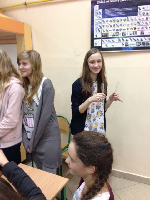 Tematem przewodnim zajęć były substancje słodkie. Uczennice miały okazję rozwinąć swoją wiedzę na ten temat i zobaczyć spektakularne doświadczenia, przygotowane przez uczniów liceum. Każdy uczestnik mógł również samodzielnie przeprowadzić kilka ciekawych doświadczeń np.: wykryć skrobię w produktach spożywczych.