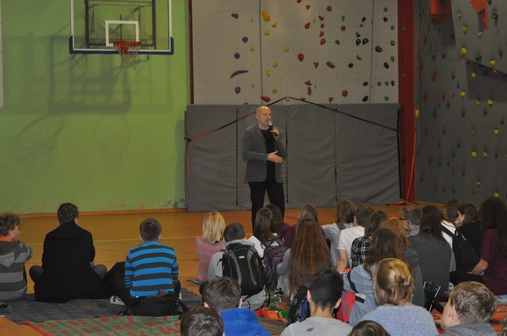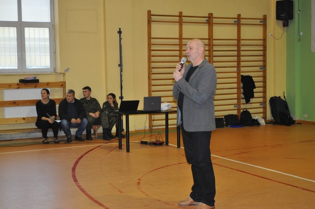 Tego samego dnia gimnazjaliści spotkali się z p. Aleksandrą Motas oraz p. Ryszardem Sałasińskim – reprezentującymi Powiatowe Centrum Edukacyjne. Uczestnikom spotkania zaprezentowano zawody, w których mogą podjąć kształcenie już od września 2016 roku. W spotkaniu uczestniczyli również nasi ubiegłoroczni absolwenci, którzy obecnie są uczniami PCE i kształcą się na kierunku technik logistyk o profilu wojskowym.
