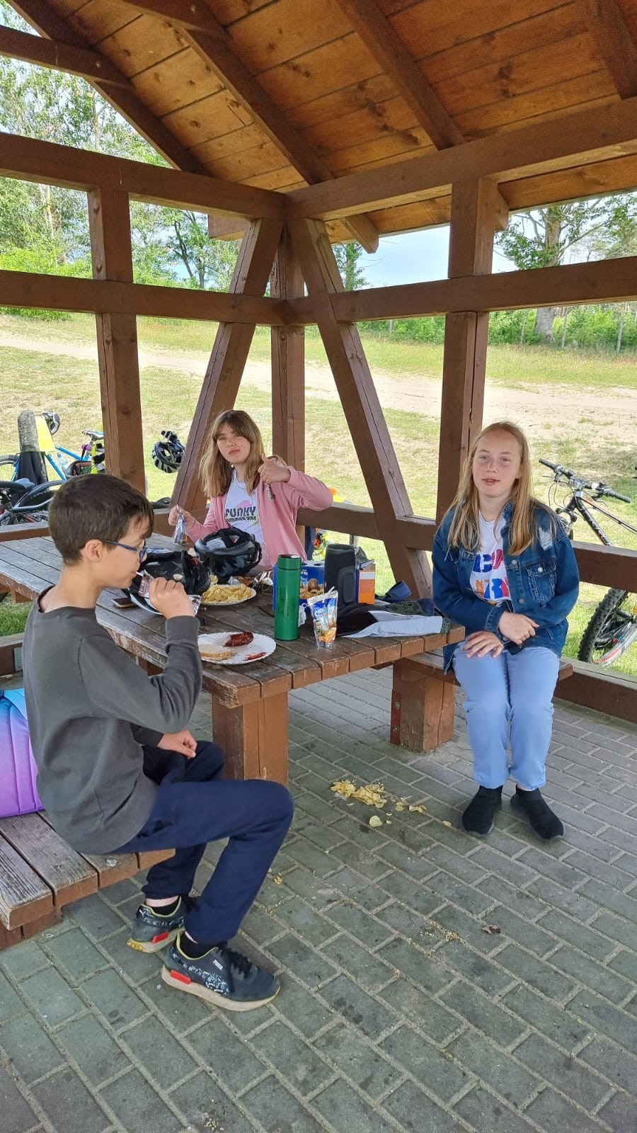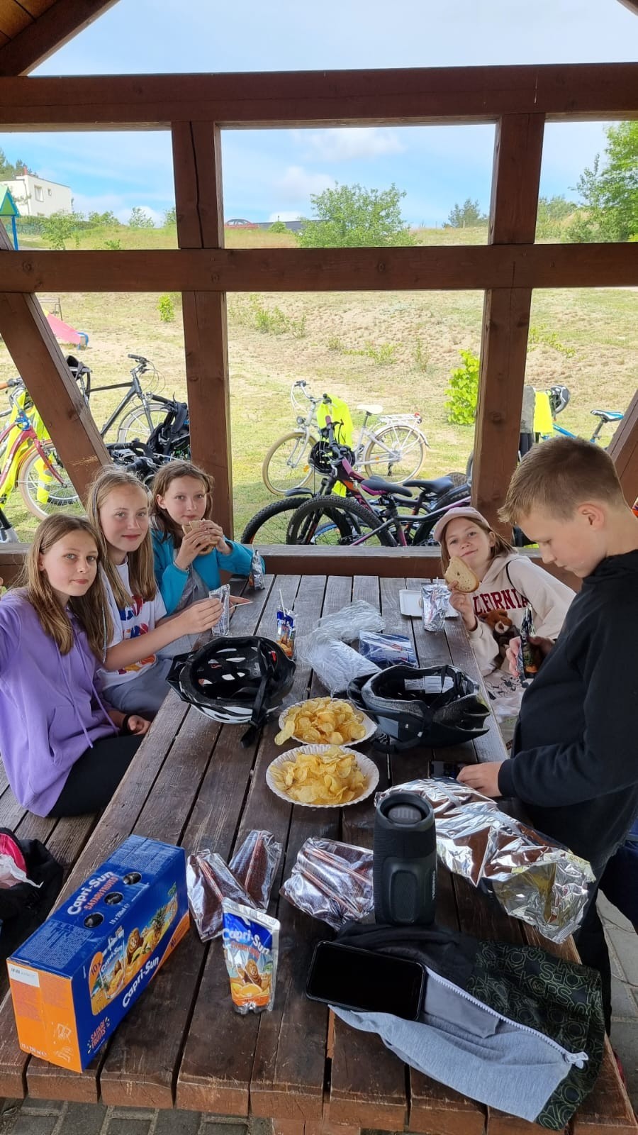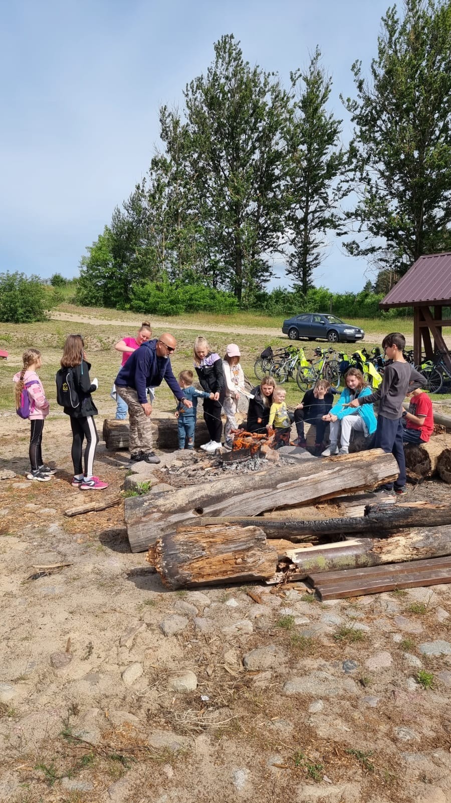 Kolejną wspólną wyprawą klasy 4c był rajd rowerowy, na który uczniowie wyruszyli z p. Jackiem Dziekanowskim oraz z p. Adamem Ziółek. Wystartowali ze szkoły i ścieżkami rowerowymi dojechali do lasu przy ulicy Kaszubskiej. Stamtąd rowerzyści pojechali bezpieczną drogą przez las do os. Wschód Lębork aż do plaży przy Jeziorze Lubowidzkim. Tam czekały na nich wspaniałe mamy, które wcześniej rozpaliły ognisko. Zmęczeni czwartoklasiści mogli upiec sobie kiełbaski i zjeść je w znakomitym towarzystwie. Nie zabrakło też wspólnej zabawy i gry w piłkę.
