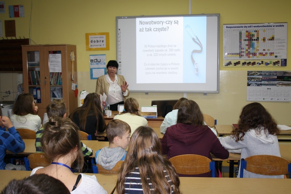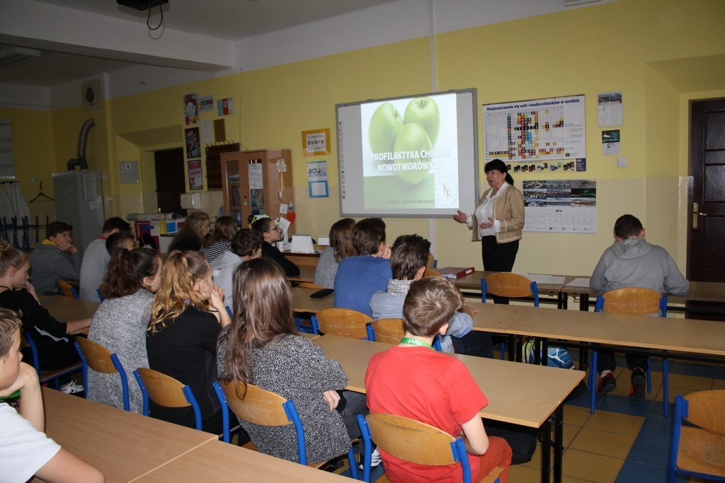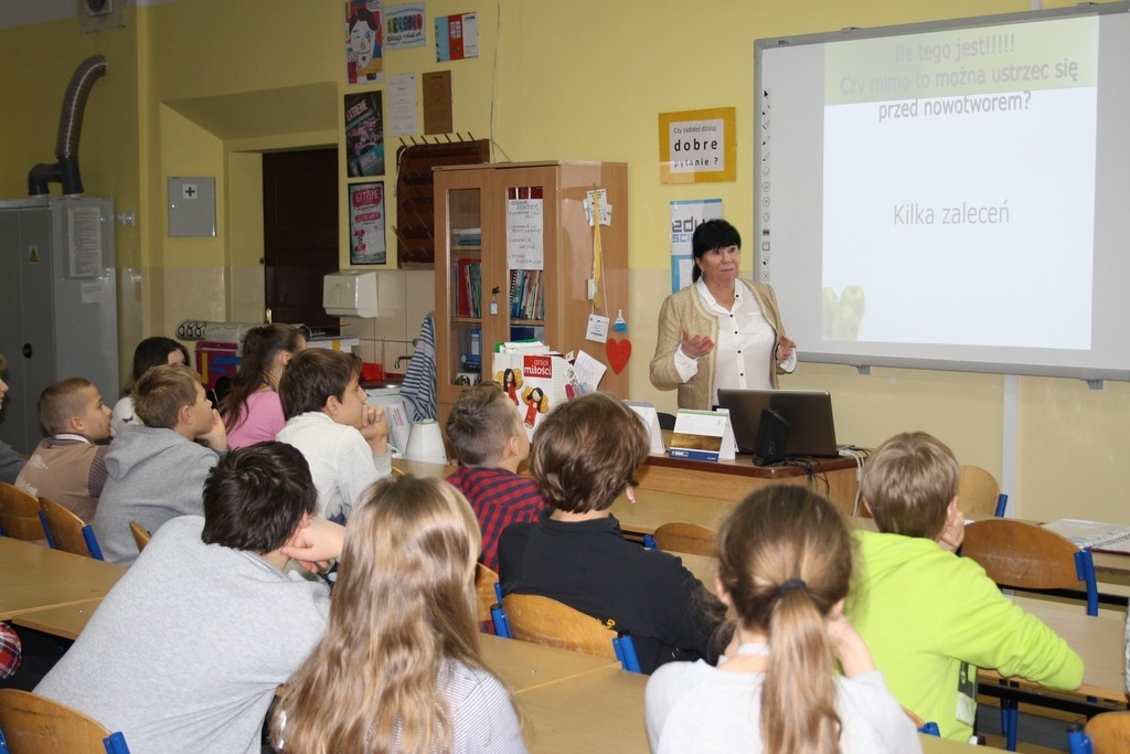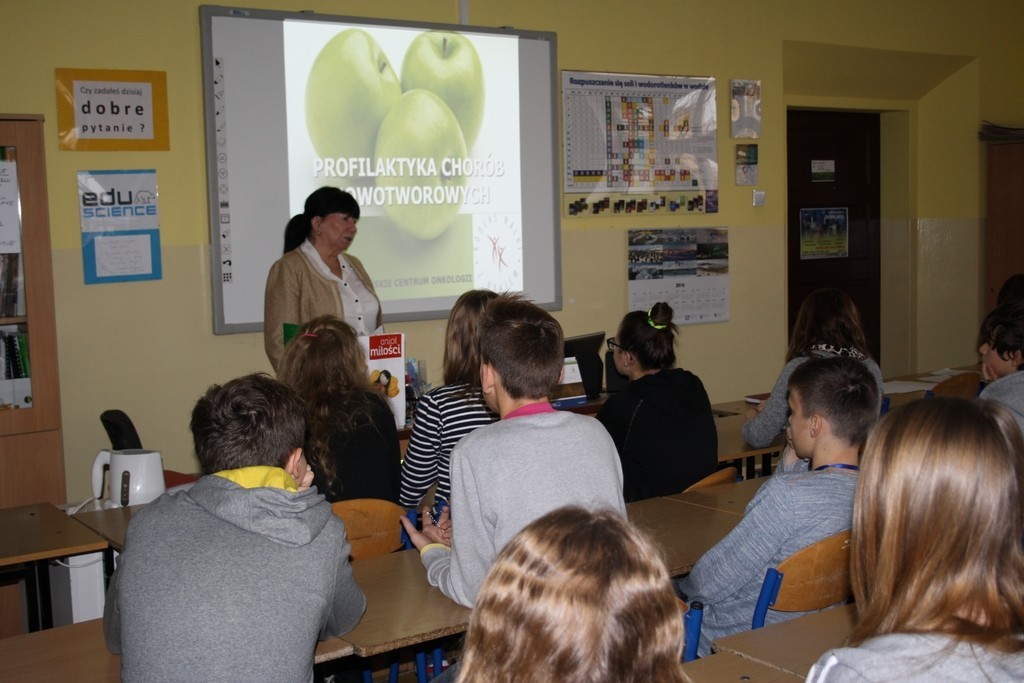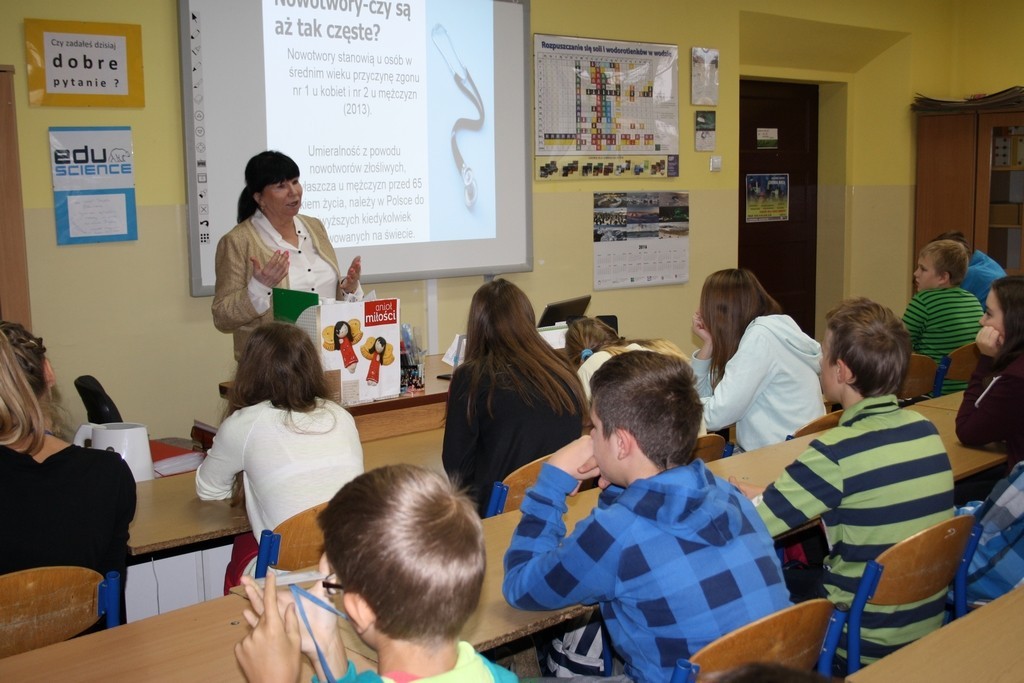 W dniu 6 listopada br. grupa gimnazjalistów uczestniczyła w spotkaniu z panią Lilianną Hoppe – doktorem nauk medycznych. Dotyczyło ono tematyki prewencji pierwotnej nowotworów złośliwych.