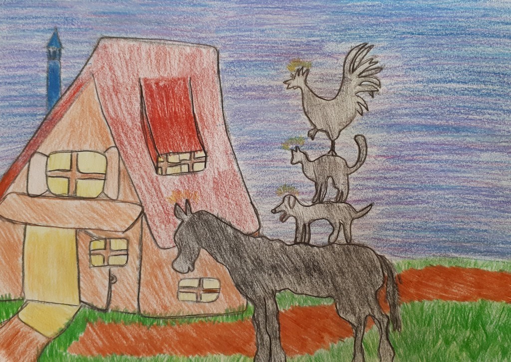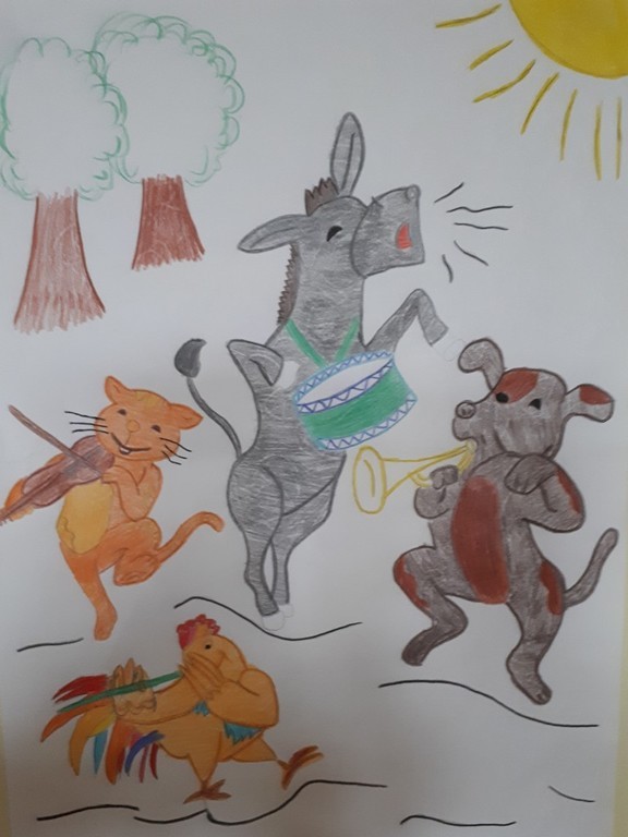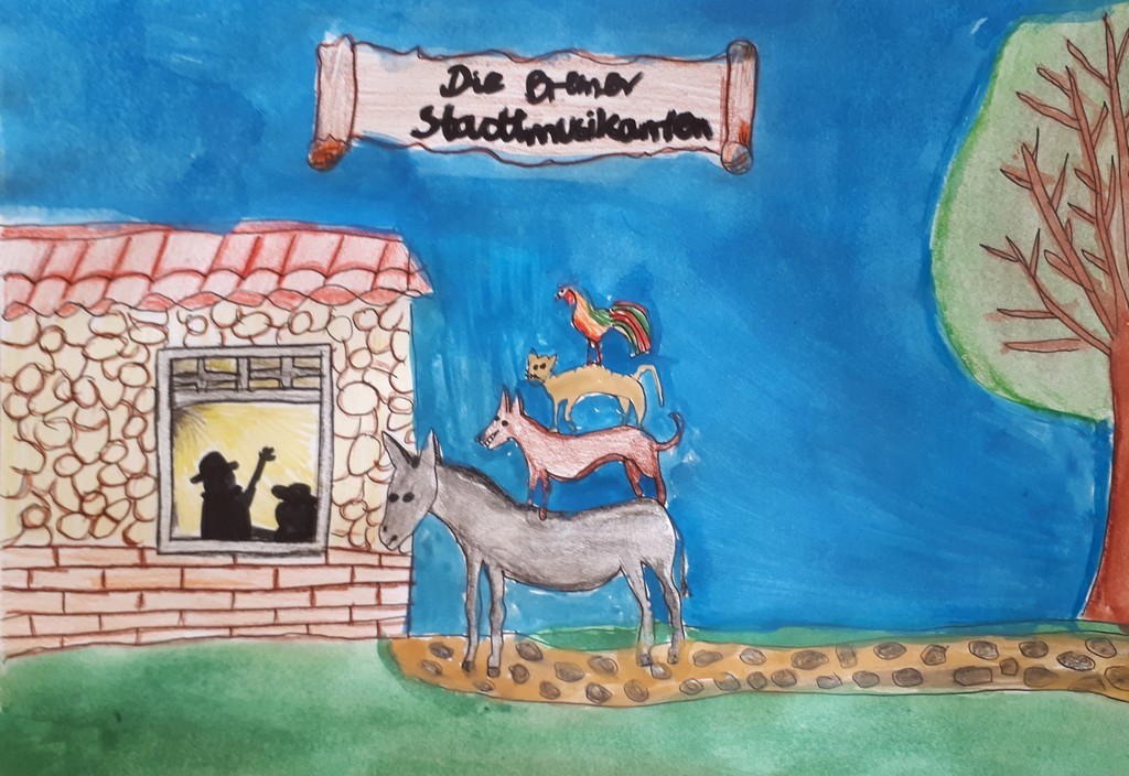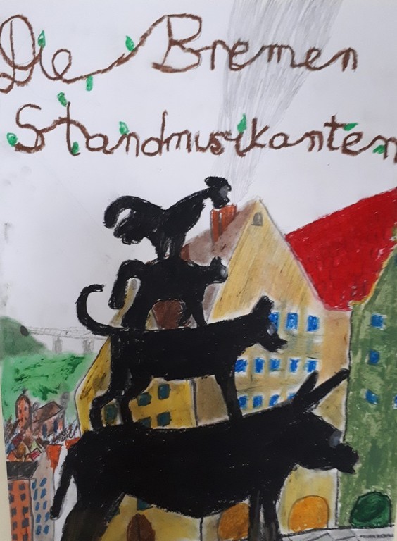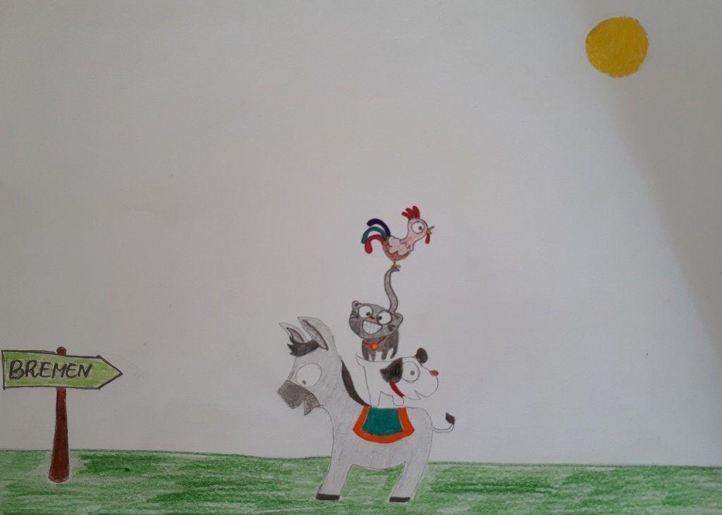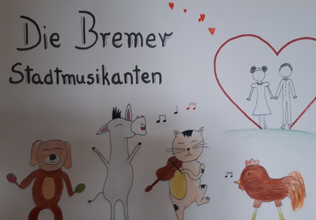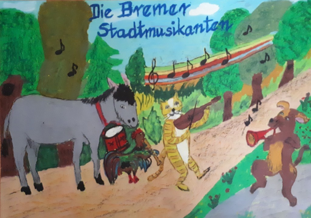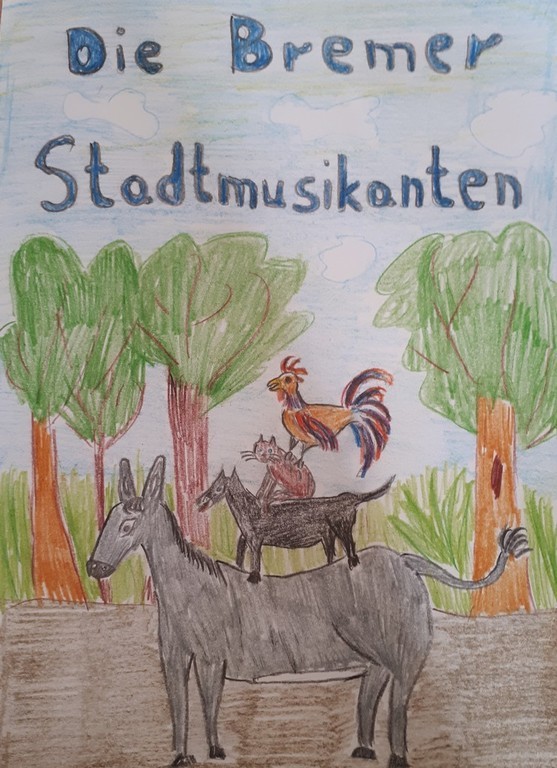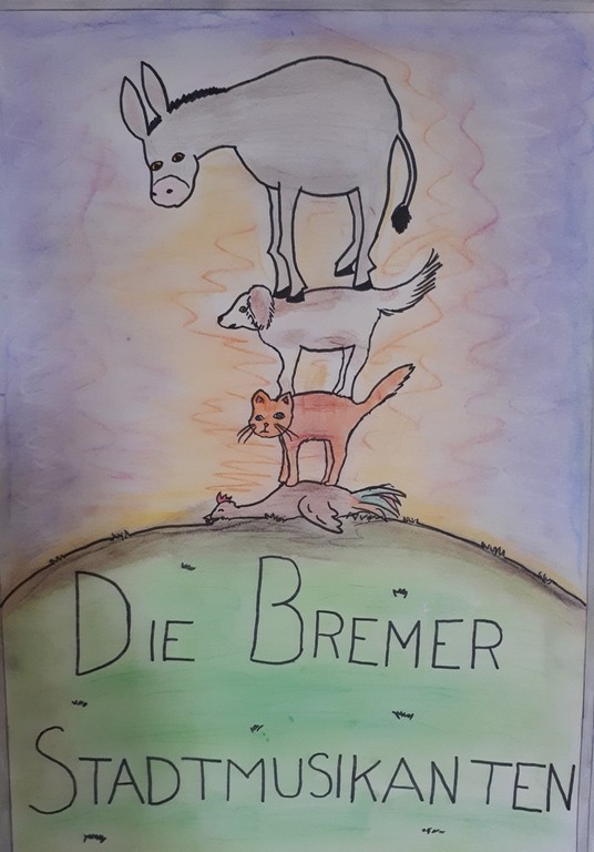 W kwietniu zakończyliśmy rywalizację na najciekawszy plakat do filmu „Die Bremer Stadtmusikanten”, który wspólnie oglądaliśmy na lekcji języka niemieckiego. Bohaterami filmu są osioł, pies, kot i kogut. Dawniej zwierzęta te wiernie służyły gospodarzowi, jednak kiedy się zestarzały przestały efektywnie pracować, wówczas gospodarz postanowił się ich pozbyć. Zwierzęta, by ratować życie, postanawiają uciec do Bremy i tam zacząć lepsze życie jako...muzykanci.