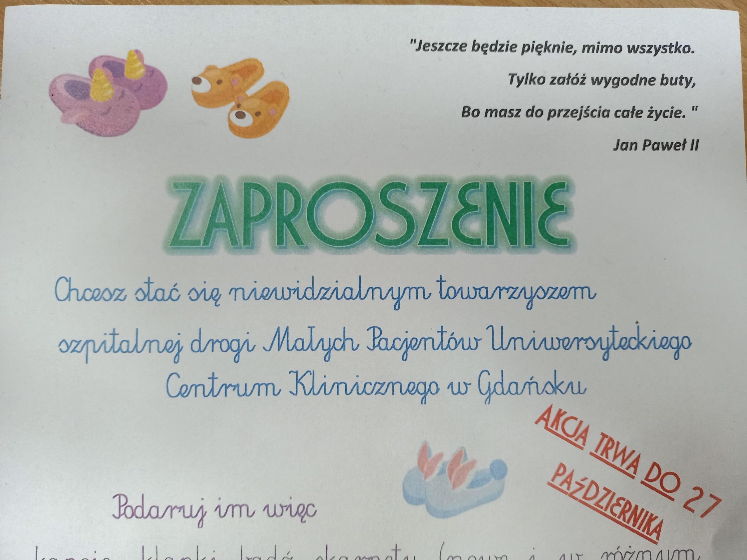 Wystarczy przynieść do szkoły kapcie, klapki, skarpetki (nowe i w różnym rozmiarze), które umilą czas dzieciom w szpitalnej codzienności i przypomną , że jest ktoś- kto o nich myśli i pamięta.
