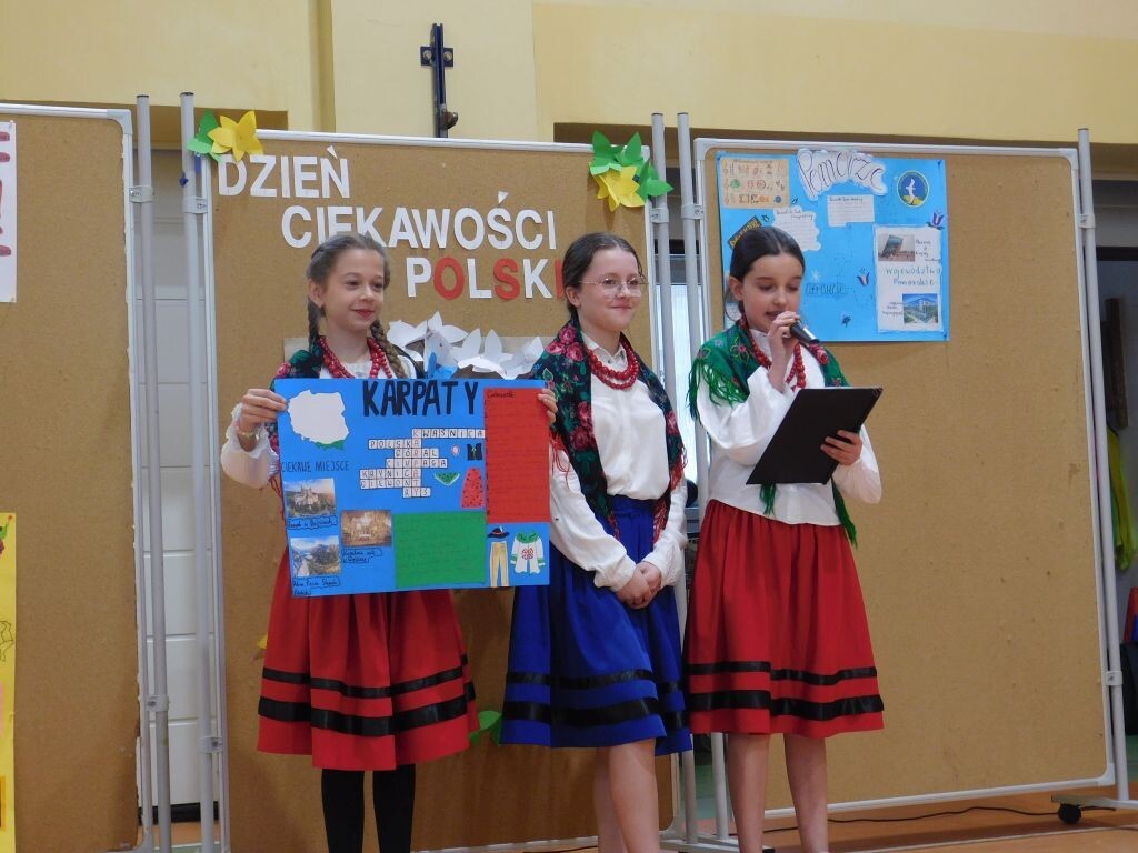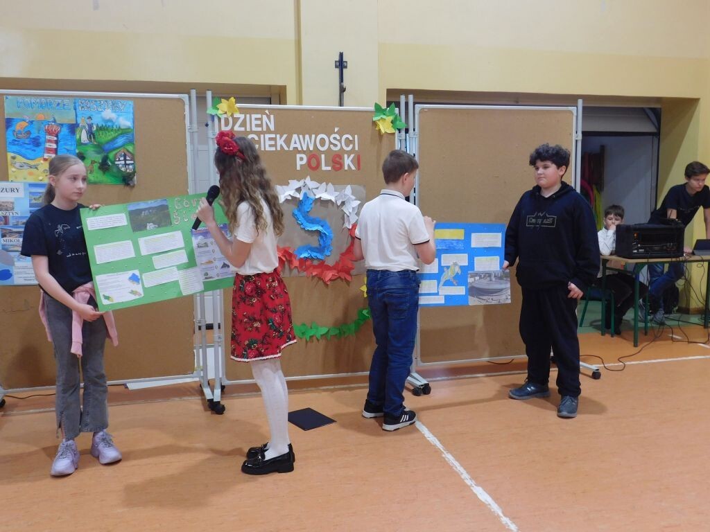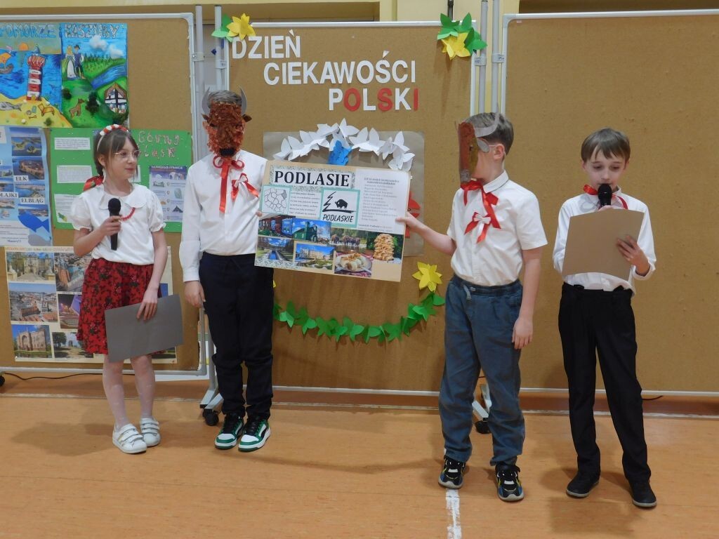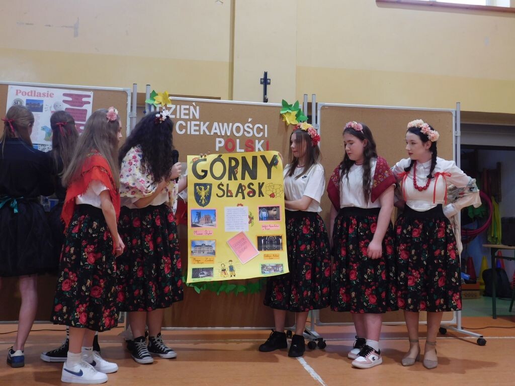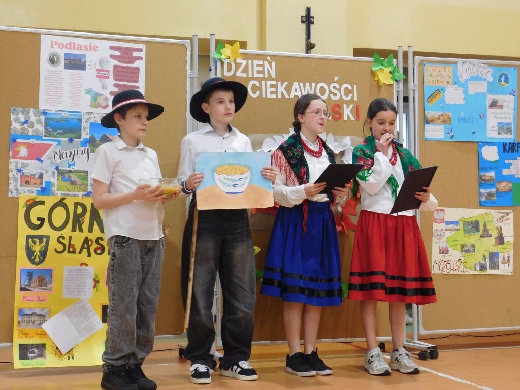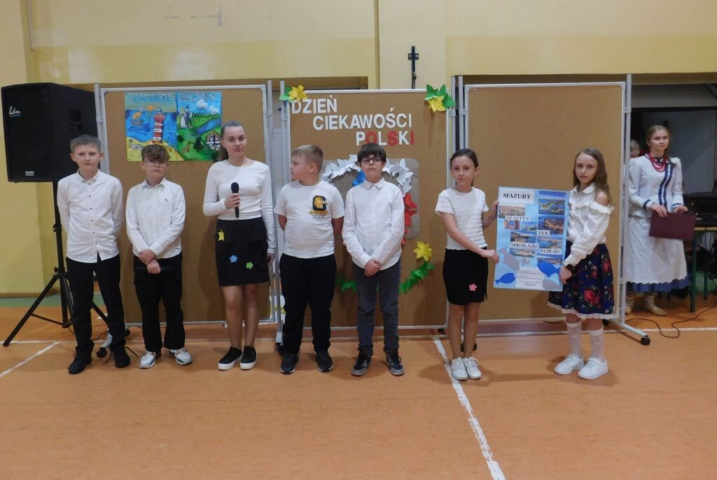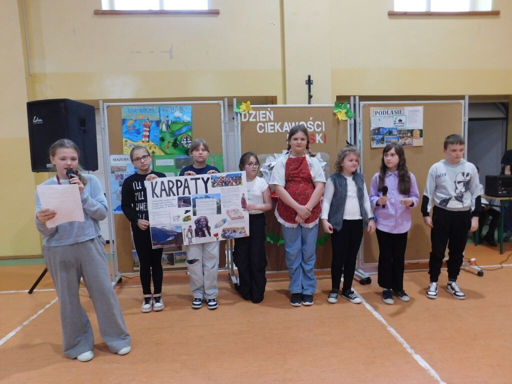 16 kwietnia br. odbyło się w naszej szkole wydarzenie edukacyjne pod hasłem: Dzień Ciekawości Polski. Uczniowie klas IV – VII odbyli podróż po naszym kraju, odkryli i poznali atrakcje, kulturę i tradycje wylosowanych wcześniej regionów Polski. Zadaniem szósto i siódmoklasistów było przygotowanie dla wylosowanego regionu plakatu będącego reklamą turystyczną, wiersza o wylosowanym regionie, zaprezentowanie charakterystycznej potrawy oraz polskiego tańca. Przedstawiciele klas uczestniczyli też w quizie o Polsce oraz w konkurencji sportowej. Klasy czwarte i piąte przygotowały dla wylosowanego regionu plakat będący reklamą turystyczną, wiersz o regionie, wybraną legendę oraz polski taniec (oberek, trojak, polonez, kujawiak, mazur, krakowiak, taniec góralski), uczestniczyli też w konkurencji sportowej.