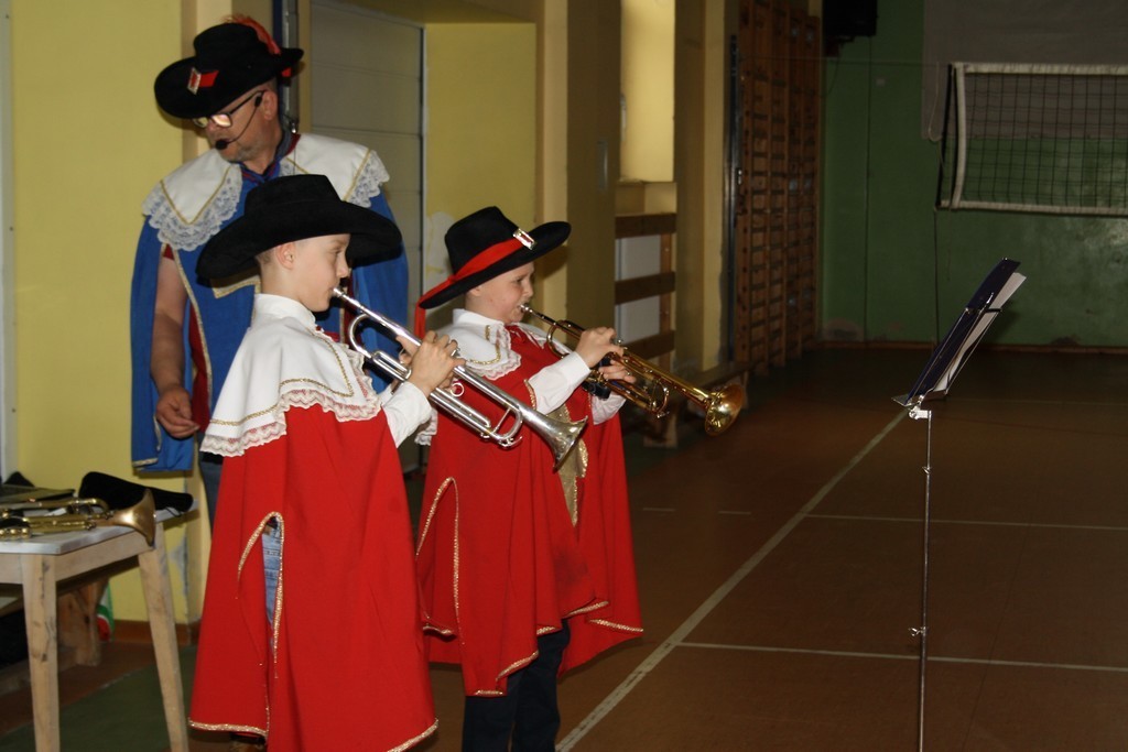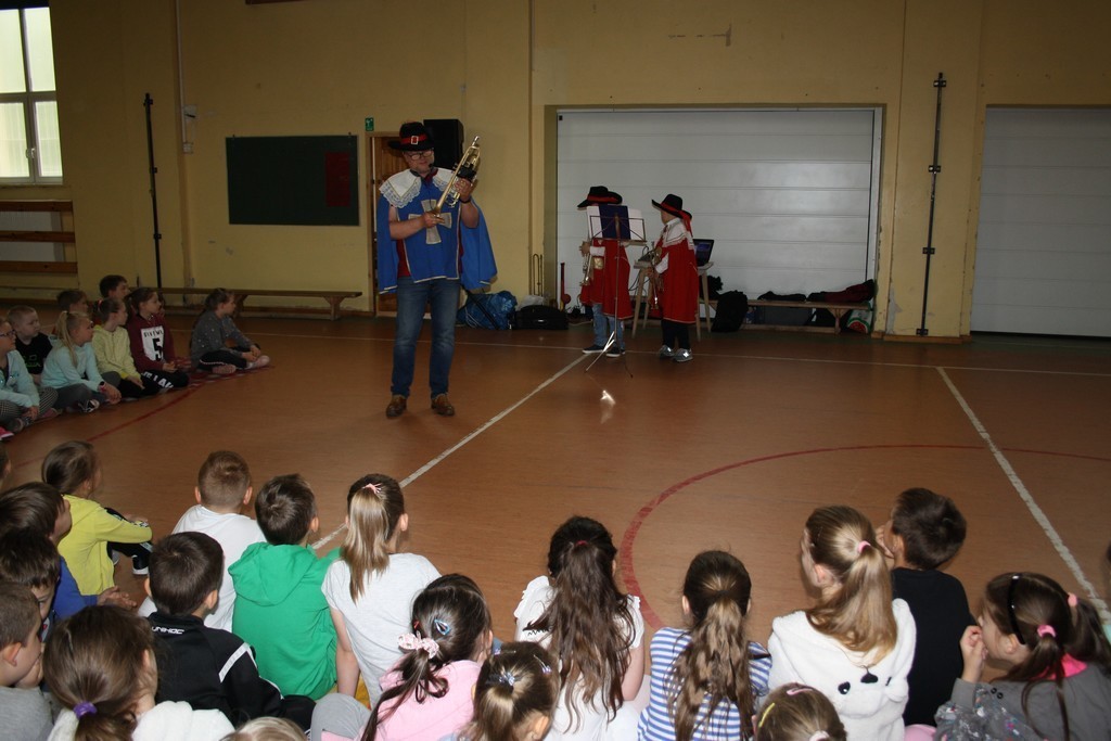 W miniony piątek obchodziliśmy w naszej szkole święto wszystkich dzieci. Młodsi uczniowie mieli okazję uczestniczenia w koncercie gry na trąbce w wykonaniu uczniów ze Szkoły Muzycznej pod kierunkiem pana Mirosława Pawlaka. Dzieci poznały różne rodzaje trąbek, mogły zagrać na tym instrumencie. Jednak najbardziej przypadła im do gustu zabawa w dyrygenta.