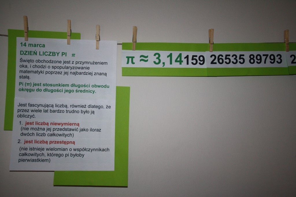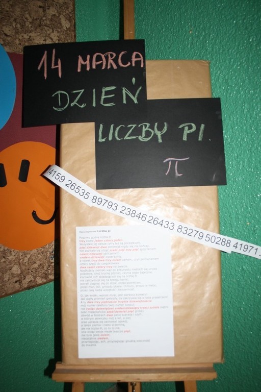 W naszej szkole również pojawił się akcent związany z Liczbą Pi – w holu pojawiły się informacje dotyczące tego tematu zaś zadaniem zespołów klasowych było ułożenie wierszy zawierających tyle liter, ile zawierają poszczególne cyfry liczby Pi.