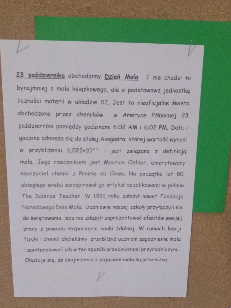 Dzień Mola został zapoczątkowany w artykule z The Science Teacher we wczesnych latach osiemdziesiątych. Maurice Oehler (aktualnie emerytowany nauczyciel ze szkoły średniej w Prairie du Chien w stanie Wisconsin) zainspirowany artykułem z 15 maja 1991 roku założył Narodową Fundację Dnia Mola (ang. National Mole Day Foundation (NMDF)). My traktujemy to jako ciekawostkę naukową. Poszerzamy horyzonty….