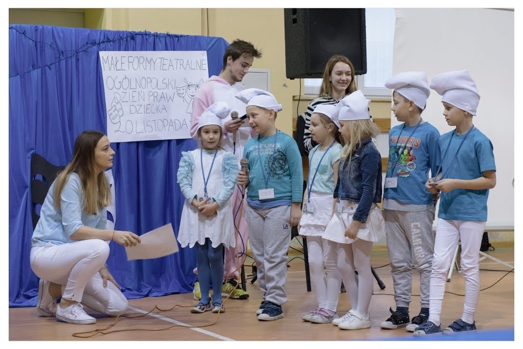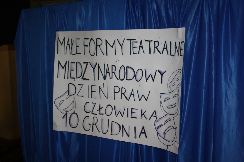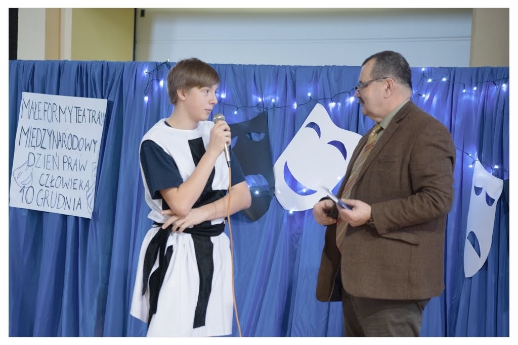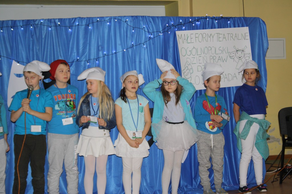 Na drugiej, czwartej i piątej godzinie lekcyjnej odbyły się Małe Formy Teatralne. Klasa IB na każdym spotkaniu z uczniami prezentowała wiersz o prawach dziecka a w czasie obrad jury śpiewała piosenkę także o prawach dziecka. Nasze maluchy wzruszały wszystkich swoim zaangażowaniem i radością. Natomiast na trzeciej godzinie przebrani uczniowie spotkali się z Płk Krzysztofem Olkowiczem - głównym koordynatorem do spraw ochrony zdrowia psychicznego w Biurze RPO. Pan Olkowicz mówił o Konstytucji RP, prawach człowieka i wielu innych bardzo ważnych w tym temacie kwestiach.