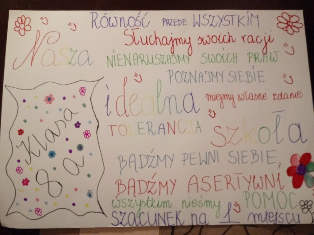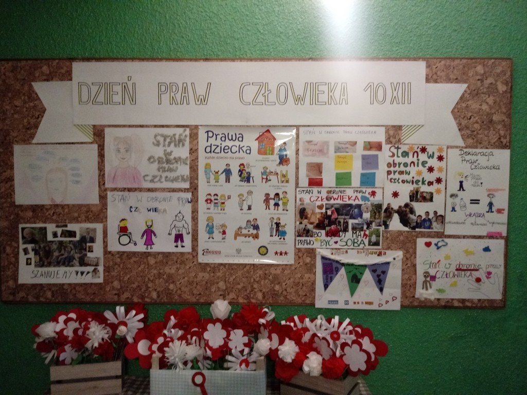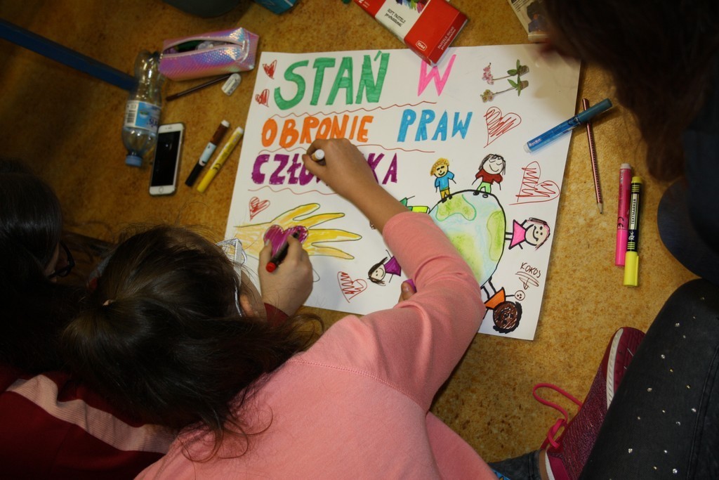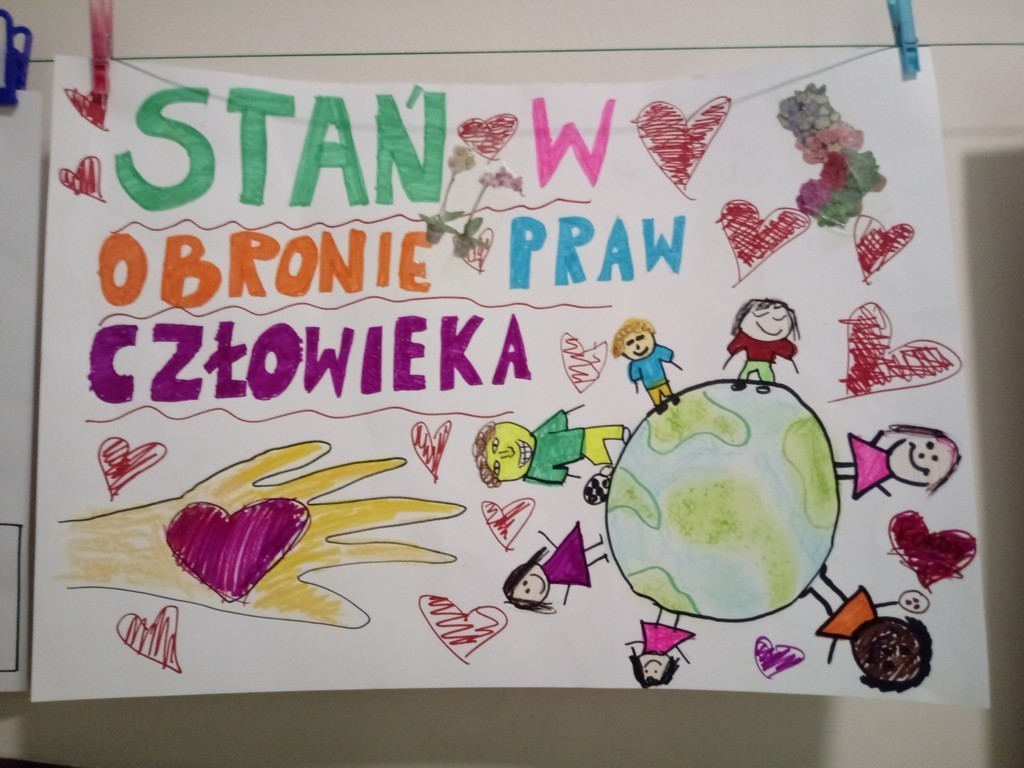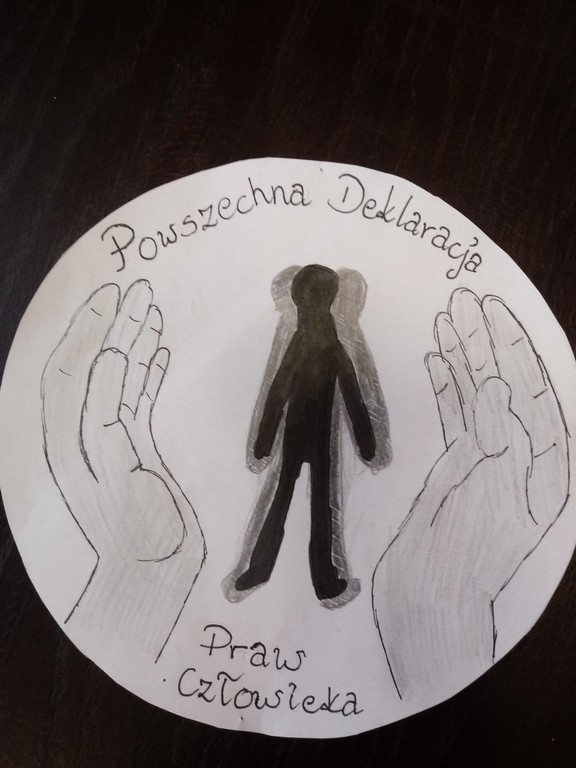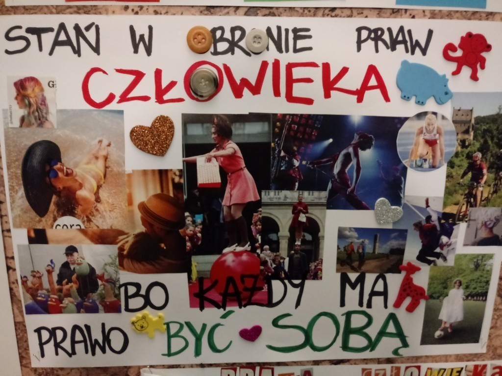 Podczas godzin wychowawczych, przeprowadzili warsztaty. Poprosili o wykonanie 6 zadań grupowych. Pierwsze polegało na zapoznaniu się z Powszechną Deklaracją Praw Człowieka, a następnie zilustrowanie jej. Kolejna grupa tworzyła rysunek pod hasłem „Ochrona Praw Człowieka”, po zapoznaniu się z informacjami na ten temat. Następna grupa zapoznawała się z biografią Ireny Sendlerowej oraz otrzymywała fragment książki „Listy w butelce” autorstwa Anny Czerwińskiej-Rydel. Zadaniem uczniów i uczennic było wykonać komiks na bazie otrzymanego tekstu. Kolejne grupy kolejno pisały list w ramach Maratonu Pisania Listów, tworzyły kolaż pod hasłem towarzyszącym obchodom powstania Deklaracji, kreowały obraz naszej idealnej szkoły. Podczas przerw zaprosiliśmy także do udziału w konkursie wiedzowym na temat Deklaracji Praw Człowieka. Wszystkie prace zostały ocenione przez uczniów i uczennice z klasy VIIIB.