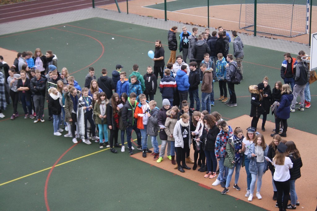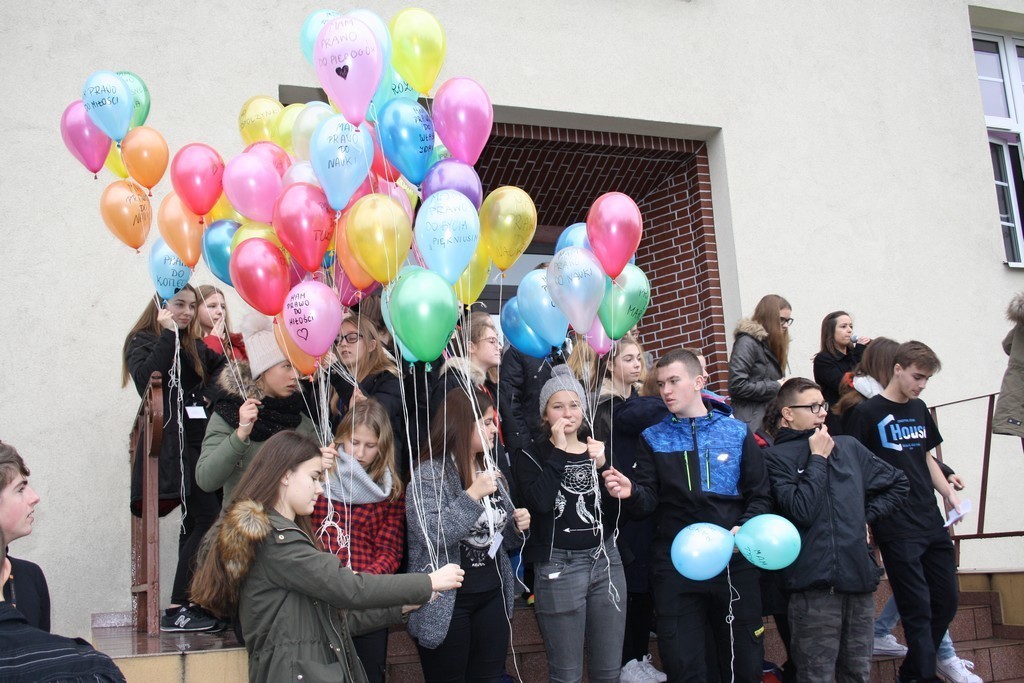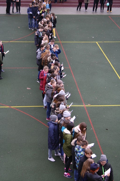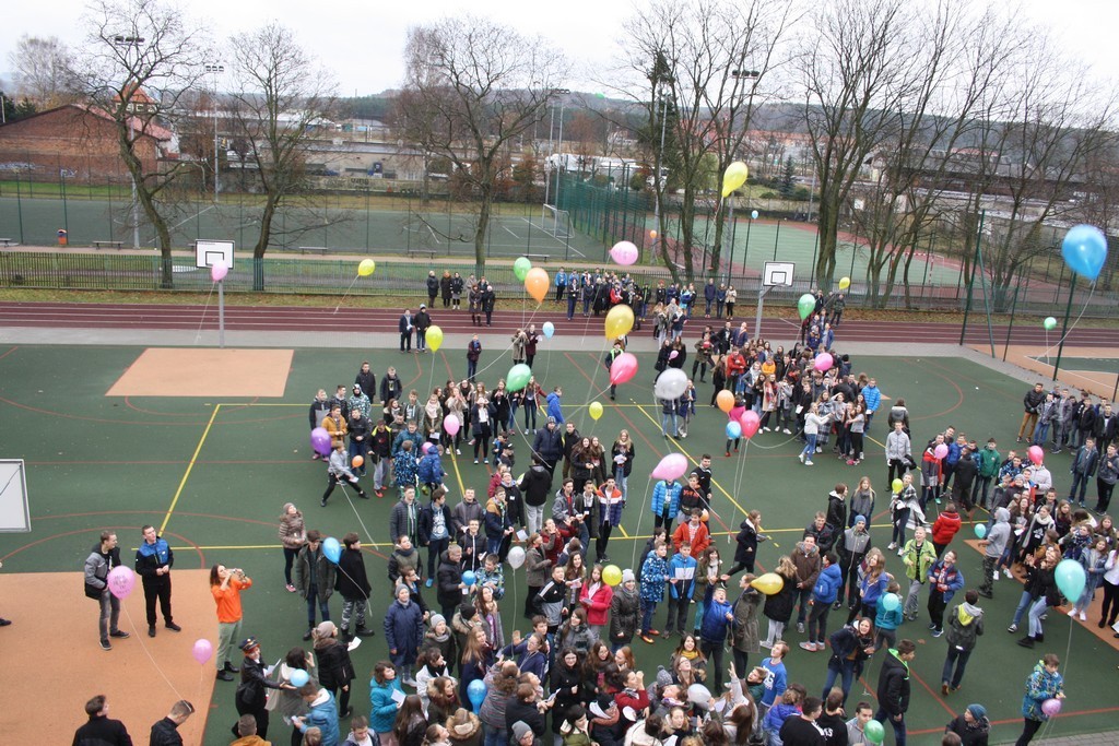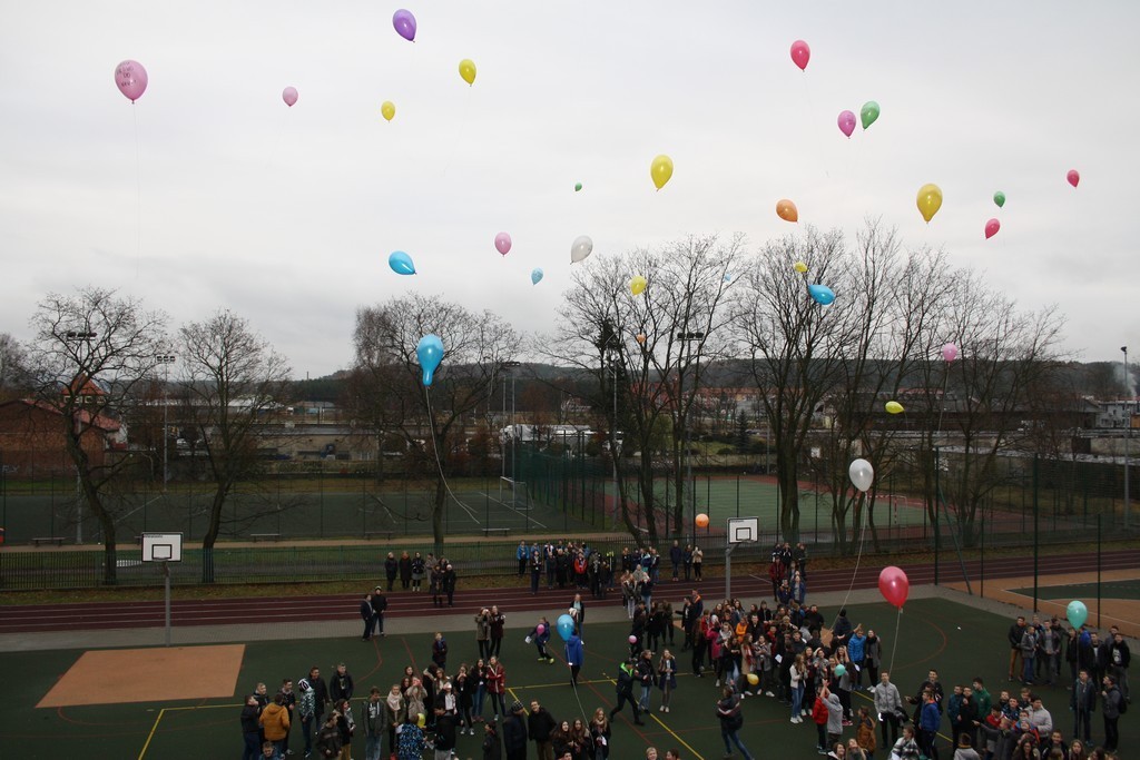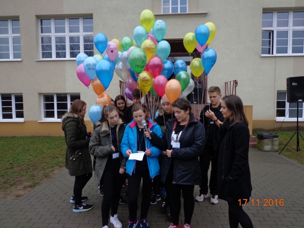 O godz. 13.00 wyruszył w trasę pociąg prowadzony przez obie panie dyrektor i wszystkie „wagony” spotkały się na boisku szkolnym. Cała społeczność szkolna odczytała wspólnie prawa dziecka, a do nieba poleciało sto zapisanych tymi prawami balonów.