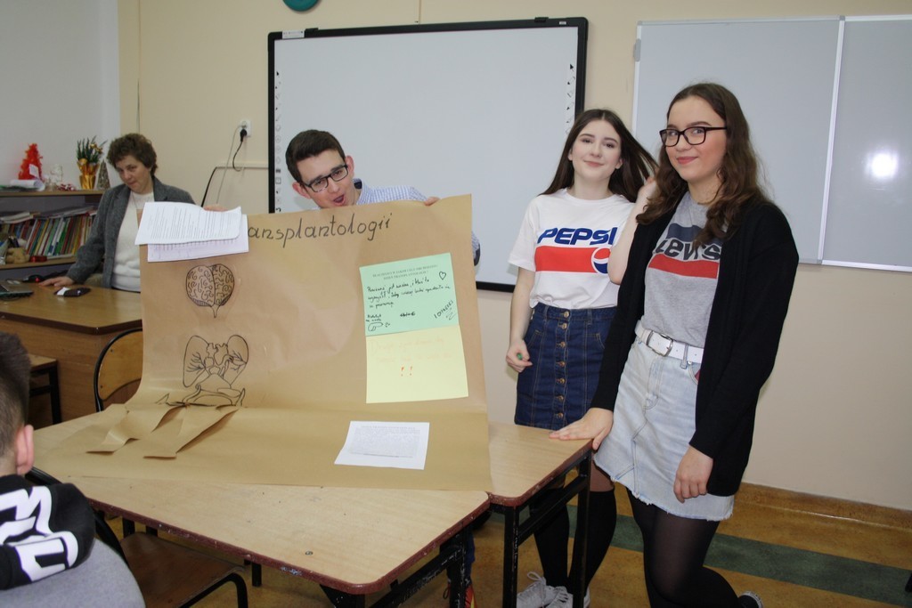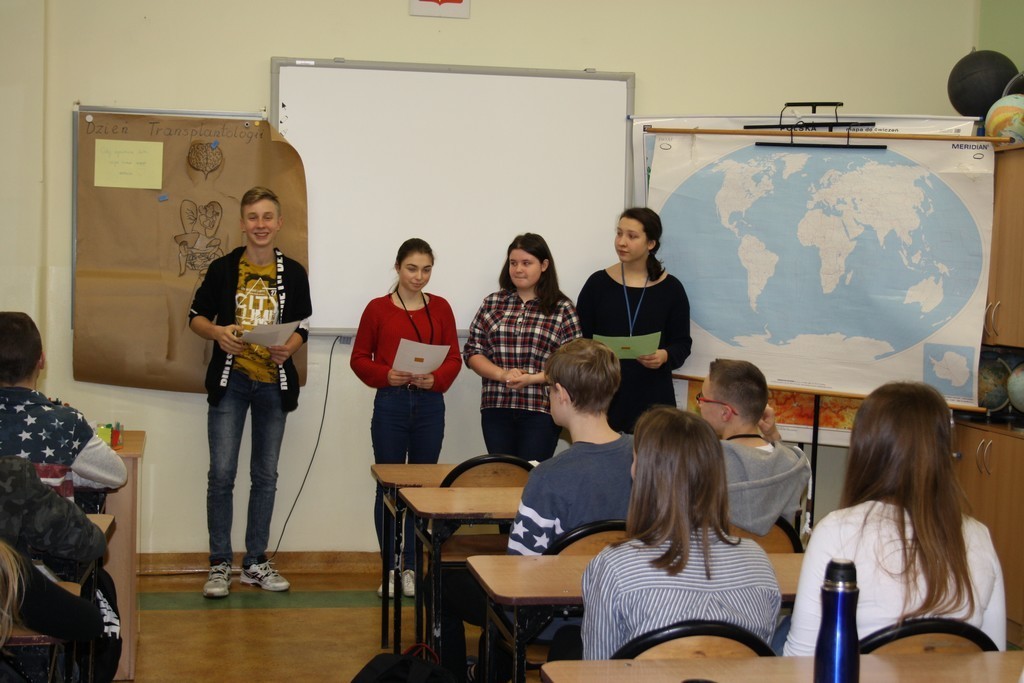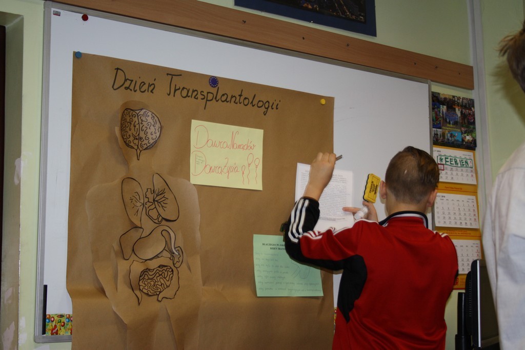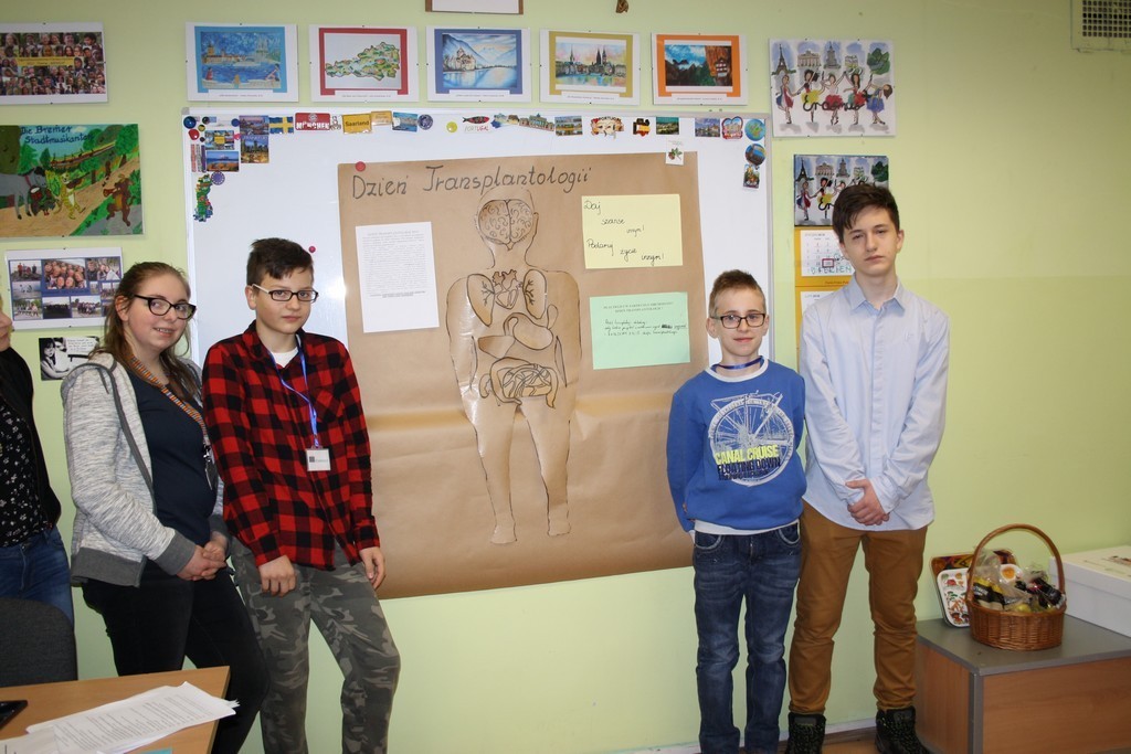 Uczniowie klasy IIId przygotowali na ten temat lekcję wychowawczą i poprowadzili ją w pozostałych zespołach klasowych. Przekazali swoim kolegom podstawowe informacje z zakresu transplantologii, zaprezentowali filmiki na temat przeszczepów a także poprowadzili prace w zespołach. Zadaniem każdej z czterech grup było wykonanie określonych zadań: uzupełnienie tekstu informacjami zdobytymi podczas lekcji, ułożenie hasła propagującego podjęcie decyzji dotyczącej zgody na oddawanie organów do przeszczepu, udzielenie odpowiedzi na pytanie: dlaczego i w jakim celu obchodzimy Dzień Transplantologii oraz sporządzenie schematu postaci z przyporządkowaniem organów, które nadają się do zabiegu przeszczepienia.