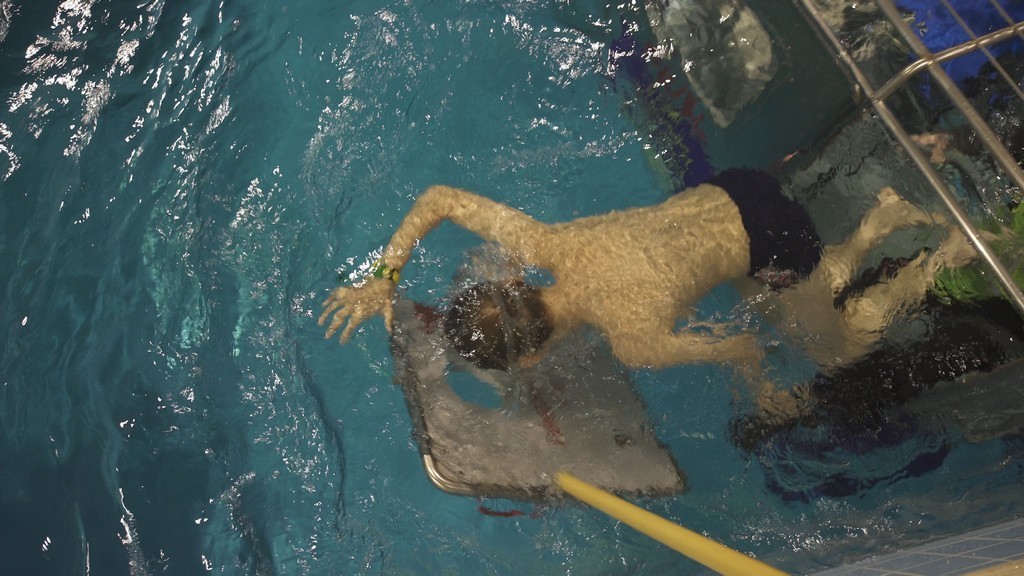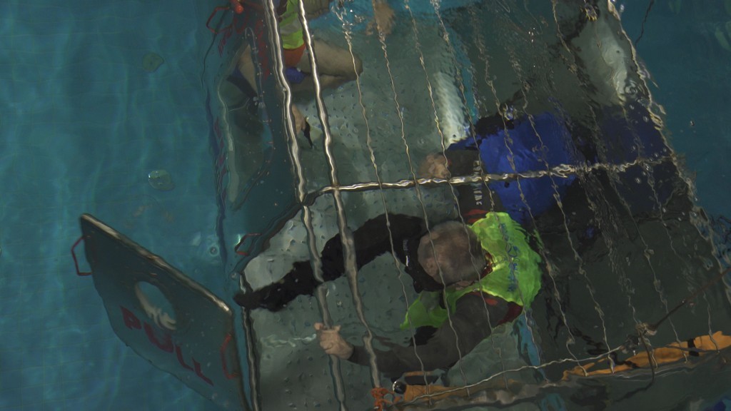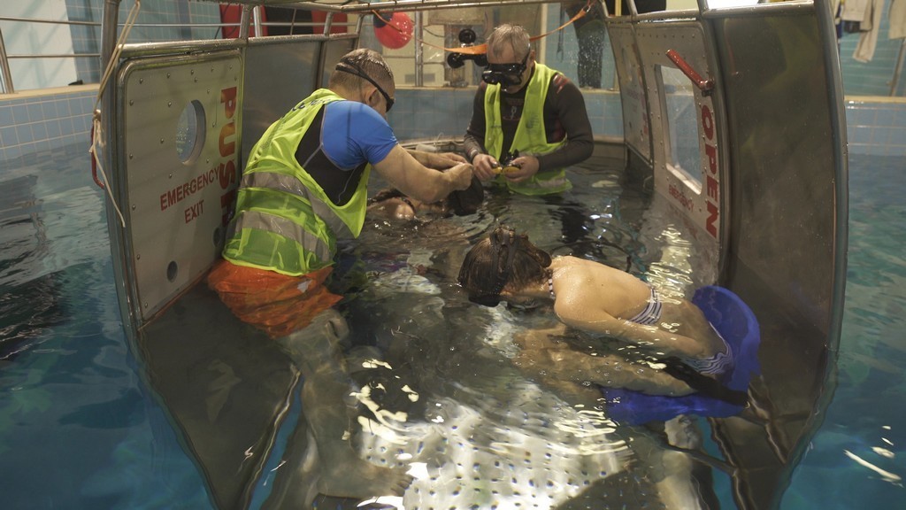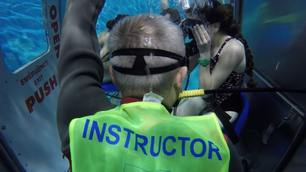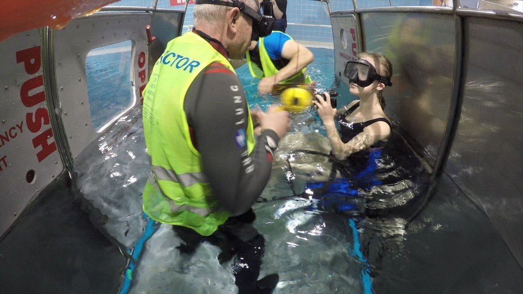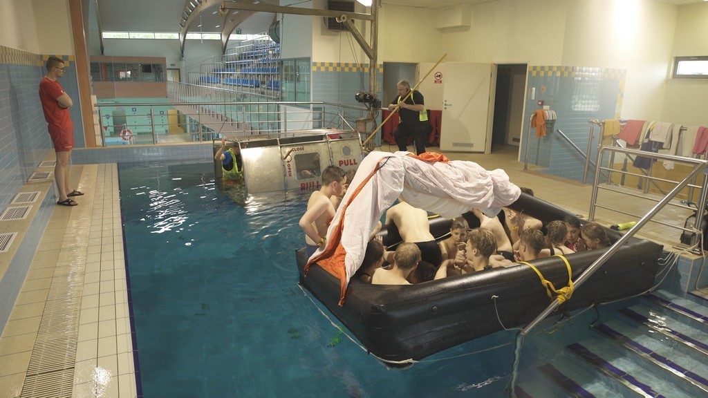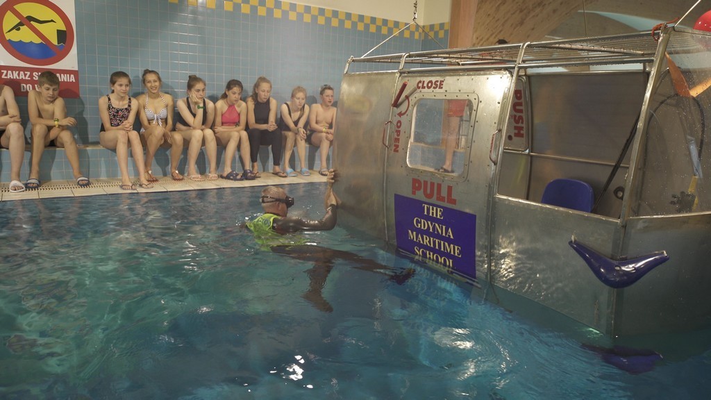 Wszyscy mieli pozytywne nastroje. Po przebraniu się w stroje kąpielowe i zebraniu się przy basenie, wytłumaczono nam, że będziemy uczestniczyć w symulacji tonącego śmigłowca. Najważniejsze było uważne słuchanie, dyscyplina i wykonywanie poleceń. Zapoznaliśmy się z zasadami i gestami stosowanymi podczas symulacji. Nauczyliśmy się oddychać przy użyciu butli z tlenem. Dobraliśmy się w pary i po założeniu masek oraz zapięciu się pasem w symulatorze naszym zadaniem było wykonanie kilku zadań. Musieliśmy wytrzymać chwilę pod wodą, wypchnąć klapę symulatora po czym wypłynąć na powierzchnię i dopłynąć do tratwy ratunkowej.