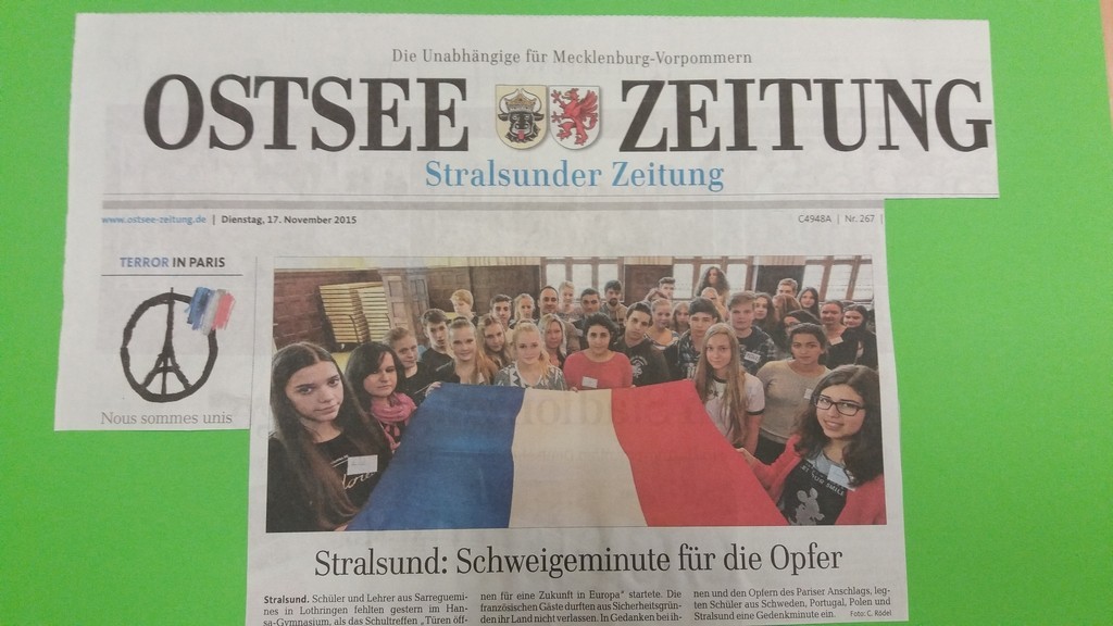 W poprzednim tygodniu (15-21.11.2015r.) uczniowie Gimnazjum nr 1 uczestniczyli w międzynarodowym spotkaniu programu Erasmus+ w ramach realizacji projektu: „Opening doors to Europe”. Szkoła, która jako pierwsza gościła wszystkich uczestników projektu - to Hansa-Gymnasium w Stralsundzie. Nasi uczniowie wraz z kolegami i koleżankami z Niemiec, Szwecji i Portugalii poznawali zabytki i kulturę regionu, a także zasady panujące w niemieckiej szkole. W związku z tragicznymi wydarzeniami we Francji, uczniowie tego państwa nie uczestniczyli osobiście w projekcie, jednak dzięki nowoczesnym technologiom (skype) mogli również brać udział w zaplanowanych działaniach.