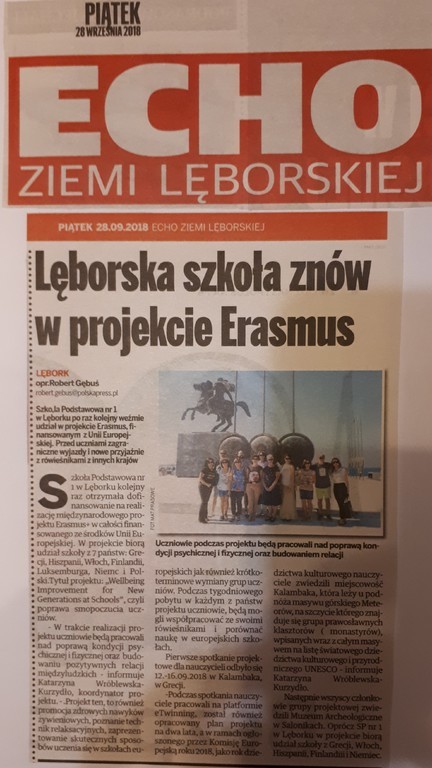 Pierwsze spotkanie w ramach naszego projektu Erasmus+ „Wellbeing Improvement for New Generations at Schools”( czyli poprawa smopoczucia uczniów), odbyło się w dniach 12-16.09.2018r. w Kalambaka, w Grecji.