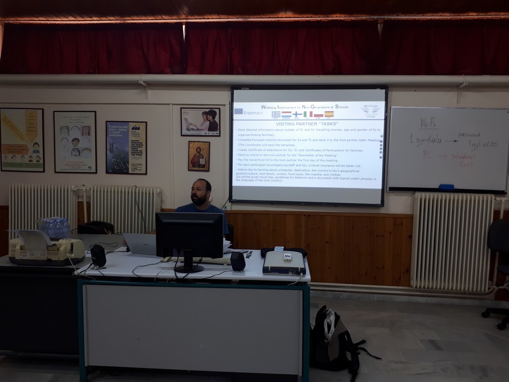 W spotkaniu wzięli udział nauczyciele: pani Katarzyna Wróblewska Kurzydło - koordynator projektu oraz pani Izabela Lipowska. Podczas spotkania nauczyciele pracowali na platformie eTwinning, opracowali również plan projektu na dwa lata. W ramach ogłoszonego przez Komisję Europejską roku 2018, rokiem dziedzictwa kulturowego - nauczyciele zwiedzili miejscowość Kalambaka. Usytuowana jest ona u podnóża masywu górskiego Meteorów, na szczycie którego znajduje się grupa prawosławnych klasztorów (monastyrów), wpisanych wraz z całym masywem na listę światowego dziedzictwa kulturowego i przyrodniczego UNESCO. Następnie członkowie grupy projektowej zwiedzili Muzeum Archeologiczne w Salonikach.