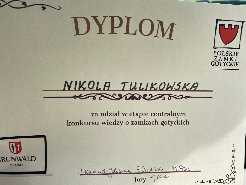 Nikola Tulikowska z klasy 5c reprezentowała naszą gminę w etapie centralnym konkursu wiedzy o zamkach gotyckich. Konkurs polegał na rozwiązaniu dość trudnego testu. Nikola - nasza piątoklasistka zbiera kolejne szlify do następnych zmagań. Pani Izabela Narożniak (organizator) podkreśliła, że konkurs stał na wysokim poziomie i zaszczytem jest znaleźć się w ścisłym finale.