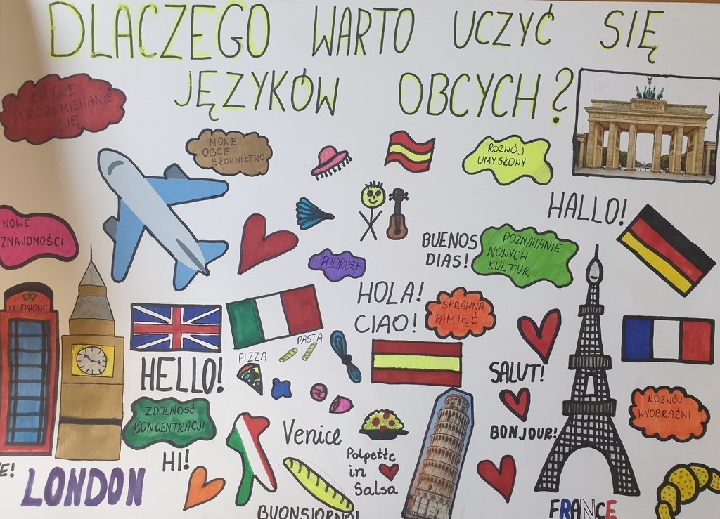 26.09.2019 obchodziliśmy Europejski Dzień Języków. Uczniowie klasy 7a przygotowali dla każdej klasy informacje na temat tego szczególnego dnia oraz mały quiz muzyczny. Klasy ósme wykonywały plakaty tematycznie związane z Europejskim Dniem Języków.
