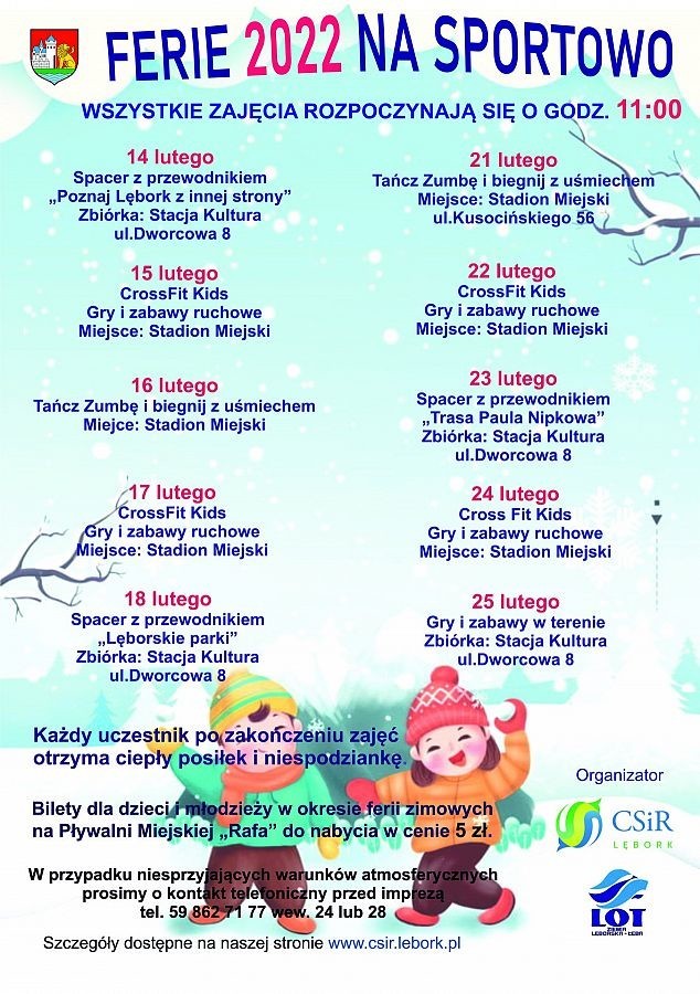 Poniżej zamieszczony jest również plakat dotyczący FERII 2022 NA SPORTOWO organizowanych przez CSiR Lębork oraz LOT Ziemia Lęborska-Łeba.