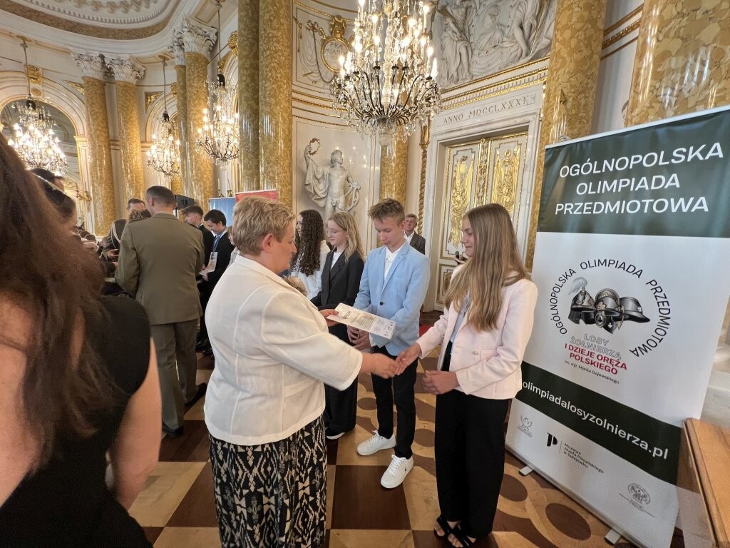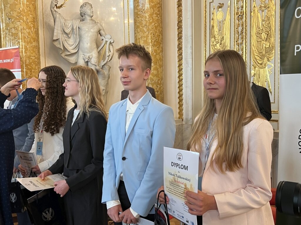 W dniach od 4-6 czerwca br. odbył się etap centralny konkursu historycznego: „Od traktatu ryskiego do żołnierzy niezłomnych w latach 1921-1956”. W tym roku konkurs zorganizowano w ramach obchodzonego jubileuszu XXX-lecia konkursu. Naszą szkołę i województwo pomorskie reprezentowali Nikola Tulikowska z klasy VIc i Tymoteusz Jelonek z VIIIb. Zmagania konkursowe trwały dwa dni. Rozpoczęły się w Muzeum Powstania Warszawskiego, gdzie miała miejsce ceremonia otwarcia. Uczniowie od razu przystąpili do rywalizacji w konkursie. Drugi dzień konkursu odbywał się w Sulejówku – dworku, w którym Józef Piłsudski mieszkał wraz z rodziną. Uczniowie zwiedzili znajdujące się tu multimedialne muzeum oraz dworek. Po trudach zmagań konkursowych była też okazja do zwiedzenia Warszawy. Uroczysta gala odbyła się ostatniego dnia na Zamku Królewskim w Warszawie. Wcześniej wszyscy uczestnicy złożyli wieńce przy Grobie Nieznanego Żołnierza. W klasyfikacji końcowej Nikola i Tymoteusz zdobyli tytuły Finalistów etapu centralnego. Kadra konkursu podkreśliła, że wszyscy mogą czuć się zwycięzcami.