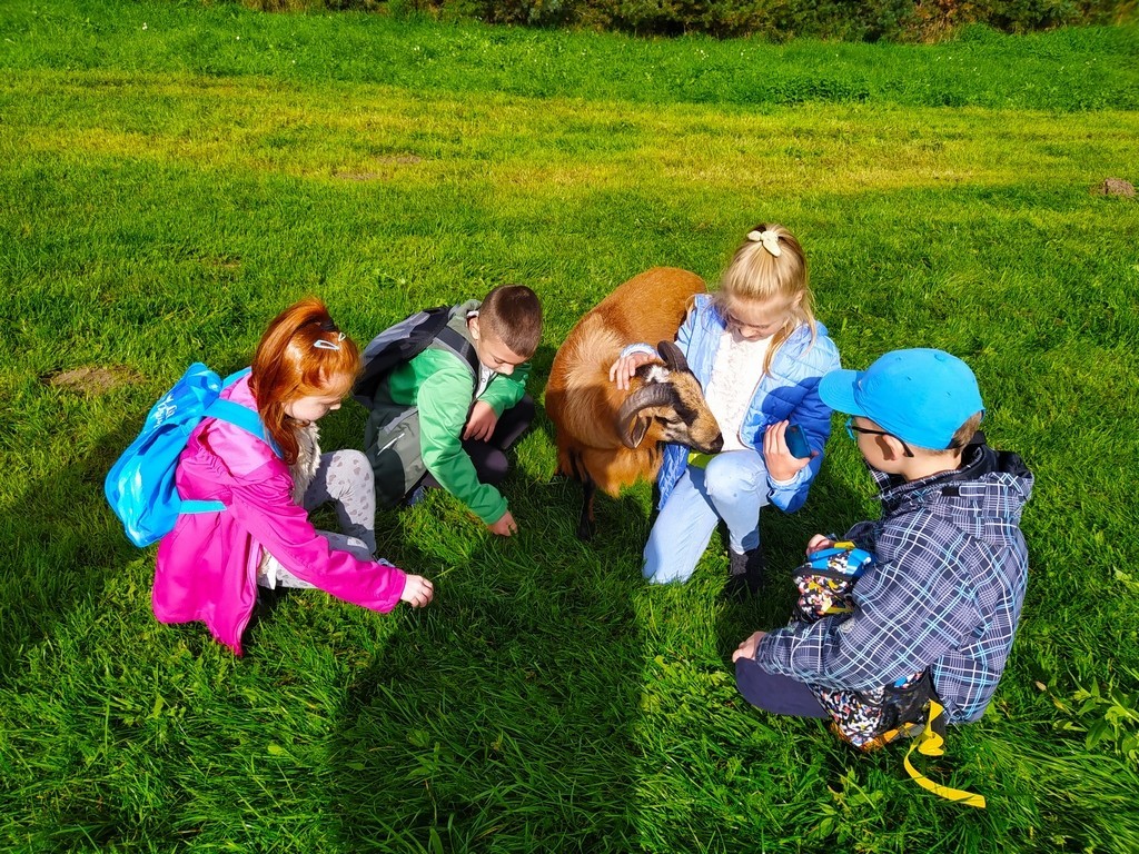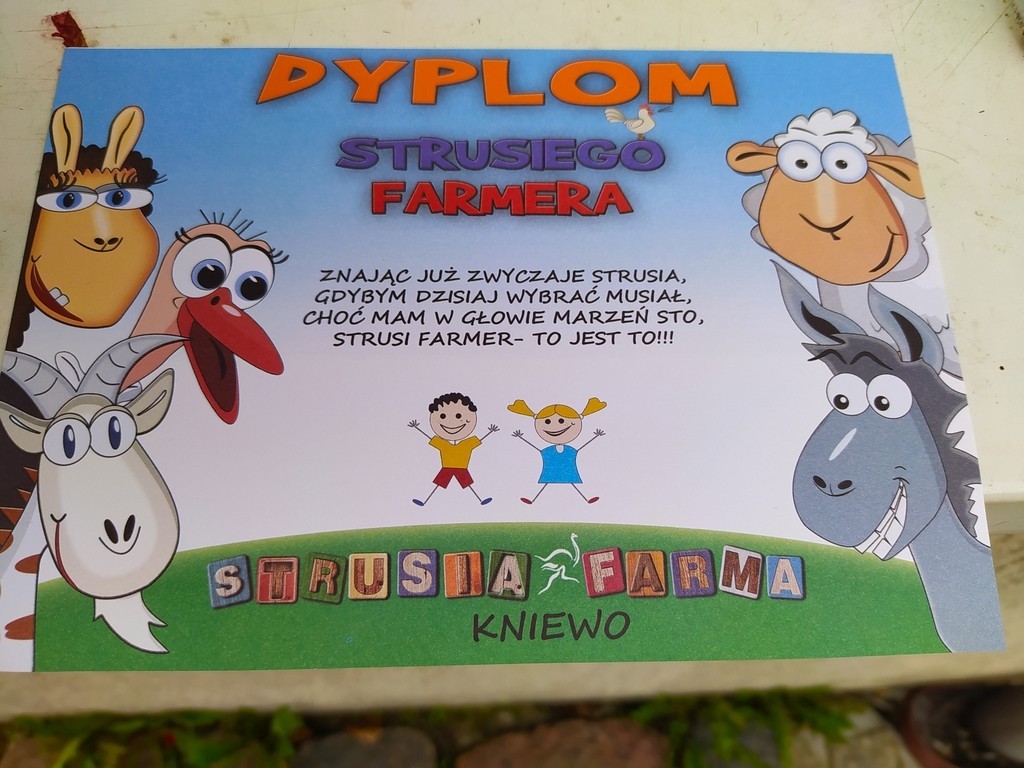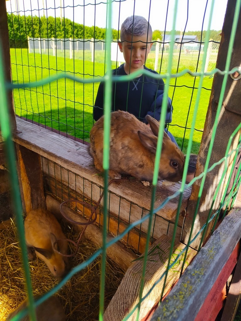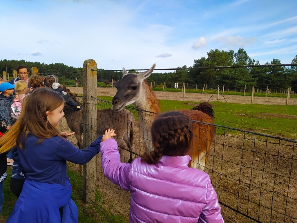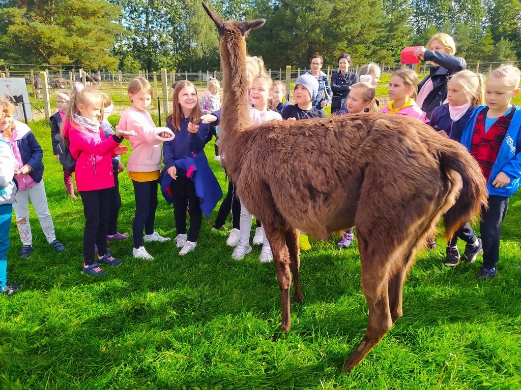 Dzieci zwiedzały farmę wraz z przewodnikiem, poznawały zwyczaje żyjących tam zwierząt. Każde z nich mogło samodzielnie nakarmić oswojonego strusia, nandu, kozę, baranka, lamę, królika, koguta chińskiego czy konia Kacperka. Pani przewodnik opowiadała bardzo ciekawe historie o mieszkańcach farmy, a uczniowie słuchali i zadawali pytania. Mogli wziąć udział w konkursach: wiedzy o farmie oraz torze przeszkód ze strusim jajem. Dużą atrakcją okazał się przejazd konną bryczką wokół posiadłości. Dopełnieniem wycieczki było upieczenie kiełbaski przy ognisku. Ta niecodzienna lekcja w terenie dostarczyła dzieciom wielu wrażeń i na pewno warto ją powtórzyć!