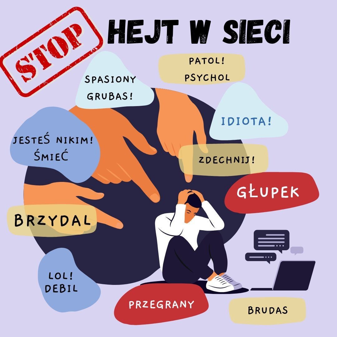 Hejtem określamy wszystkie negatywne i agresywne wypowiedzi internautów, również te przedstawione w formie memów, obrazków, gifów czy filmików, których celem jest oczernianie, ośmieszanie i poniżanie innych osób. Hejt (z ang. hate – nienawidzić) może dotknąć każdego, a jego skutki, podobnie jak przy innych formach cyberprzemocy, mogą być bardzo niebezpieczne dla ofiary. Niestety, pozorne poczucie anonimowości w sieci powoduje, że hejterzy często czują się bezkarni, a ich negatywne wypowiedzi mogą wywoływać u odbiorcy różne, trudne emocje, a w niektórych przypadkach wpływać na ich postawy i poglądy. W poniedziałek, 10 marca uczniowie klasy 8a uczestniczyli w spotkaniu z panią policjantką z KPP w Lęborku. Celem tych zajęć było uświadomienie uczniom , jakie są zagrożenia i konsekwencje wynikające z hejtu na portalach społecznościowych, forach internetowych czy innych komunikatorach elektronicznych. Uczniowie dowiedzieli się, co jest przyczyną hejtu, na czym on polega i jak niebezpieczne mogą być jego skutki.