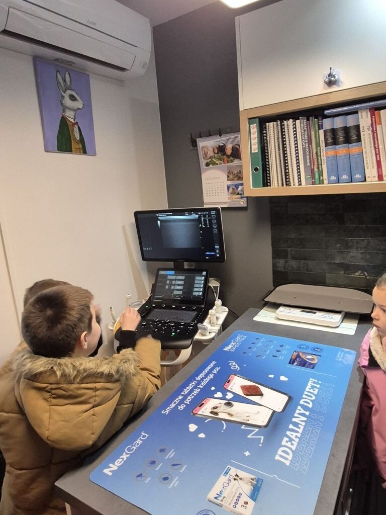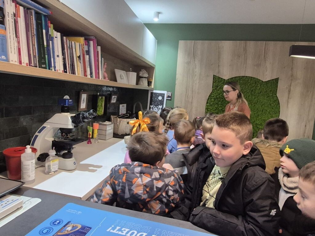 Dzieci chętnie obejrzały gabinet weterynaryjny i dowiedziały się, do czego służą znajdujące się w nich urządzenia takie jak: stetoskop, urządzenie do robienia USG, czy mikroskop do badań próbek krwi czy skóry. Serdecznie dziękujemy Pani weterynarz za ciekawą lekcję przyrody.