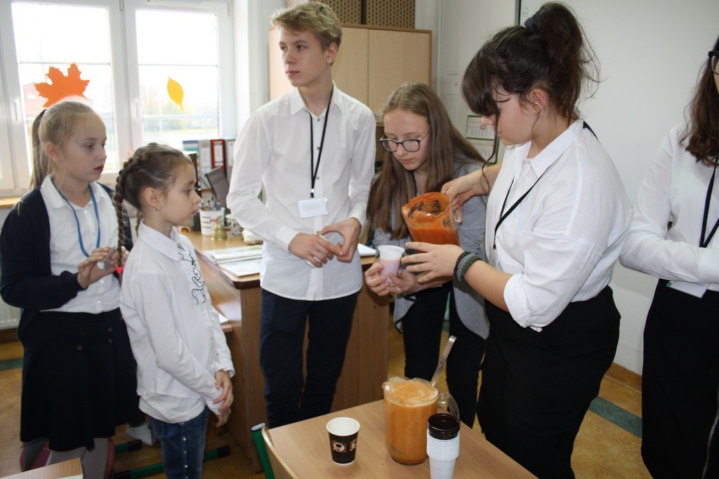 W dniu następnym podczas długich przerw Samorząd serwował pyszne soki owocowe. Dziękujemy klasom za dostarczenie warzyw i owoców. Mamy nadzieję, że wspólne posiłki uświadomią naszym wychowankom jak ważne jest śniadanie oraz odpowiednio dobrane produkty w codziennej diecie.