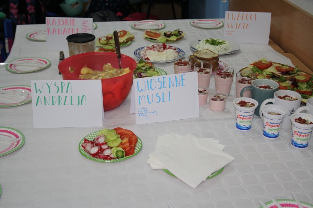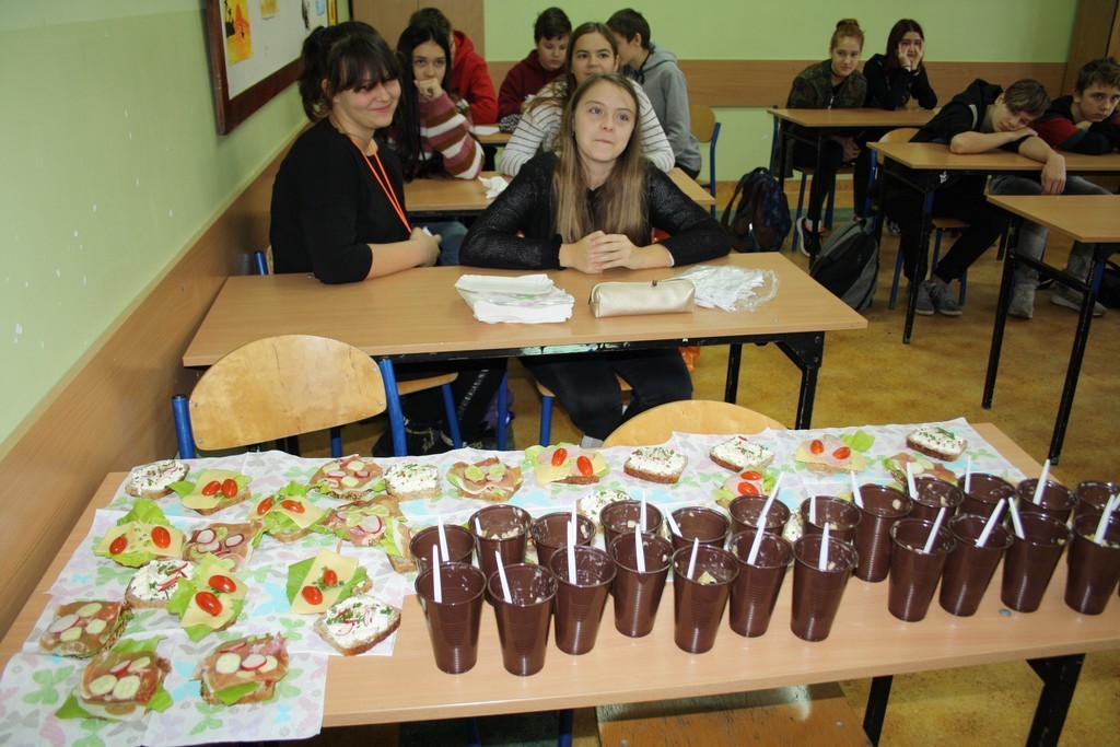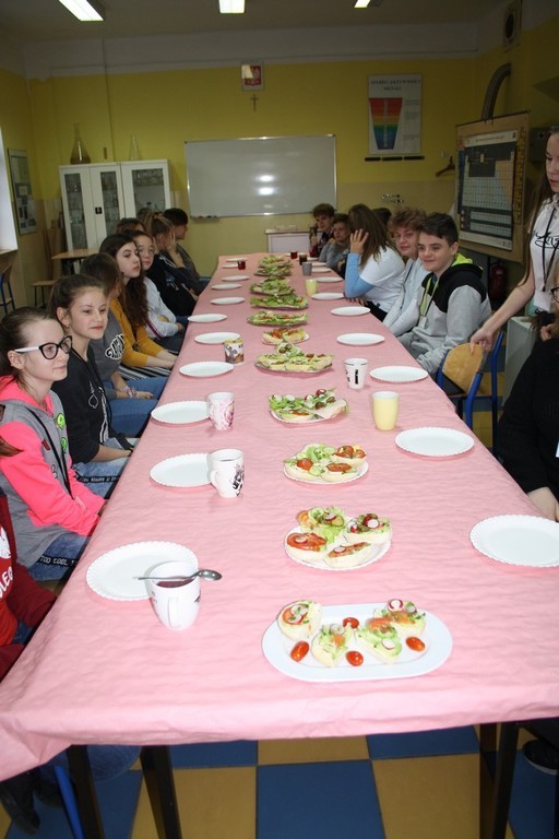 Samorząd Uczniowski postanowił zachęcić uczniów naszej szkoły, aby w tym dniu przygotowali oni zdrowe śniadanie. Okazało się, że uczniowie doskonale wiedzą jak powinno ono wyglądać. Przygotowali oni wyjątkowo apetyczne kanapki, przekąski, sałatki a nawet koktajle owocowe.