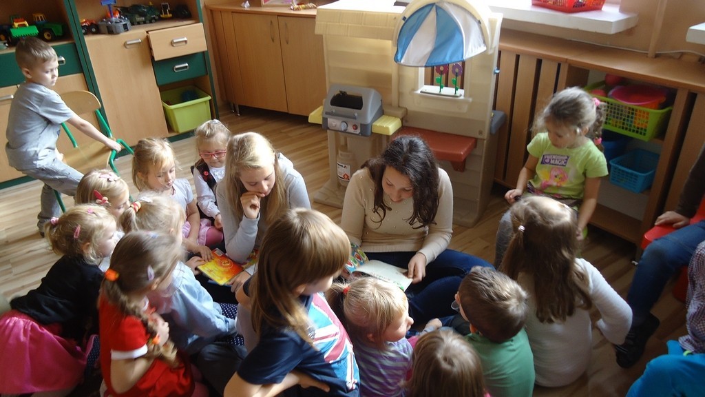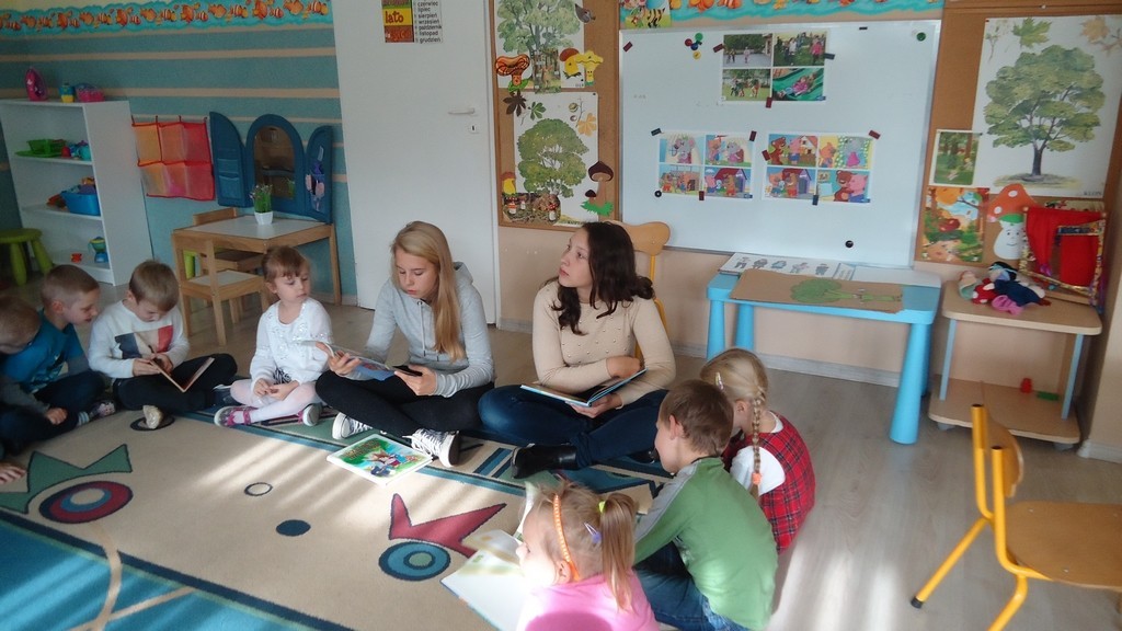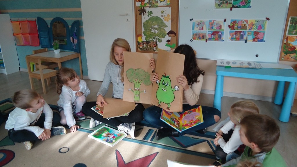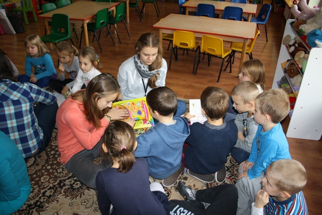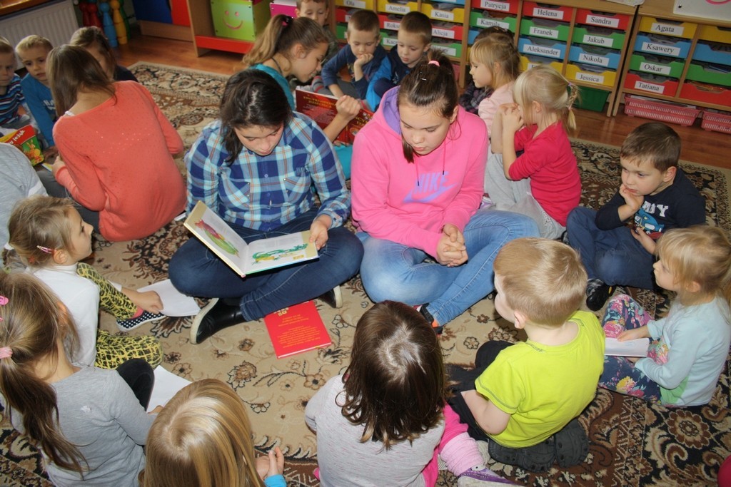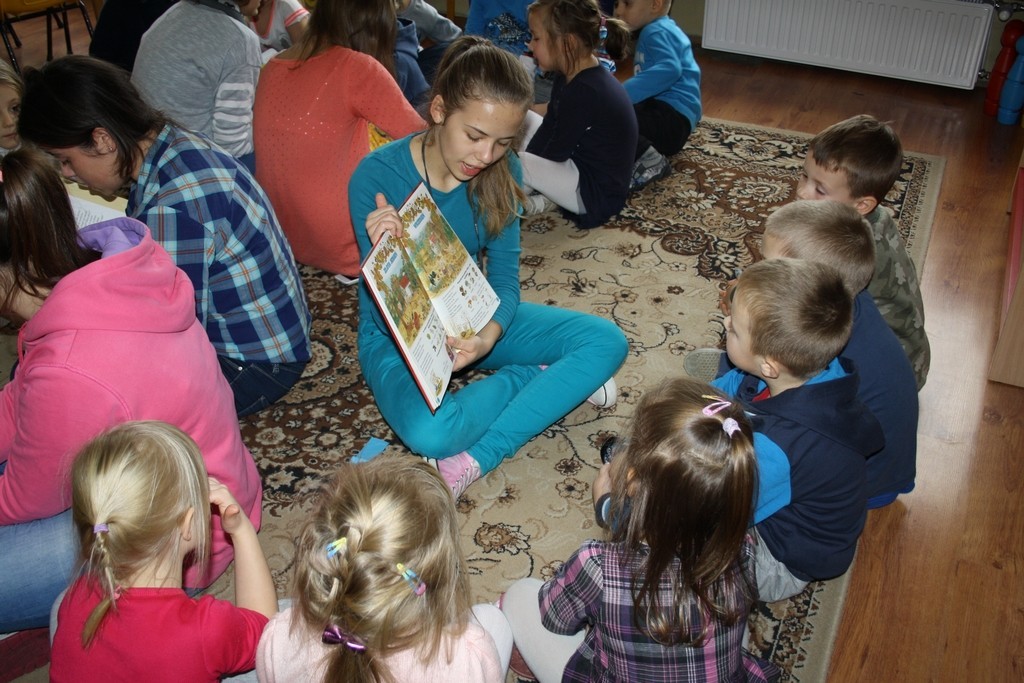 Tym razem grupa uczennic odwiedziła grupę Pszczółek i Myszek z Przedszkola nr 1 oraz grupę Biedronek z Przedszkola nr 2. W repertuarze czytelniczym dominowały przepiękne wiersze naszych wybitnych poetów Juliana Tuwima i Jana Brzechwy dotyczące jesieni i jej darów. Przedszkolaki z przyjemnością wysłuchały utworów i aktywnie włączyły się do zabaw przygotowanych przez ich starsze koleżanki z gimnazjum.