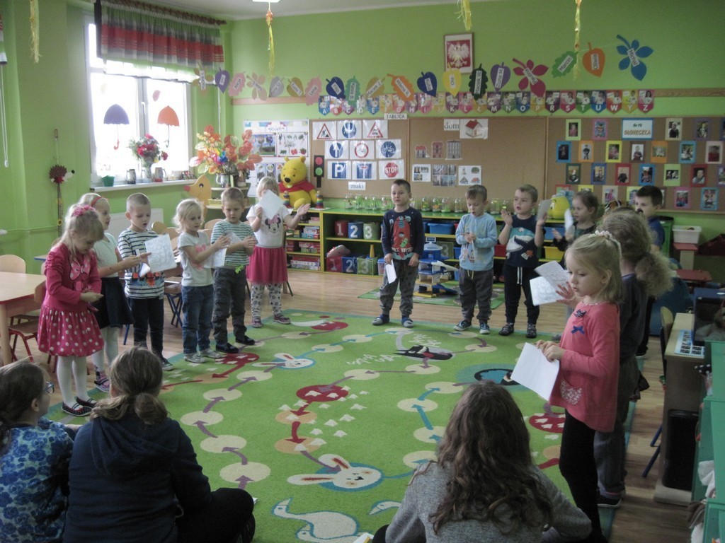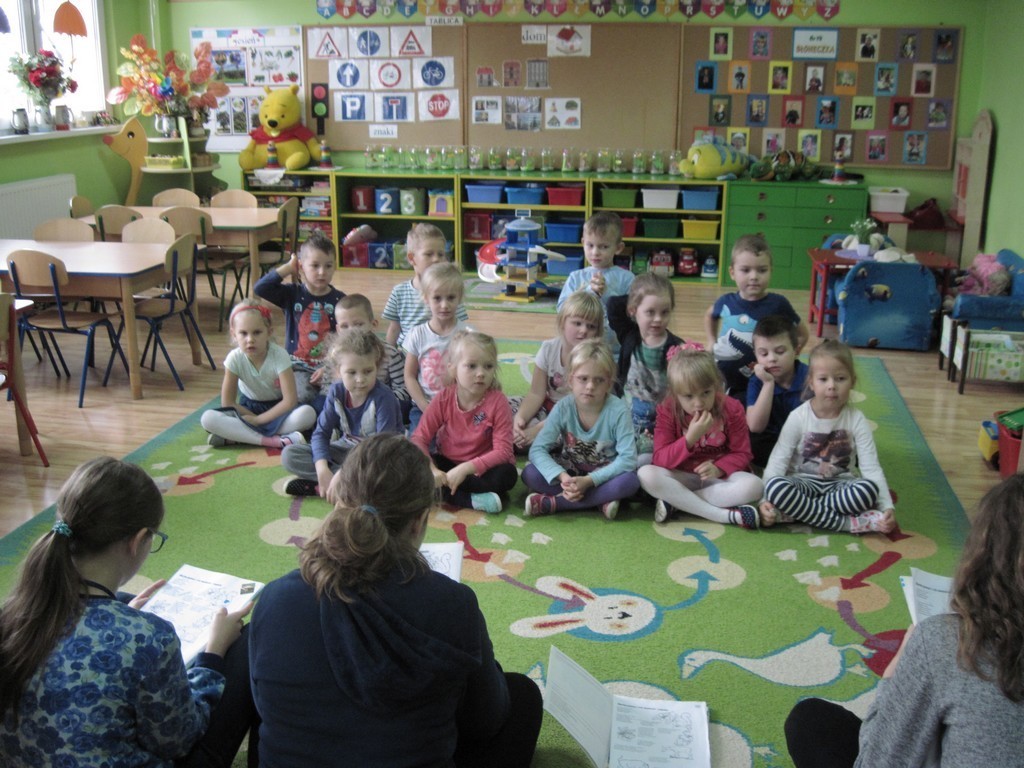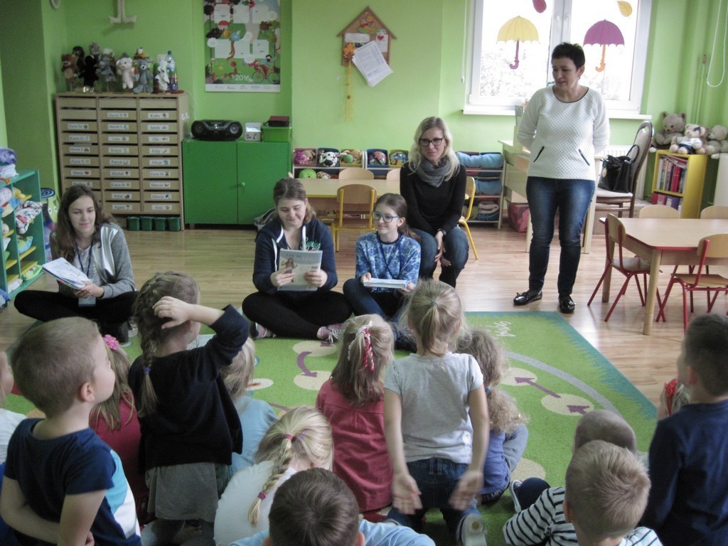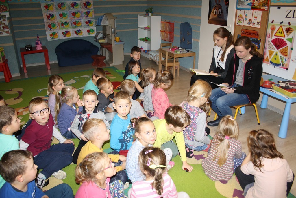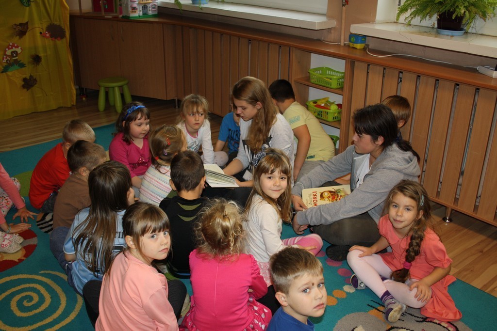 27 października dziewczęta z klasy IIb odwiedziły "Pszczółki" i "Myszki" z Przedszkola nr 1, zaś 2 listopada gimnazjalistki z Ie gościły w grupie "Słoneczek" z Przedszkola nr 2. Dzieci wysłuchały opowieści, bajek i wierszyków związanych z jesienią. Przedszkolakom szczególnie spodobały się wesołe, jesienne zagadki o zwierzętach. "Słoneczka pochwaliły się swoimi umiejętnościami wokalno-tanecznymi, prezentując piosenkę o "Pomidorku". Na zakończenie spotkania maluchy otrzymały kolorowanki.