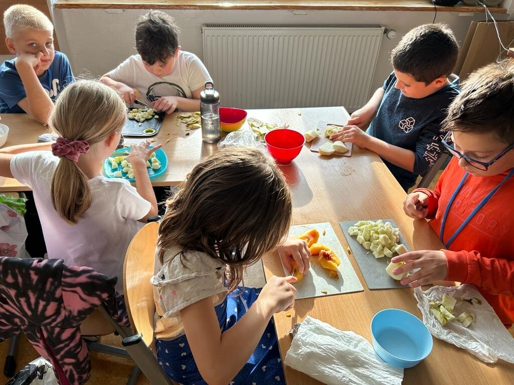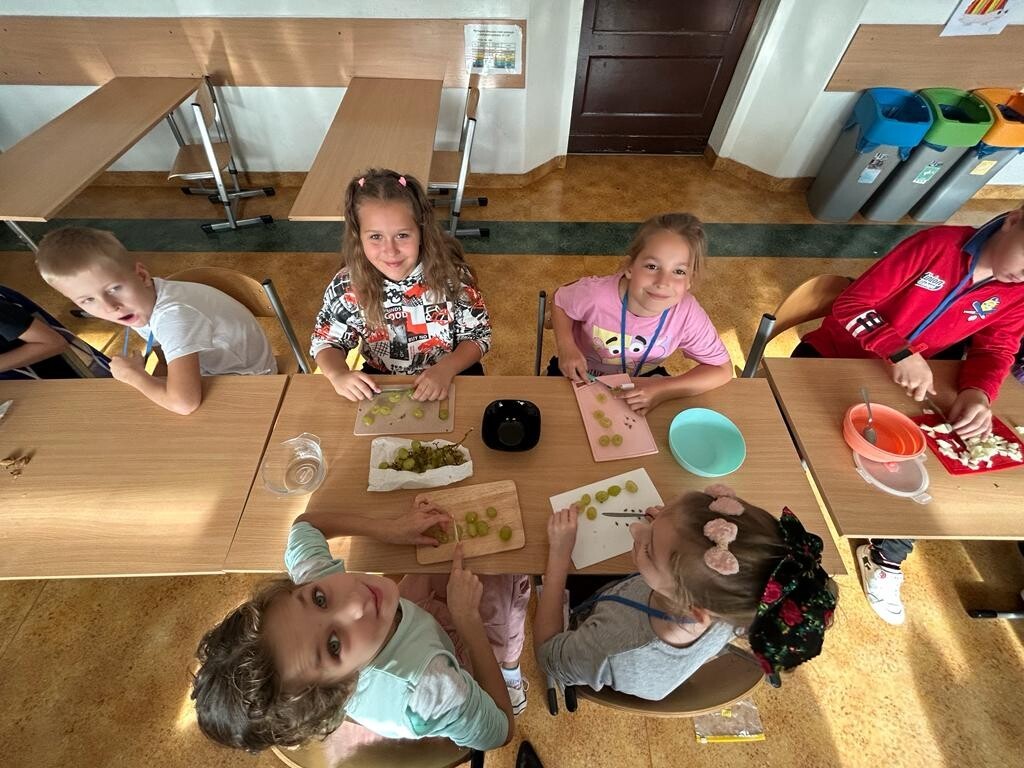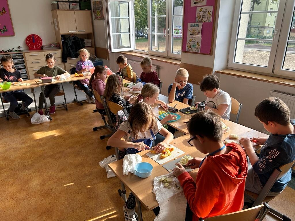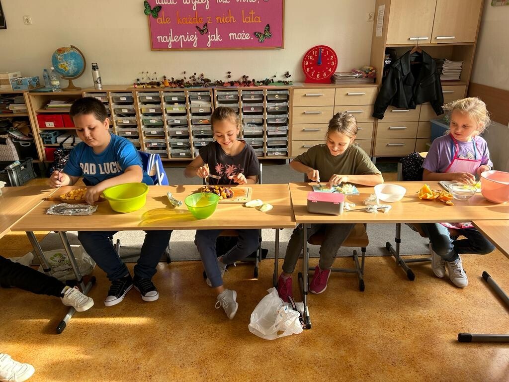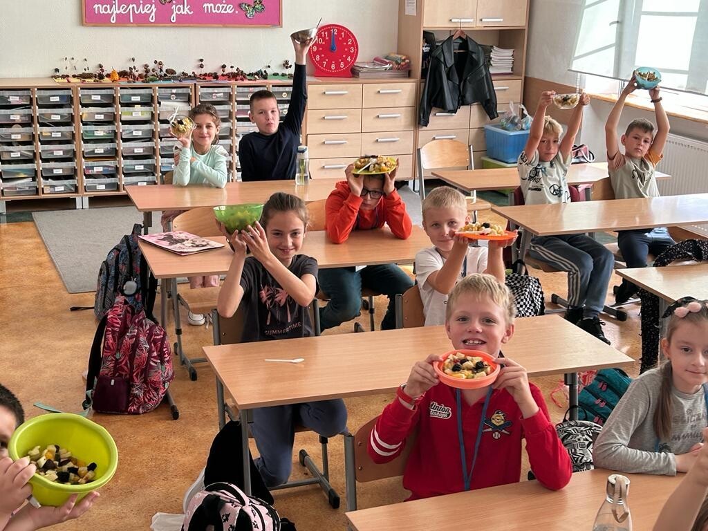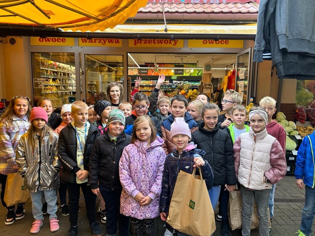 W ostatnim tygodniu klasa 3a rozmawiała o różnorakich zbiorach. Dzieci poznały rodzaje zbóż, rośliny oleiste oraz okopowe z których można robić różne przetwory. Na podsumowanie zajęć trzecioklasiści wybrali się do warzywniaka, w którym omówili przetwory, jakie były w asortymencie oraz sami dokonali zakupów ulubionych owoców, z których później zrobiona została smaczna sałatka pełna witamin!