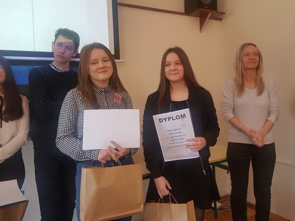 Uczniowie rozwiązywali test leksykalno-gramatyczny z elementami wiedzy o krajach danego obszaru językowego. W konkursie języka niemieckiego na miejscu II i III uplasowały się uczennice naszej szkoły Weronika Gołąbowicz i Anna Zechlin. Najlepsi otrzymali nagrody książkowe i rzeczowe. Wszyscy uczestnicy otrzymali dyplomy udziału, a nauczyciele podziękowania. Wszystkim gorąco gratulujemy!