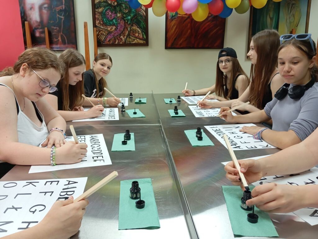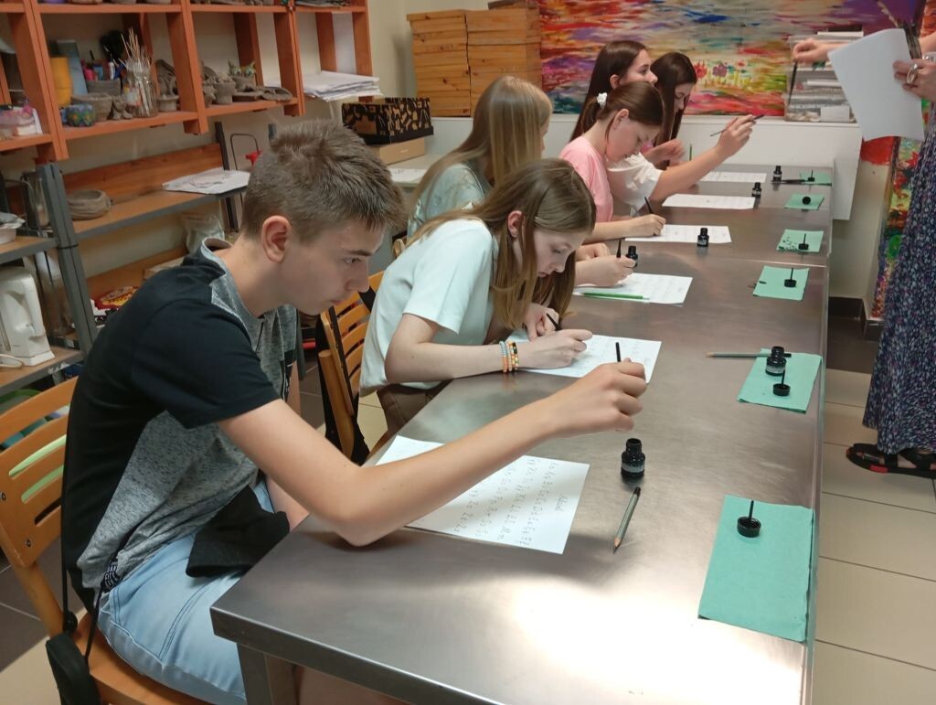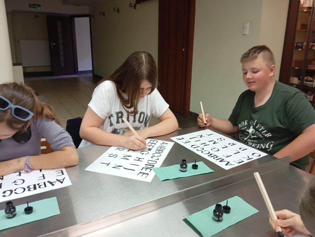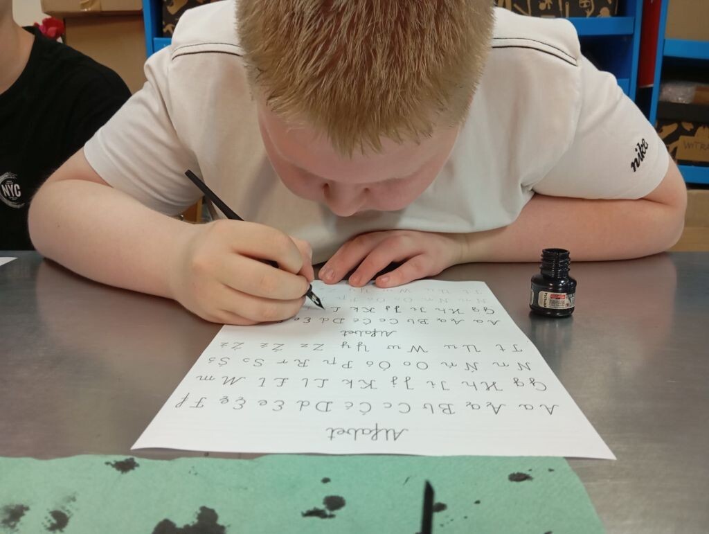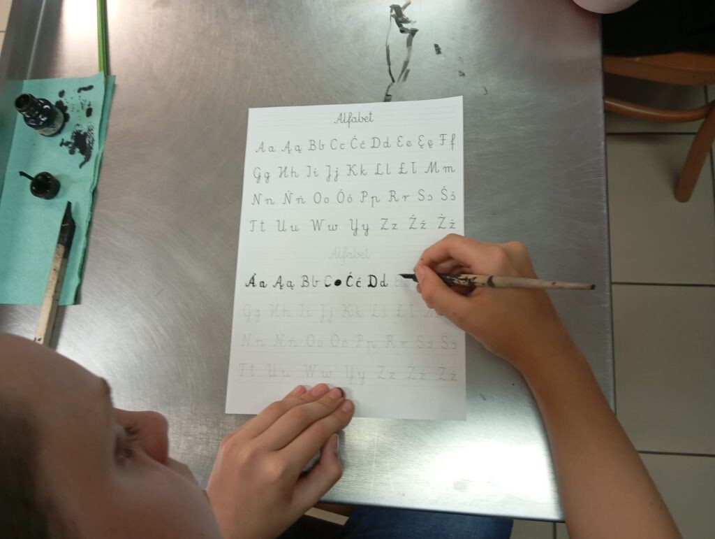 22 maja 2024r. uczennice i uczniowie: VII B, VI A i IV C zmierzyli się z umiejętnością pięknego pisania drewnianym "piórem". Gościliśmy w lęborskim Muzeum na warsztatach pięknego pisania, czyli kaligrafii. Mogliśmy potrenować pisanie majuskuł i minuskuł oraz pisma szkolnego. Uczniowie przyznają, że pisanie piórem ze stalówką jest dzisiaj sztuką. Zmagania przede wszystkim z odpowiednim naciskiem obsadki na papier uwieńczone zostały kartami wypełnionymi poprawnym pismem. Najlepszym w estetycznym, zgodnym z normami zapisem kolejnych liter, okazał się Borys Borowiecki.