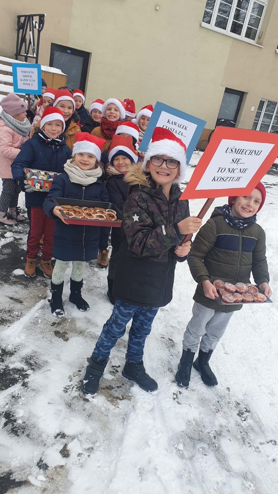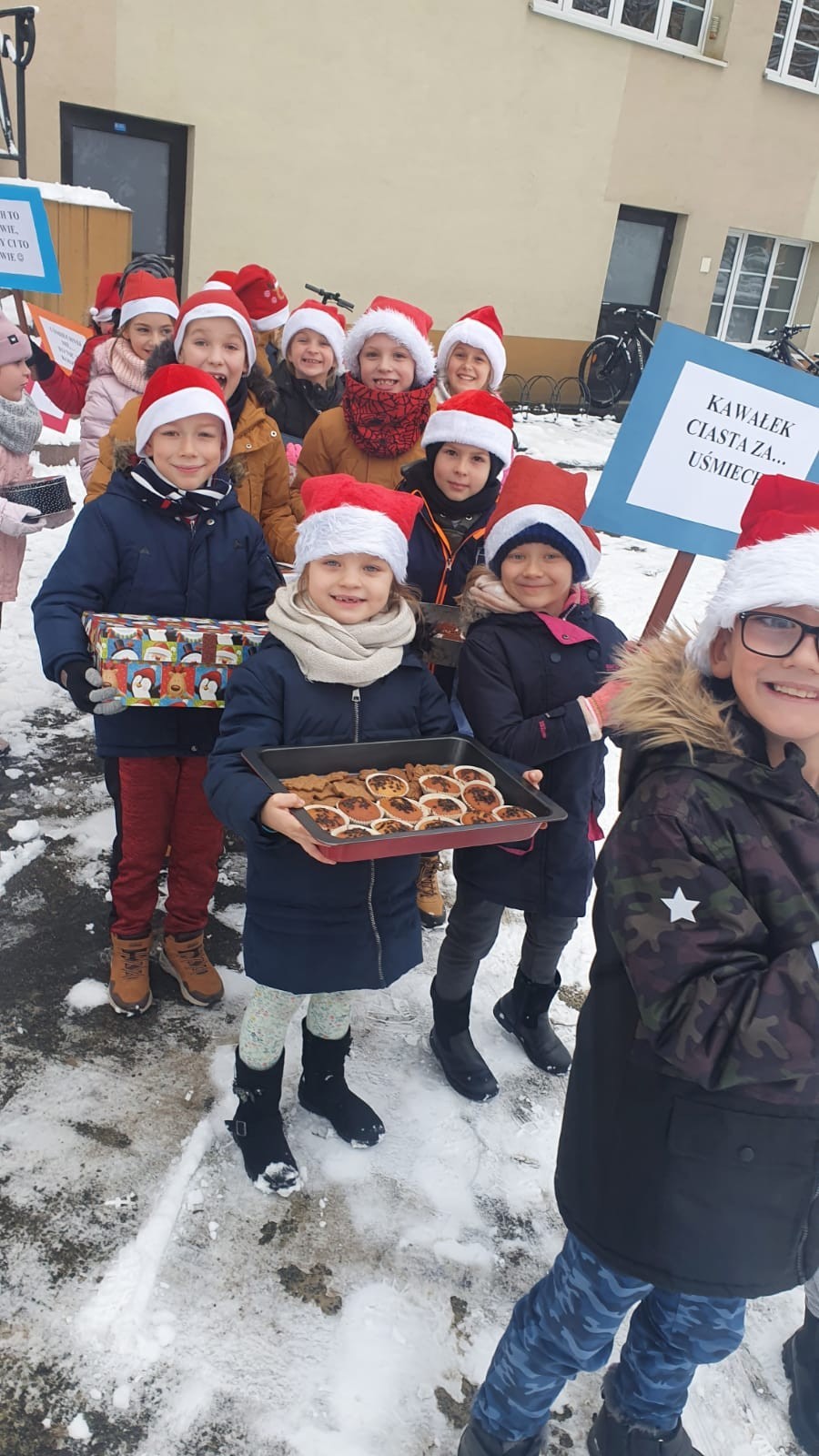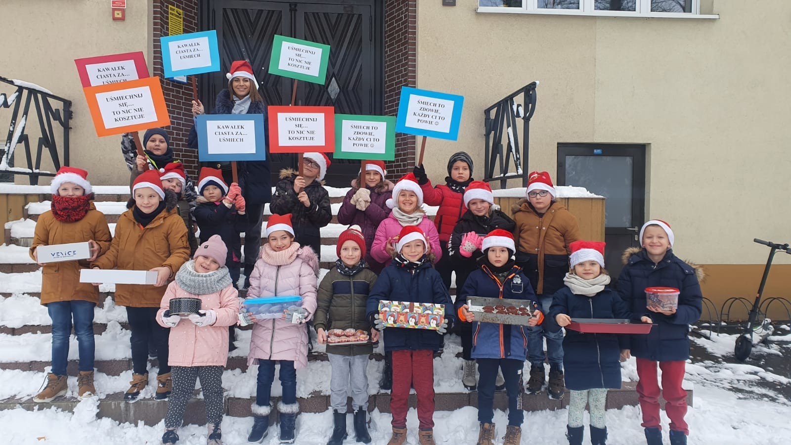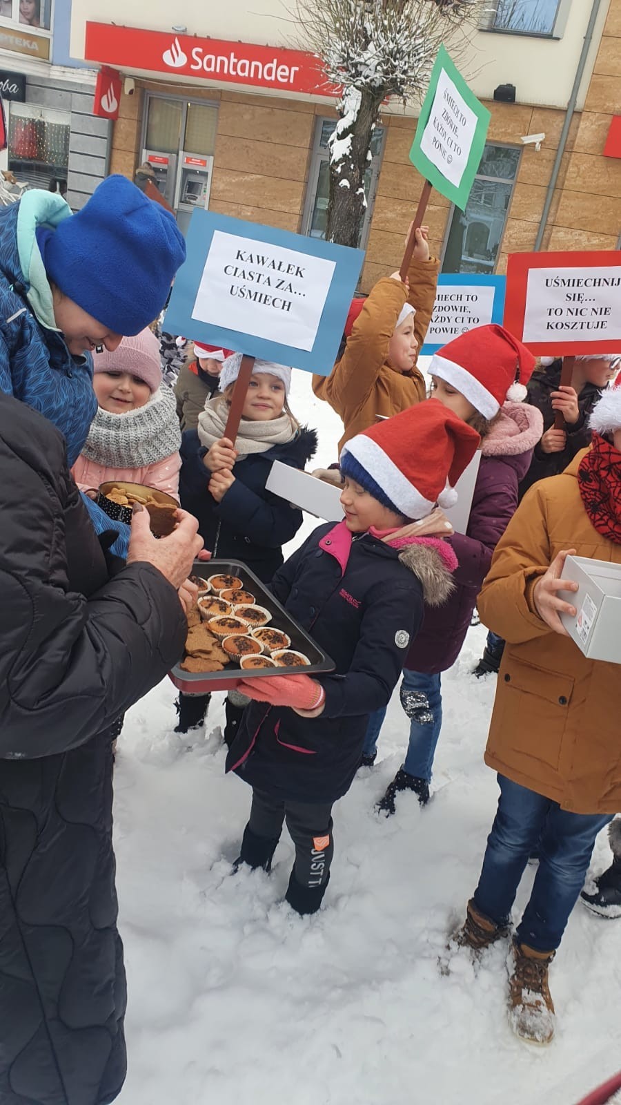 W piątek, 10 grudnia, mali Mikołaje z klasy Ia z wychowawcą wzięli udział w akcji pod hasłem Kawałek ciasta za uśmiech. Dzieciaczki , spacerując po ul. Staromiejskiej i Placu Pokoju, częstowały przechodniów słodkościami . Akcja ta miała na celu pokazanie dzieciom, że można wywołać uśmiech na twarzy drugiego człowieka , ofiarowując mu nawet najdrobniejszą rzecz. Pierwszoklasiści przygotowali również tabliczki z hasłami promującymi tę wspaniałą inicjatywę.