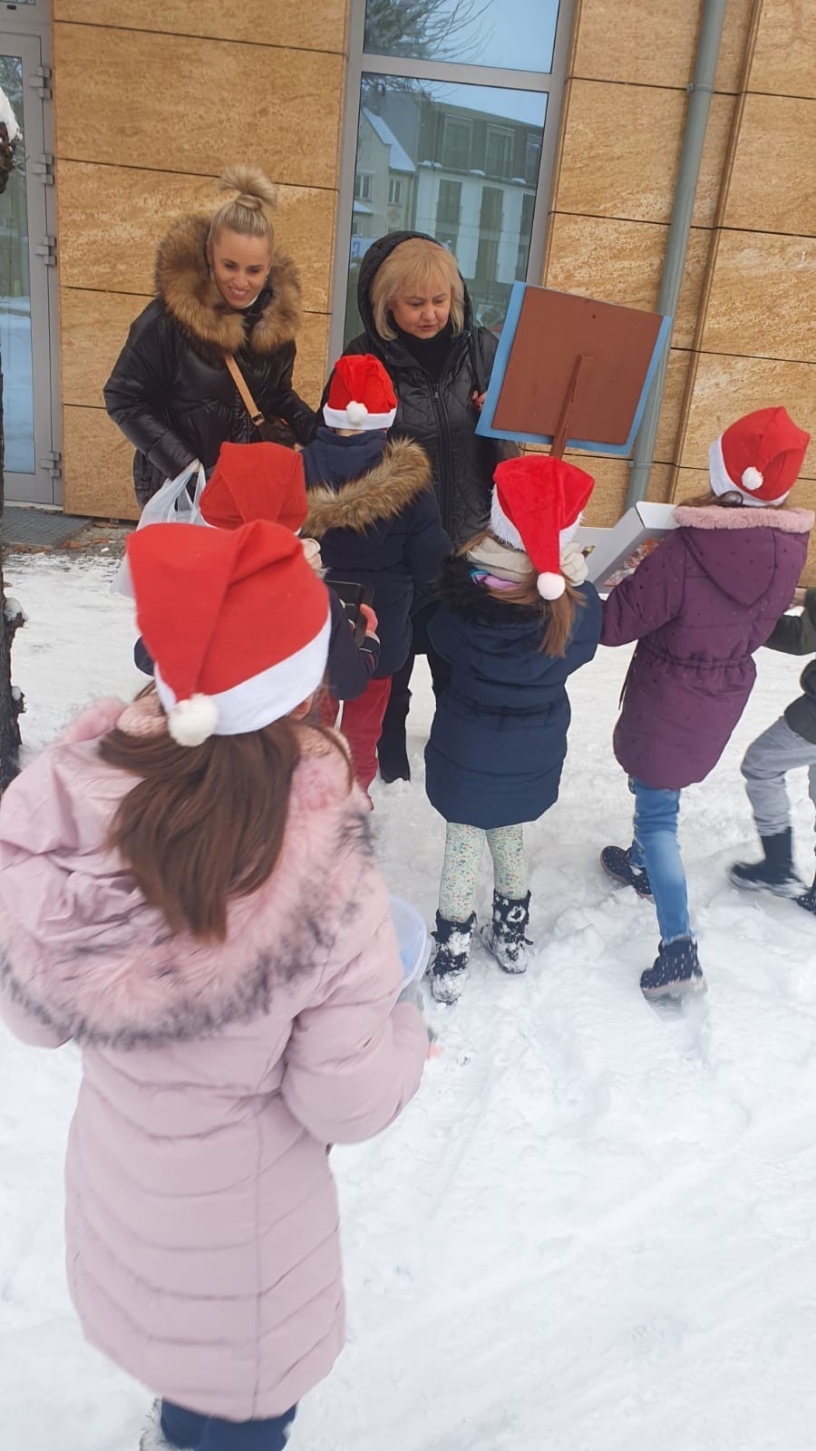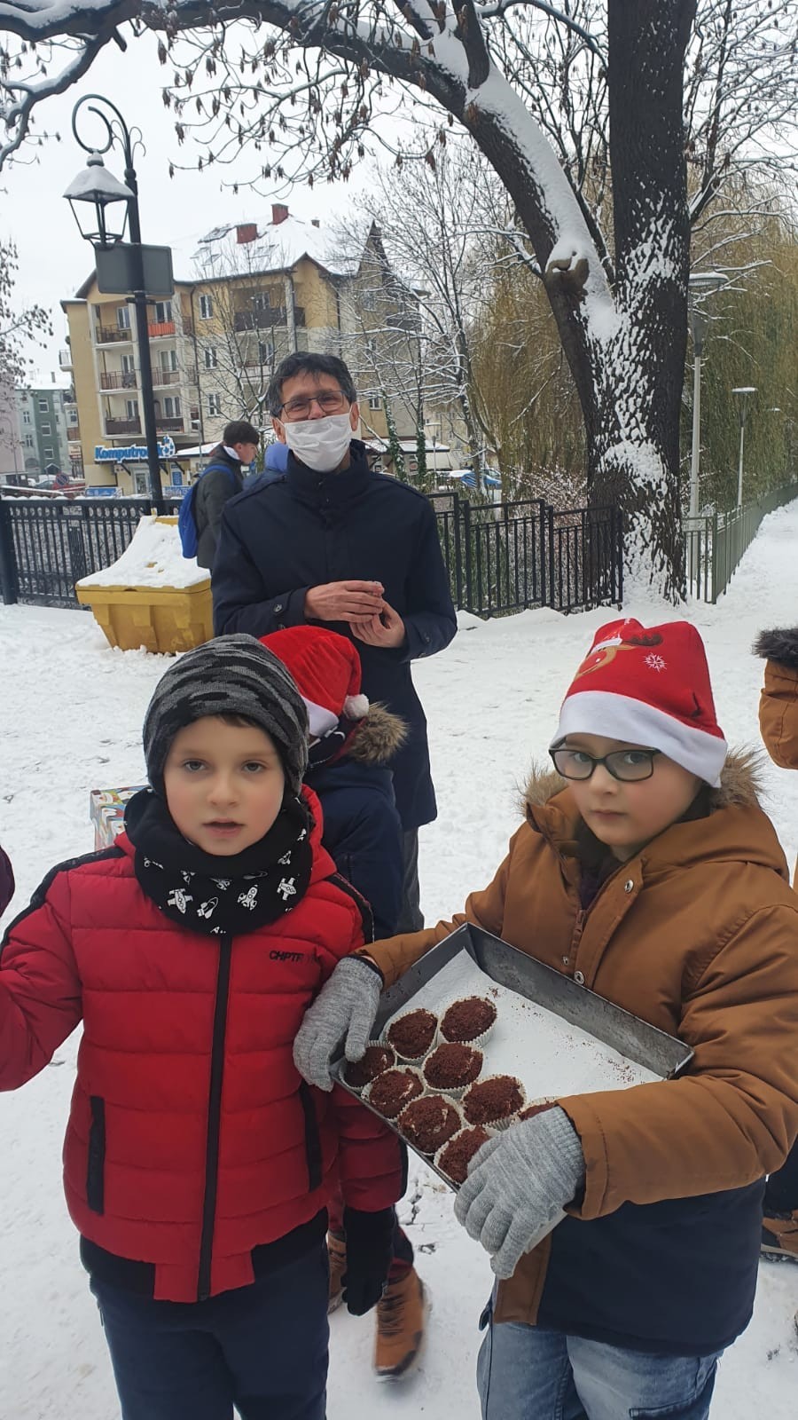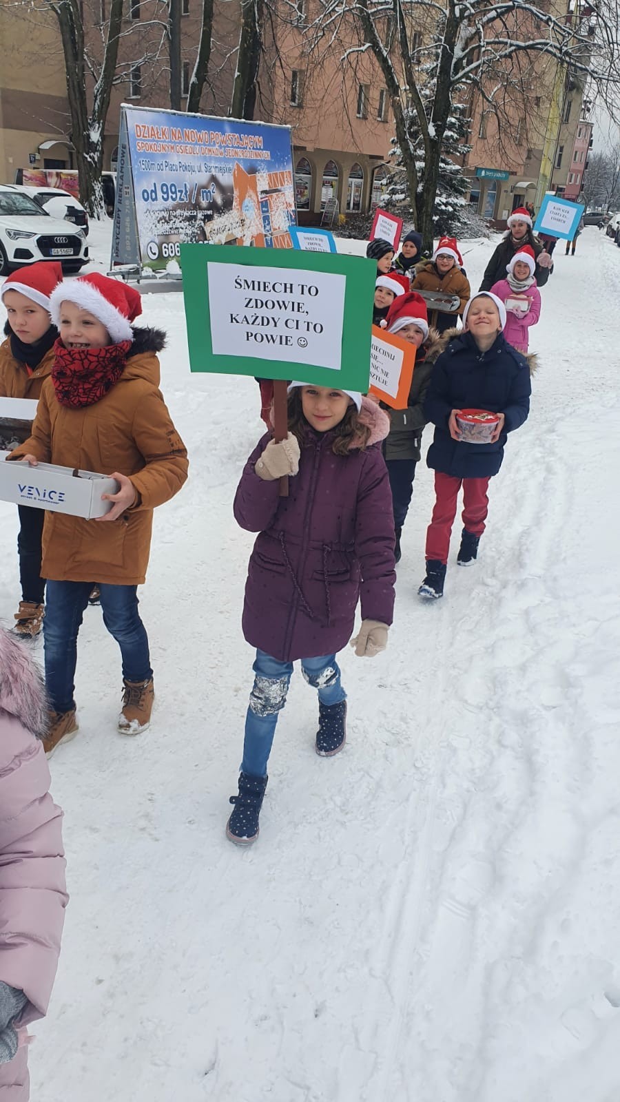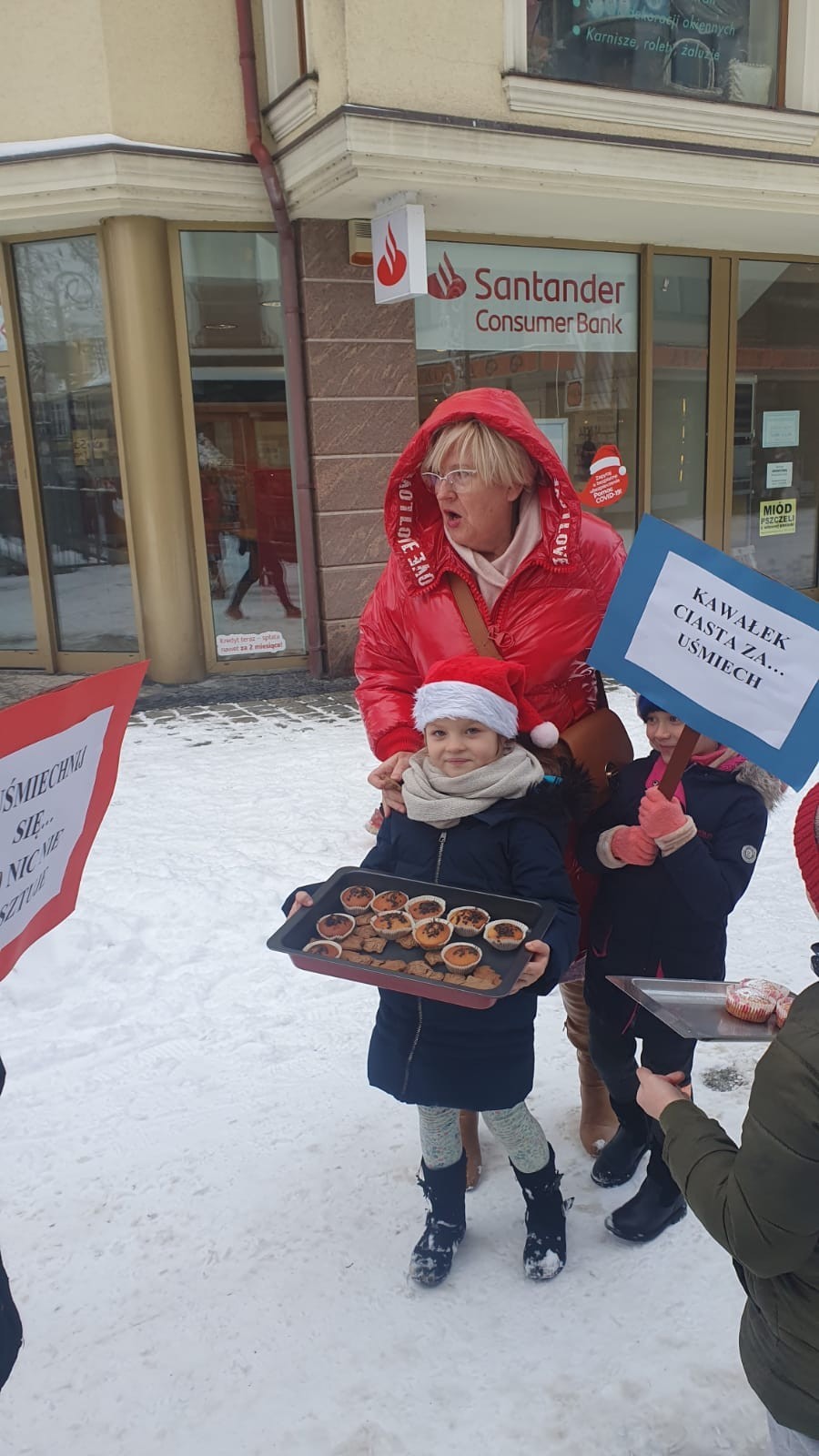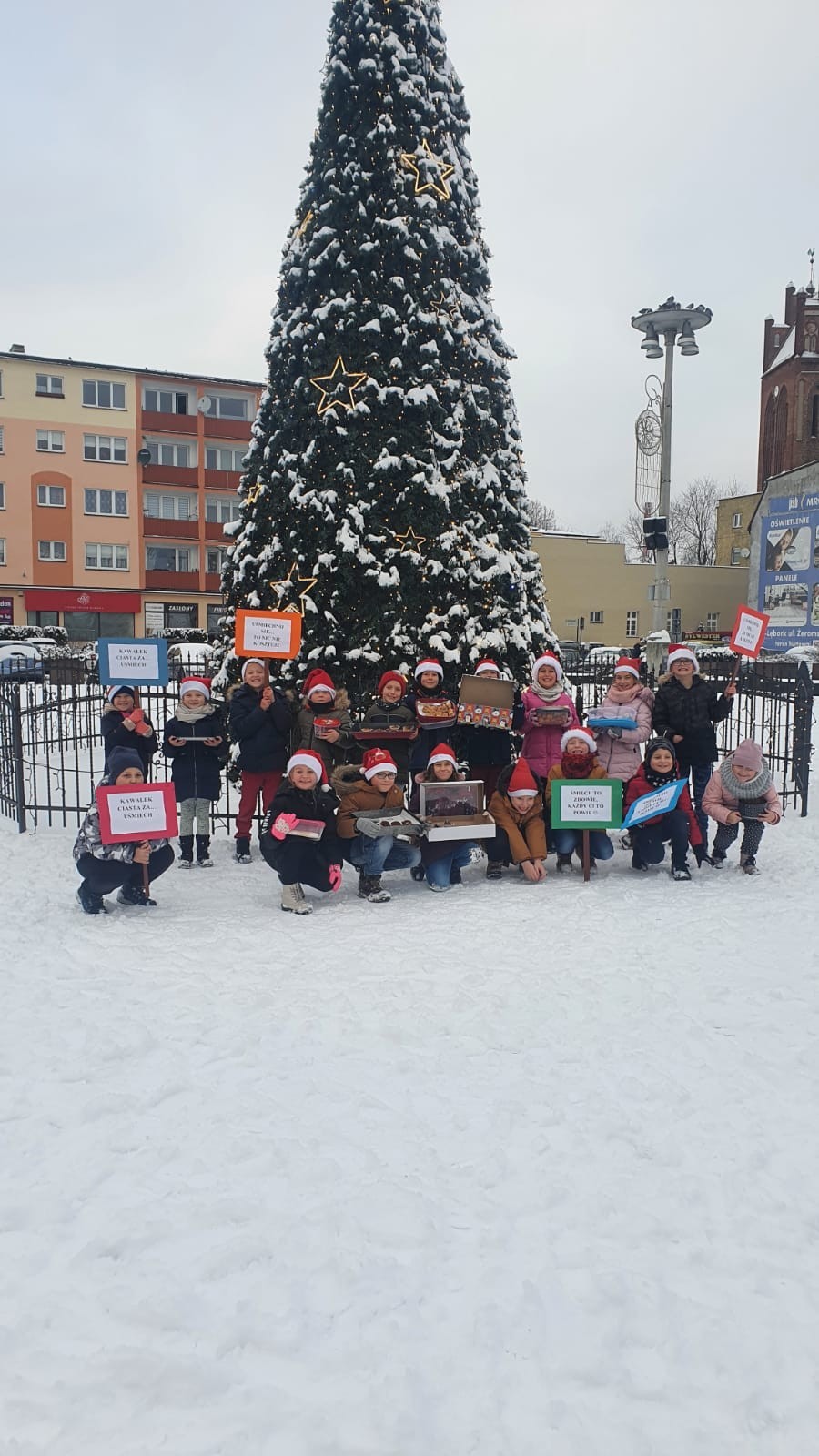 W piątek, 10 grudnia, mali Mikołaje z klasy Ia z wychowawcą wzięli udział w akcji pod hasłem Kawałek ciasta za uśmiech. Dzieciaczki , spacerując po ul. Staromiejskiej i Placu Pokoju, częstowały przechodniów słodkościami . Akcja ta miała na celu pokazanie dzieciom, że można wywołać uśmiech na twarzy drugiego człowieka , ofiarowując mu nawet najdrobniejszą rzecz. Pierwszoklasiści przygotowali również tabliczki z hasłami promującymi tę wspaniałą inicjatywę.