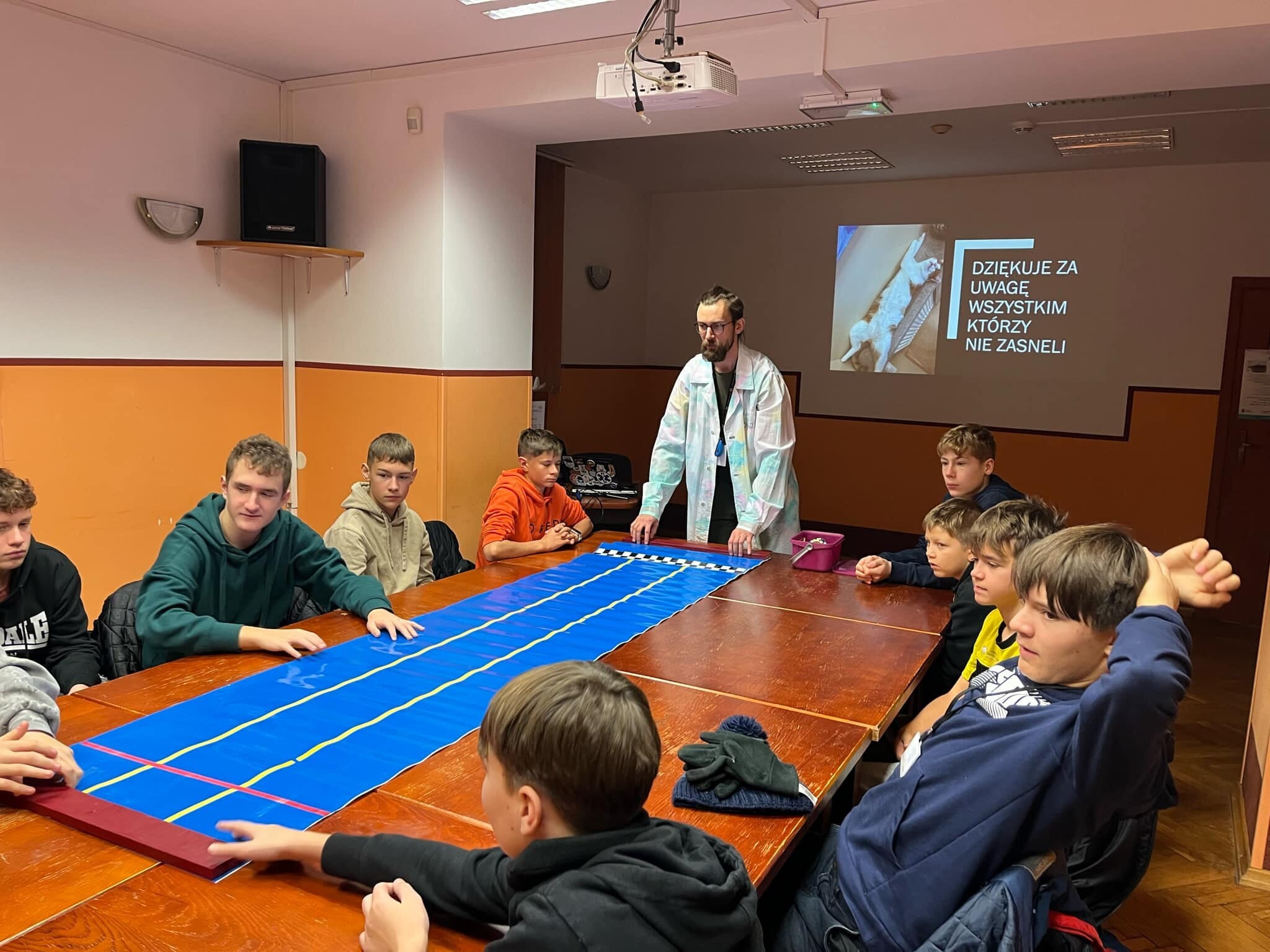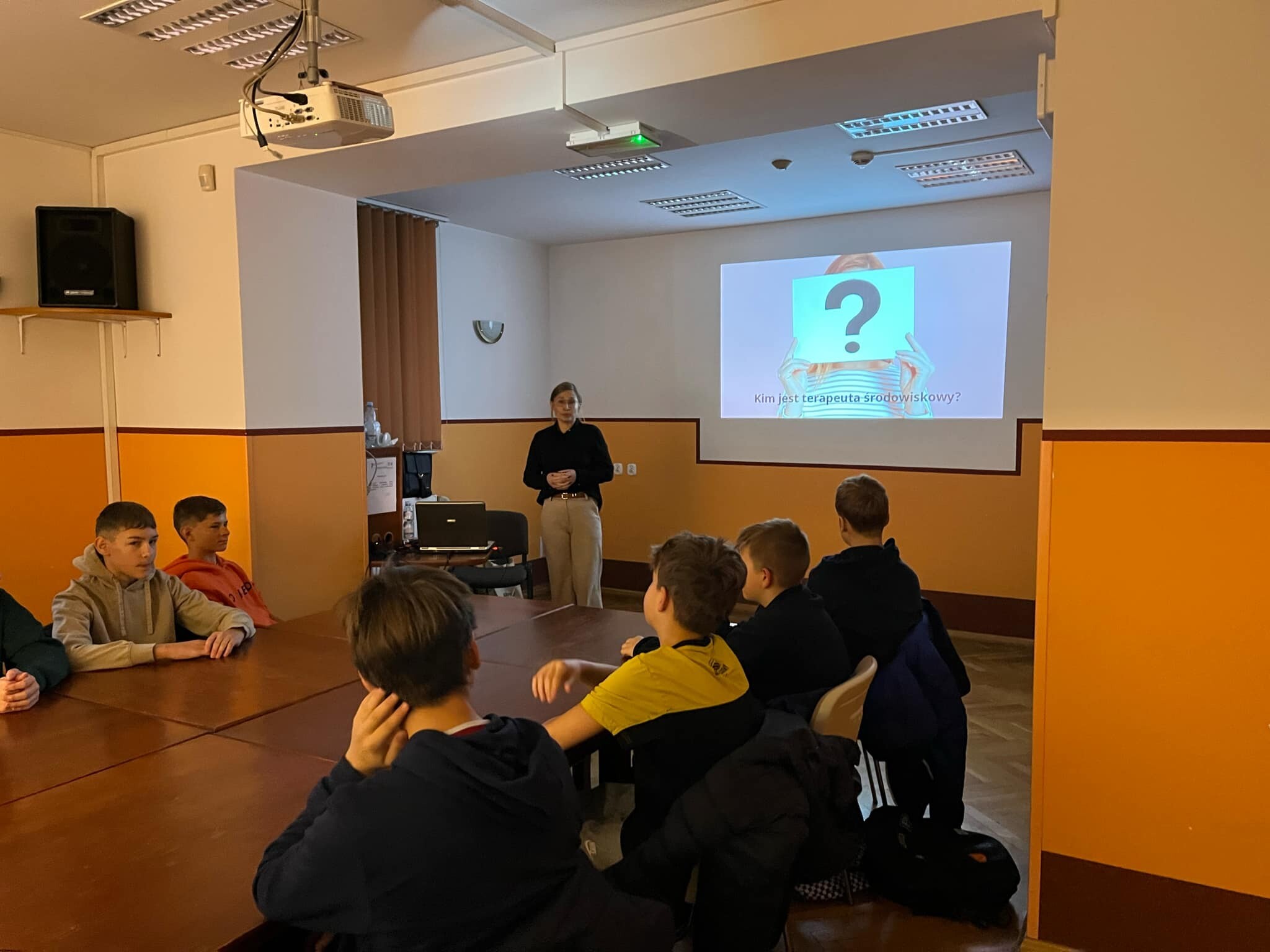 Klasa 7c w ramach projektu Otwarta firma odwiedziła Samodzielny Publiczny Specjalistyczny Zakład Opieki Zdrowotnej w Lęborku. Uczniowie mieli możliwość zapoznania się z zawodami terapii środowiskowej oraz terapii zajęciowej. Najpierw siódmoklasiści wysłuchali wykładu terapeuty środowiskowego, pani mgr Magdaleny Fludry, która przybliżyła specyfikę i charakter wykonywanej przez nią pracy. Uczniowie mieli możliwość wziąć udział w krótkiej scence i sami doświadczyć, czym tak naprawdę zajmuje się terapeuta środowiskowy. Druga część spotkania dotyczyła pracy terapeuty zajęciowego, a wykład na ten temat poprowadził mgr Rafał Bocian. Na koniec chętni mogli się zmierzyć w grze zręcznościowej wykonanej samodzielnie przez pacjentów oddziału psychiatrycznego.