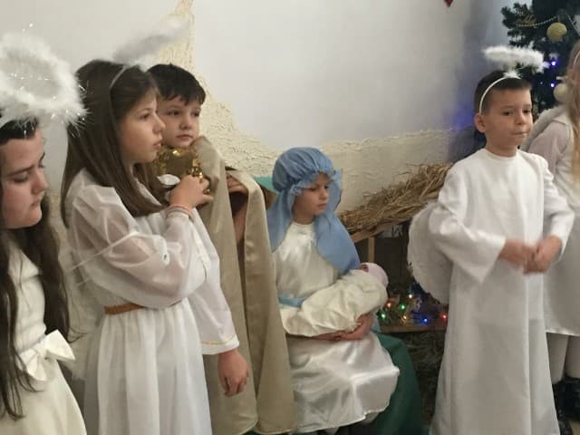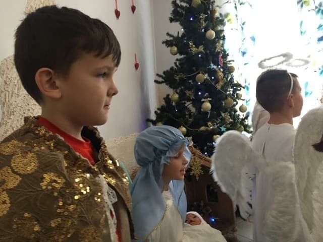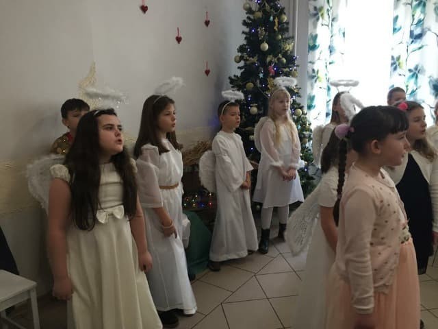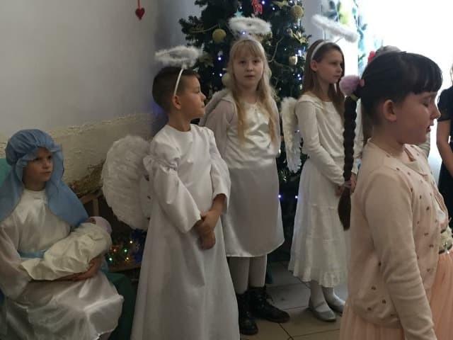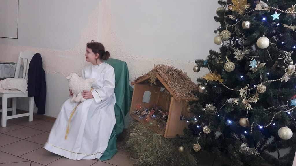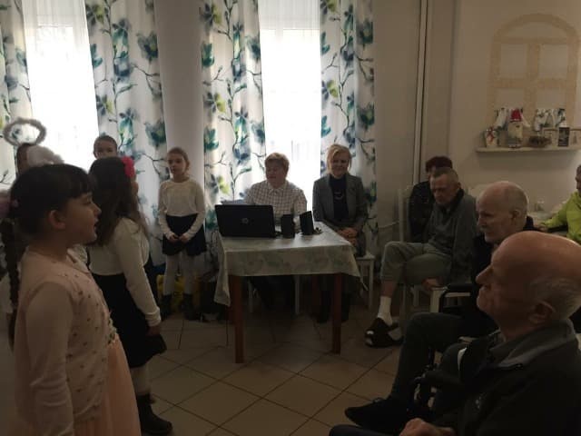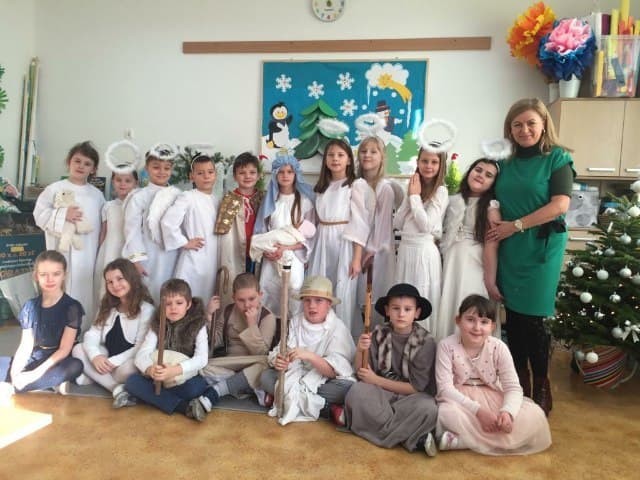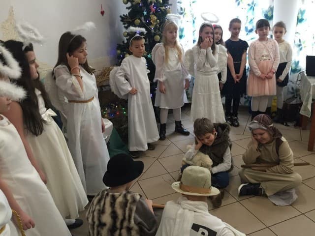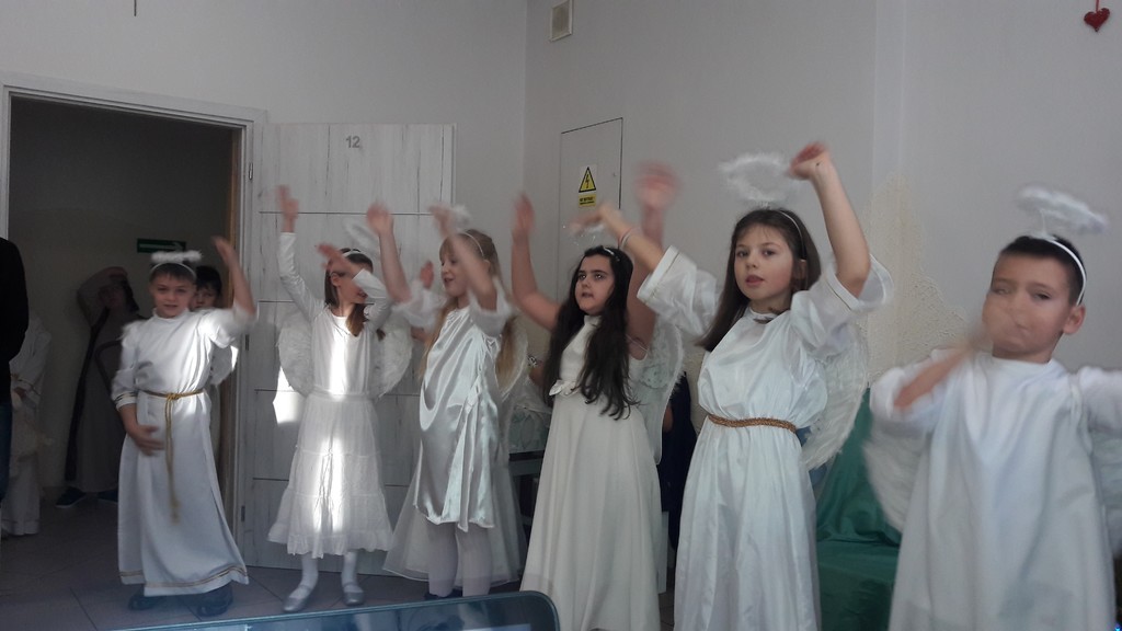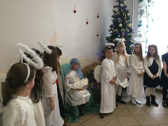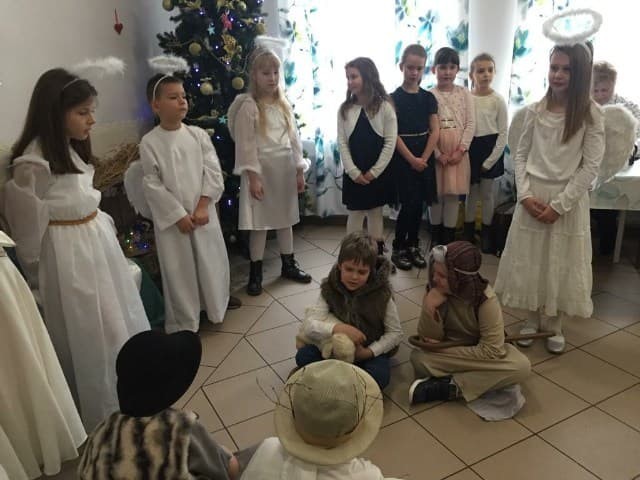 Wtorkowe przedpołudnie 17.12. upłynęło uczniom klasy IIb pod znakiem gościnnego występu jasełkowego w Domu Pomocy Społecznej w Lęborku. Dzieci udały się tam pod opieką wychowawcy oraz pani katechetki, a towarzyszyła im również pani dyrektor naszej szkoły Grażyna Ruszkowska. Drugoklasiści zaprezentowali podopiecznym placówki piękny występ jasełkowy, na który składały się sceny związane z narodzeniem Jezusa. Program ten został przygotowany pod kierunkiem p.Ewy Robakiewicz oraz p. Marzeny Kurzydło. Nie zabrakło wspólnego kolędowania , tańców, aniołów....i mnóstwa wzruszeń. Uczniowie przygotowali też wcześniej własnoręcznie wykonane kartki bożonarodzeniowe, a młodzież z klas starszych wypisała adresowane do pensjonariuszy życzenia. Bardzo dziękujemy za otwarte serca i pomoc p.M. Poziemskiej. Widać było, że występ dzieci wzbudził ogromne emocje wśród widzów, zaś na ich twarzach malowało się wzruszenie. Nasi młodzi aktorzy zostali nagrodzeni gromkimi brawami.