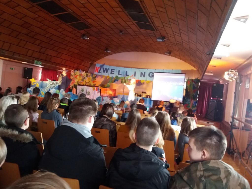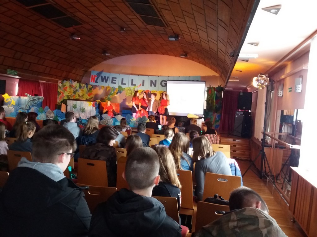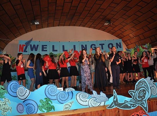 Obejrzeliśmy przedstawienie o stolicy Nowej Zelandii - miejscu tętniącym życiem, pozytywną energią i soczystą zielenią. Aby zaprezentować Wellington, wykorzystano różnorodne formy przekazu – prezentację multimedialną pokazującą położenie miasta i jego najważniejsze zabytki, ale również scenki odtwarzane przez uczniów, piosenki i tradycyjne tańce w ich wykonaniu . Zaakcentowano fakt, że miasto to uchodzi za centrum krajowego przemysłu filmowego, który bardzo „rozwinął skrzydła” dzięki produkcji hitu filmowego „Władca Pierścieni” – scenka z tego filmu rozbawiła publiczność. Natomiast piosenka „I see fire” – Ed Sheeran - promująca film „Hobbit: Pustkowie Smauga” w pięknym wykonaniu uczennicy przy akompaniamencie gitary, szczerze wzruszyła widownię.