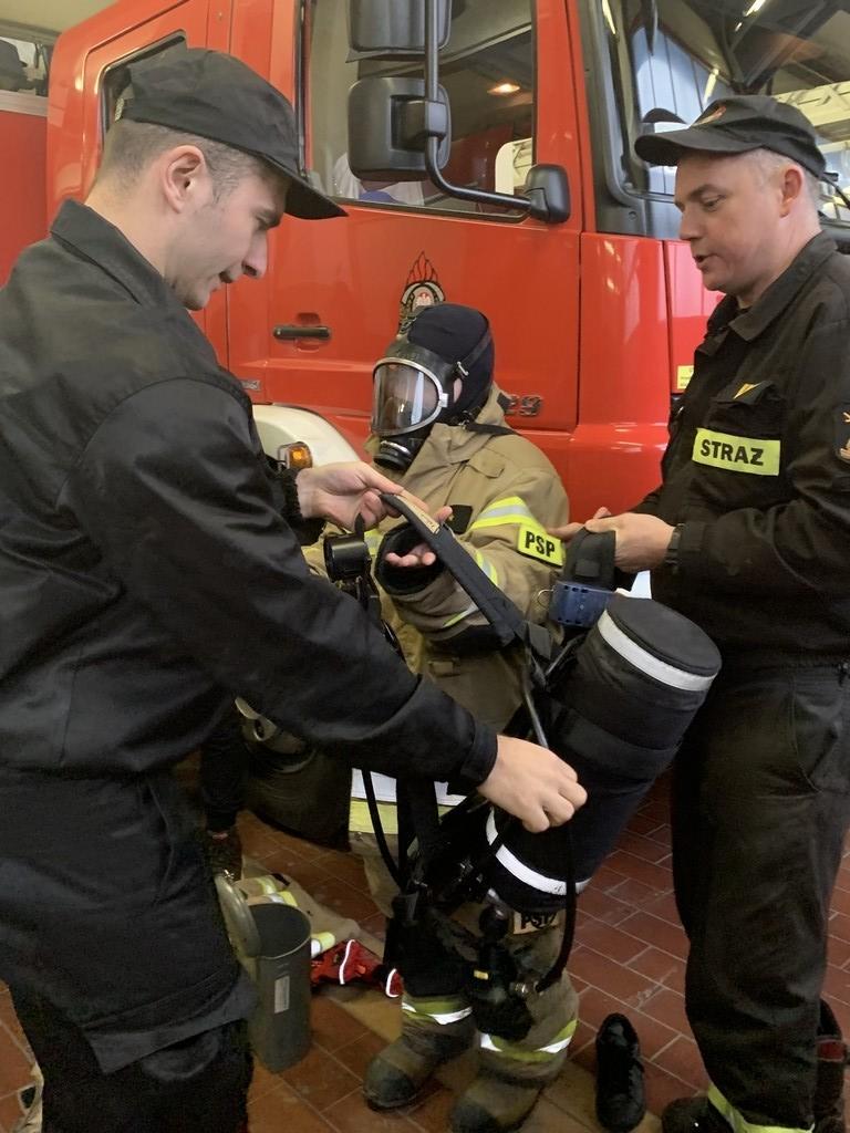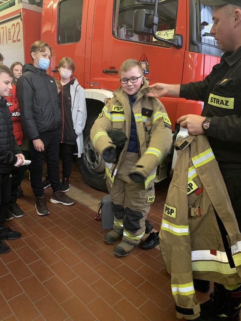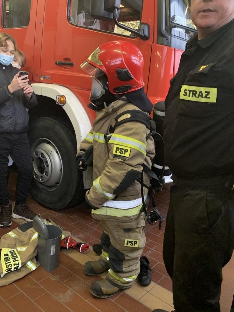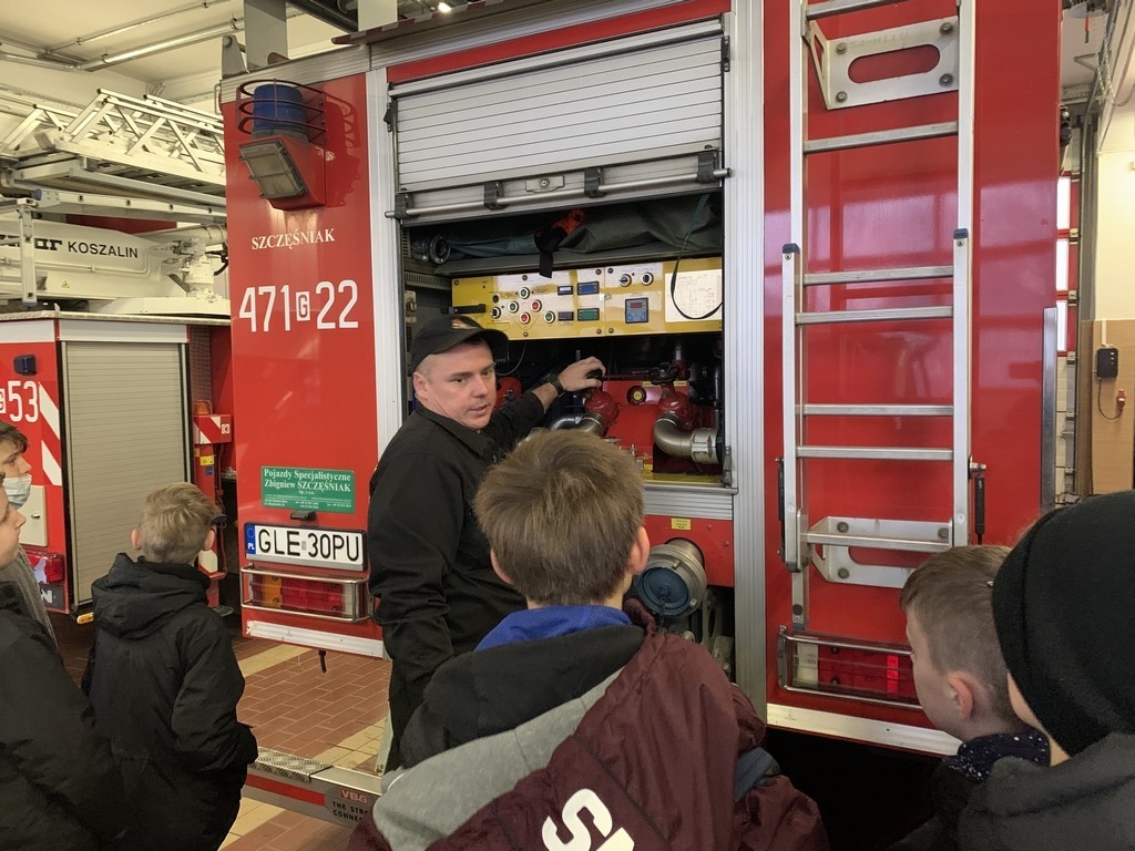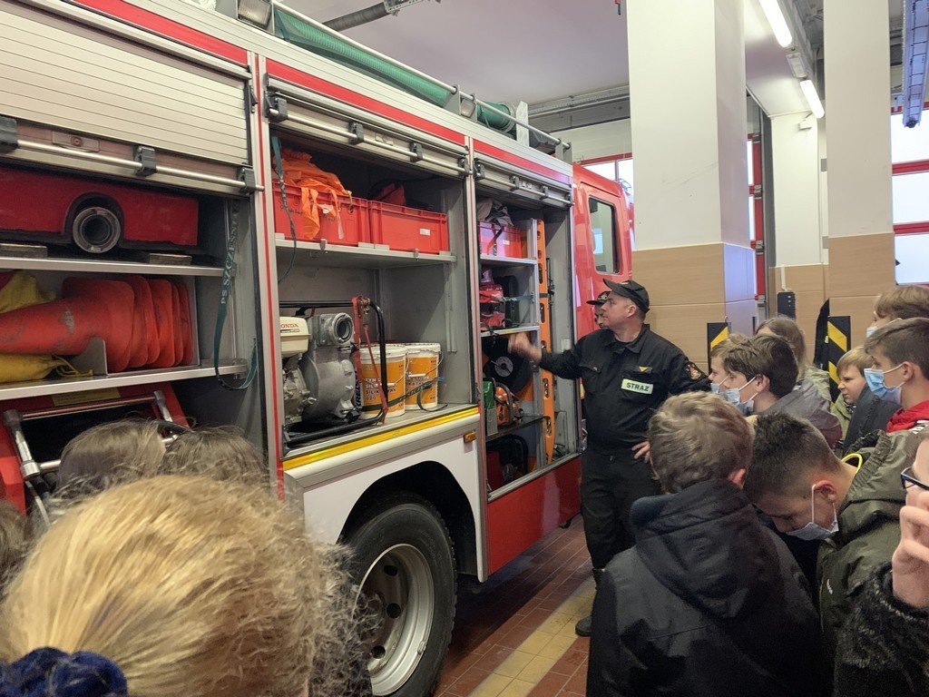 Uczniowie klas: VII D I VII B odwiedzili w czwartek Powiatową Straż Pożarną w Lęborku. Wizyta to kontynuacja projektu ,,Otwarta firma”. Uczniowie klas VII mieli okazję zapoznać się z ciekawą i niebezpieczną pracą strażaków. Uczniów interesowały godziny pracy oraz zasady rekrutacji. Obejrzeli sprzęt wykorzystywany w codziennej pracy oraz przymierzali ubiory strażaków wykorzystywane podczas udziału w akcjach. Nasi prelegenci opowiadali o swojej codziennej pracy i akcjach, w których uczestniczyli. Pan Mateusz Wołocznik , związany z Ochotniczą Służbą Pożarniczą, zachęcił młodych ludzi do wstąpienia w szeregi młodych adeptów służby pożarniczej.