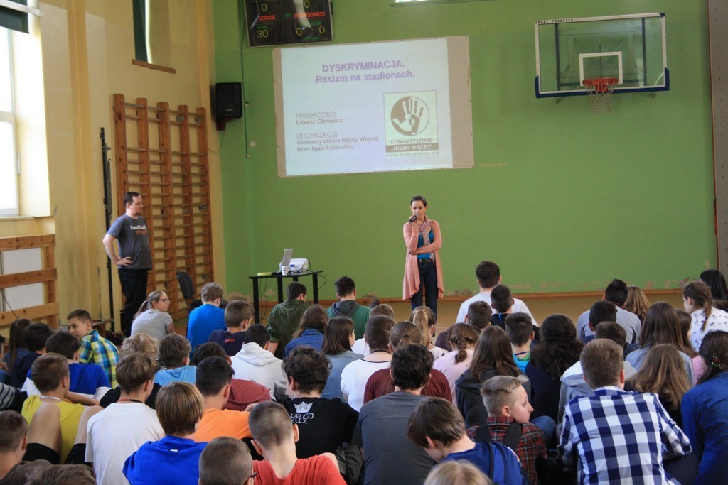 Spotkanie odbyło się w ramach realizowanego w naszej szkole projektu Bezpieczna Szkoła i dotyczyło tematu dyskryminacji na stadionach piłkarskich.