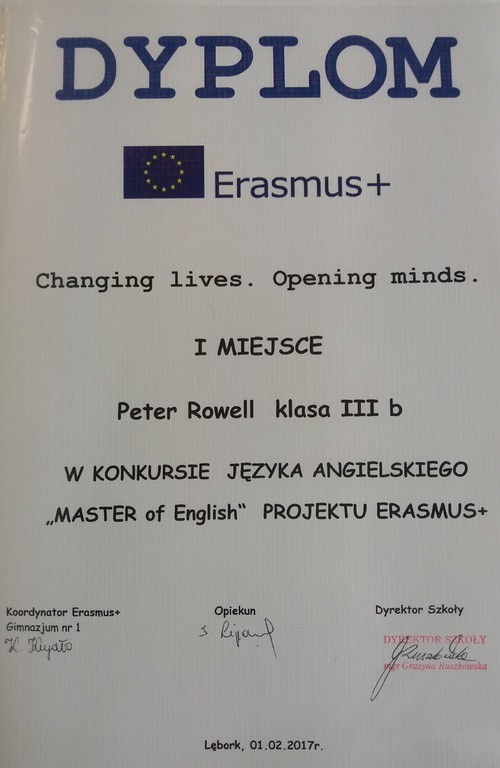 I m-ce Peter Rowell , 3b II m-ce Aleksandra Panek, 3b Zuzanna Szybisty, 3c III m-ce Maja Kostuch, 3a