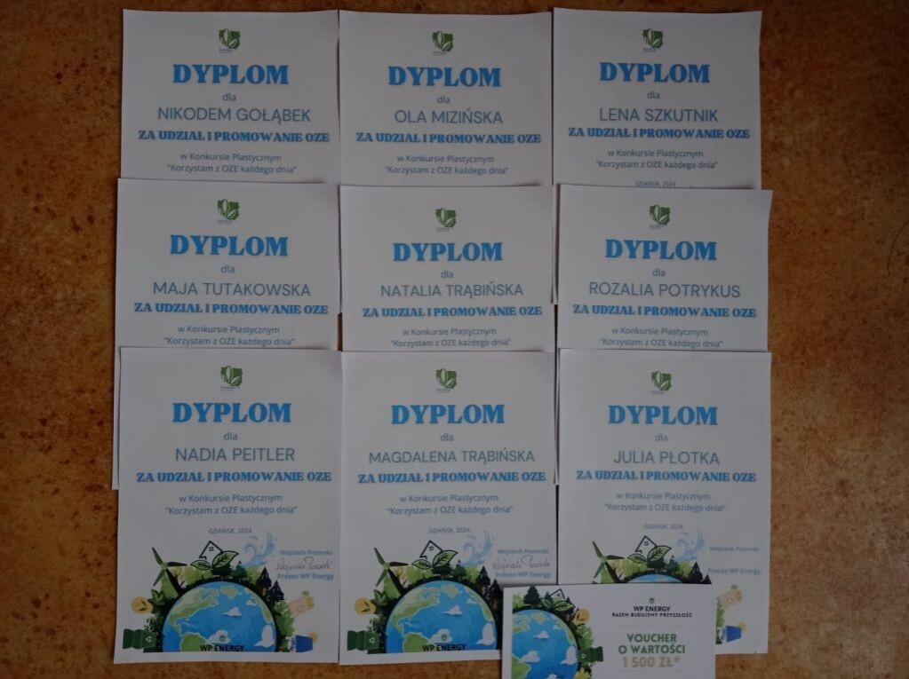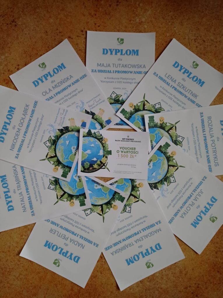 19 lutego otrzymaliśmy dyplomy i wyróżnienia od organizatorów Ogólnopolskiego Konkursu Plastycznego "Korzystam z OZE każdego dnia". Konkurs zorganizowany został przez firmę WP Energy oraz fundację Czysta Polska. Jego celem było przedstawienie korzyści płynących z zastosowania instalacji produkujących energię ze źródeł odnawialnych, wskazanie zagrożeń i skutków związanych ze zjawiskiem smogu, przedstawienie korzyści wynikających ze stosowania odnawialnych źródeł energii oraz wykorzystanie tych źródeł jako efektywne zarządzanie energią. Promowanie działań na rzecz przyszłości naszej planety odzwierciedlili w swoich pracach plastycznych uczniowie: Natalia Trąbińska z klasy IIIc, Magda Trąbińska z klasy VIb, Nadia Peitler, Nikodem Gołąbek i Lena Szkutnik z klasy IVc, Ola Mizińska z klasy Vb, Rozalia Potrykus z klasy VIc, Julia Płotka z klasy VIa, Maja Tutakowska z klasy VIIa.