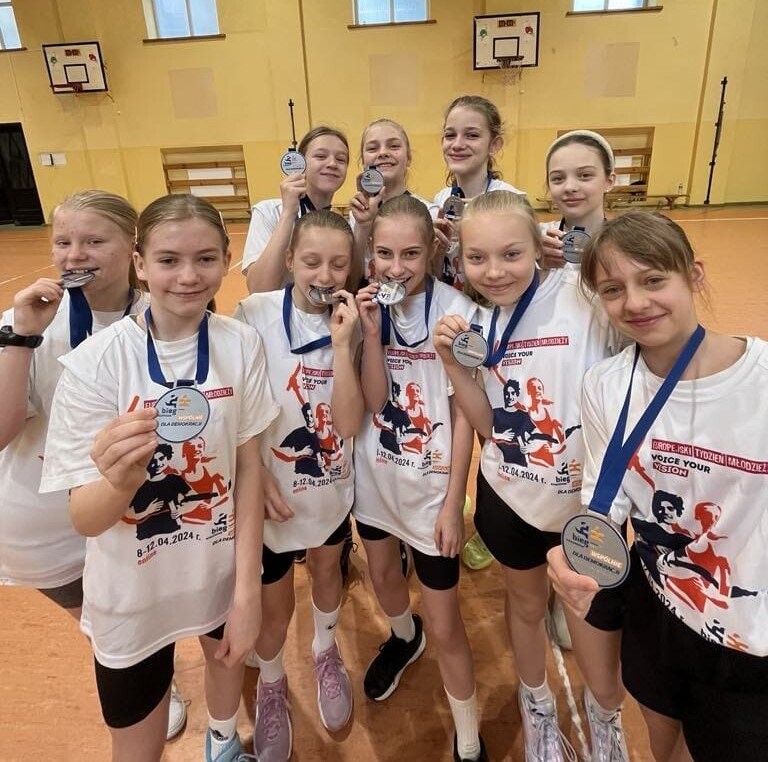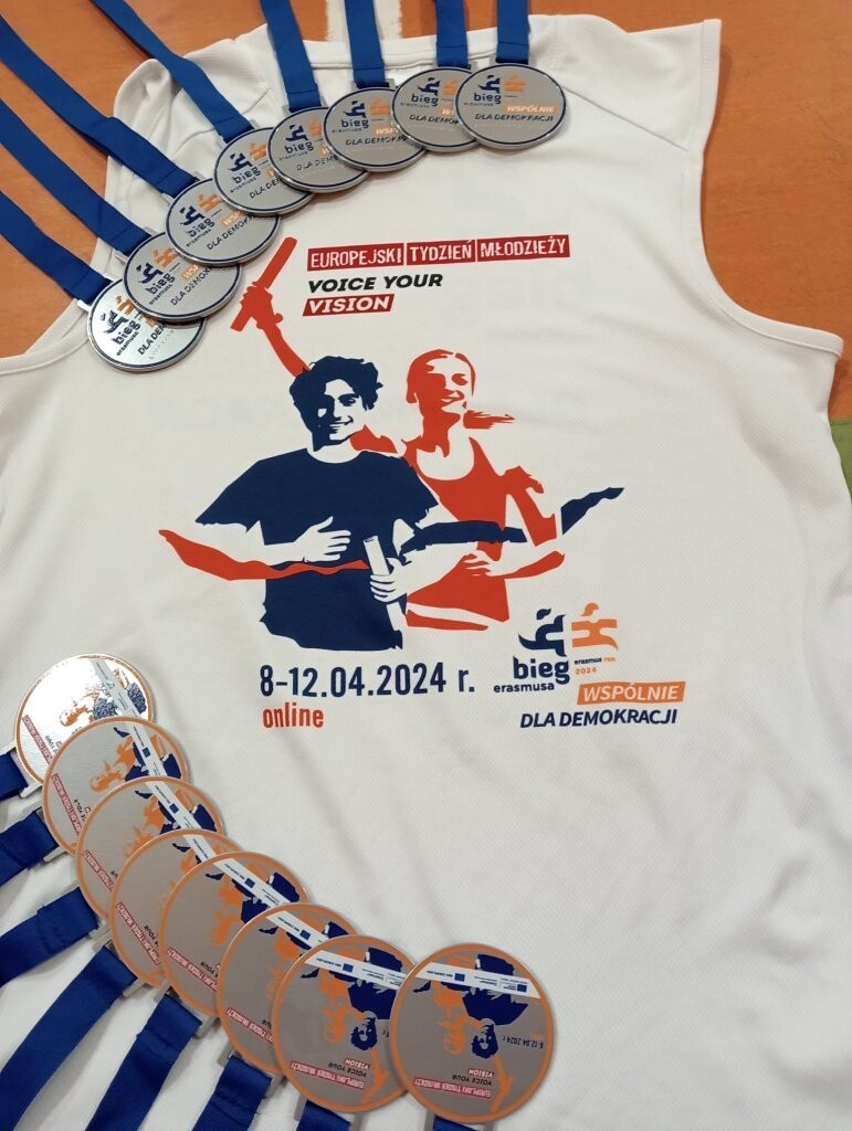 Nasze dziewczęta wzięły udział w e-Biegu Erasmusa. Zadaniem każdej z czterech czteroosobowych drużyn było przebiegnięcie 15 minut. Cała drużyna musiała łącznie przebiec jak najdłuższy odcinek w ciągu 1 godziny. Tegoroczny bieg jest wydarzeniem towarzyszącym Europejskiemu Tygodniowi Młodzieży 2024 pod hasłem "Wspólnie dla demokracji". Każda z dziewcząt otrzymała koszulkę i okazały medal. Brawo dla koszykarek!!!