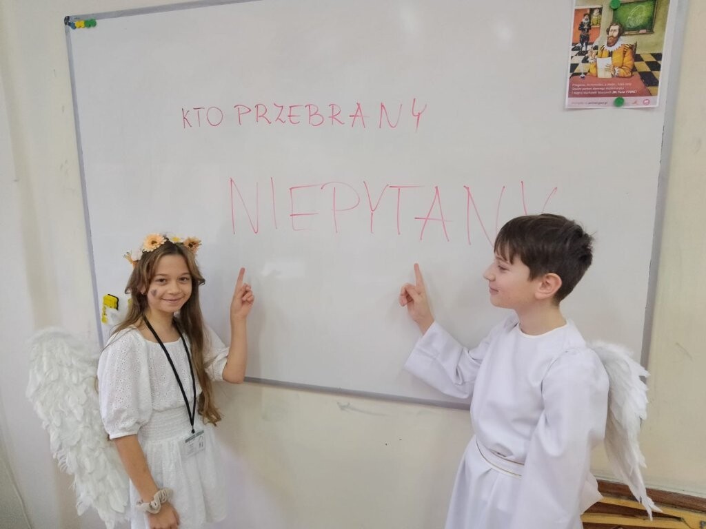 25 stycznia Samorząd Uczniowski zorganizował specjalną akcję pod hasłem: „Kto przebrany – niepytany!”. Uczniowie wykazując się wyobraźnią, poczuciem humoru i niezwykłą pomysłowością, przywdziali różne, fantazyjne stroje. Na szkolnym korytarzu pojawili się czarodzieje, wróżki, karatecy, budowlańcy, amazonka, piraci, kowbojka, policjantka, ale również eleganccy panowie w krawatach i muchach oraz dystyngowane damy. Pojawiły się tez postacie ze świata filmu: Audrey Hepburn oraz Ambroży Kleks we własnej osobie w towarzystwie swojego ulubieńca Szpaka Mateusza. To właśnie te postacie wzbudziły największy zachwyt. Najciekawsze przebrania zostały nagrodzone. Ponieważ trudno było dokonać wyboru, przewodnicząca Samorządu Uczniowskiego wszystkich przebierańców częstowała cukierkami. Akcja cieszyła się dużą popularnością. W szkole zrobiło się wesoło i kolorowo. Wszystkim dopisywały świetne humory tym bardziej, że na lekcje szło się bez obaw, że będzie się pytanym.