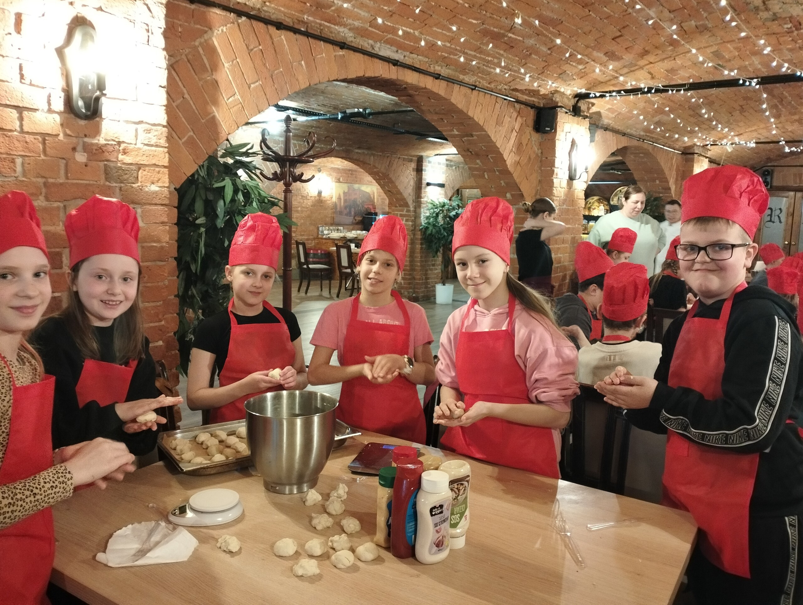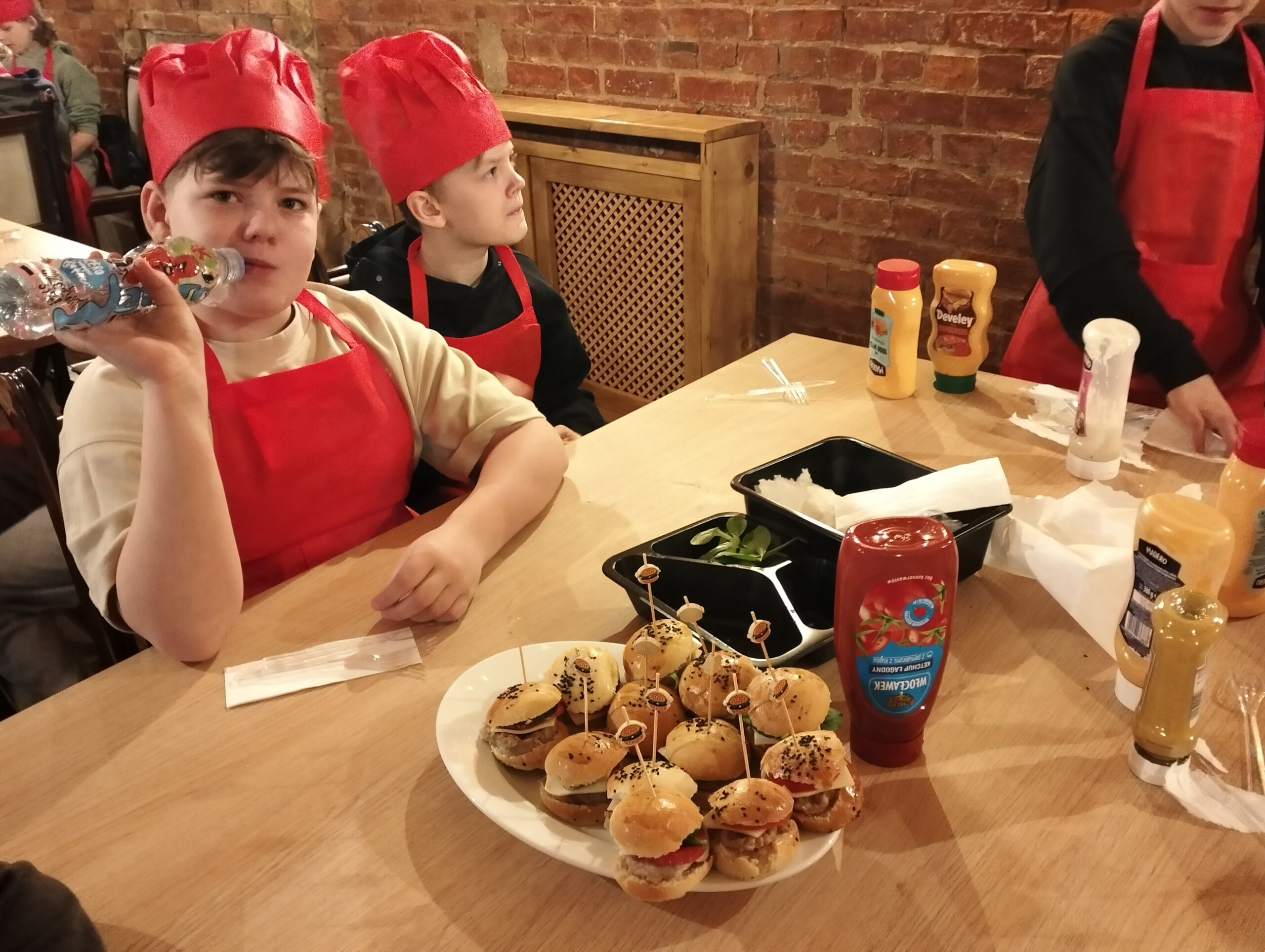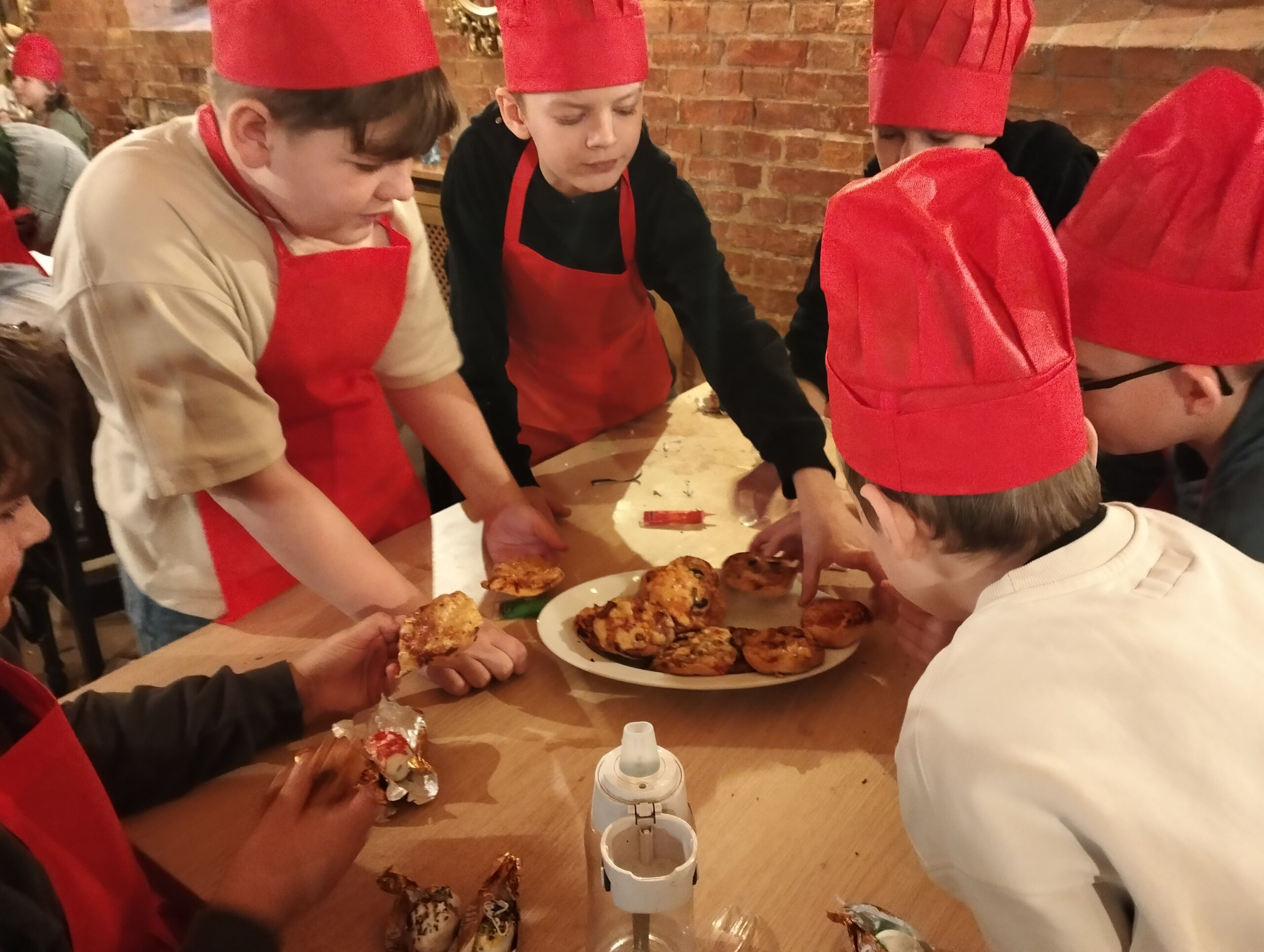 W czwartkowy poranek uczniowie klasy 4b pod opieką wychowawcy oraz mamy Poli, pani Dominiki , udali się na warsztaty kulinarne do znanej lęborskiej restauracji Karczma Rycerska. Tam zostali przywitani przez samego szefa kuchni, pod okiem którego mieli przyrządzić 4 różne dania. Najpierw zostali podzieleni na cztery grupy, które sami nazwali : Babeczki BFF+ Dziadeczek, Pulpeciki, Fryteczki oraz Ciepłe Pierogi. Wyposażeni w fartuszki oraz kucharskie czapeczki przystąpili do pracy. W jej efekcie powstały wspaniałe tortille, kolorowe pizzerinki, małe hamburgerki , zaś na deser- czekoladowe jajka okryte słodkim płaszczykiem. Zwieńczeniem ciężkiej pracy młodych kucharzy była degustacja- każdy mógł spróbować swoich dań, a nawet zabrać część z nich do domu, by podzielić się z najbliższymi. Wszyscy spisali się na medal, czego dowodem były certyfikaty wręczone przez samego szefa kuchni Karczmy Rycerskiej. To była niezwykle cenna i praktyczna lekcja, która z pewnością zachęci czwartoklasistów do spędzania czasu w kuchni i eksperymentowania w niej!