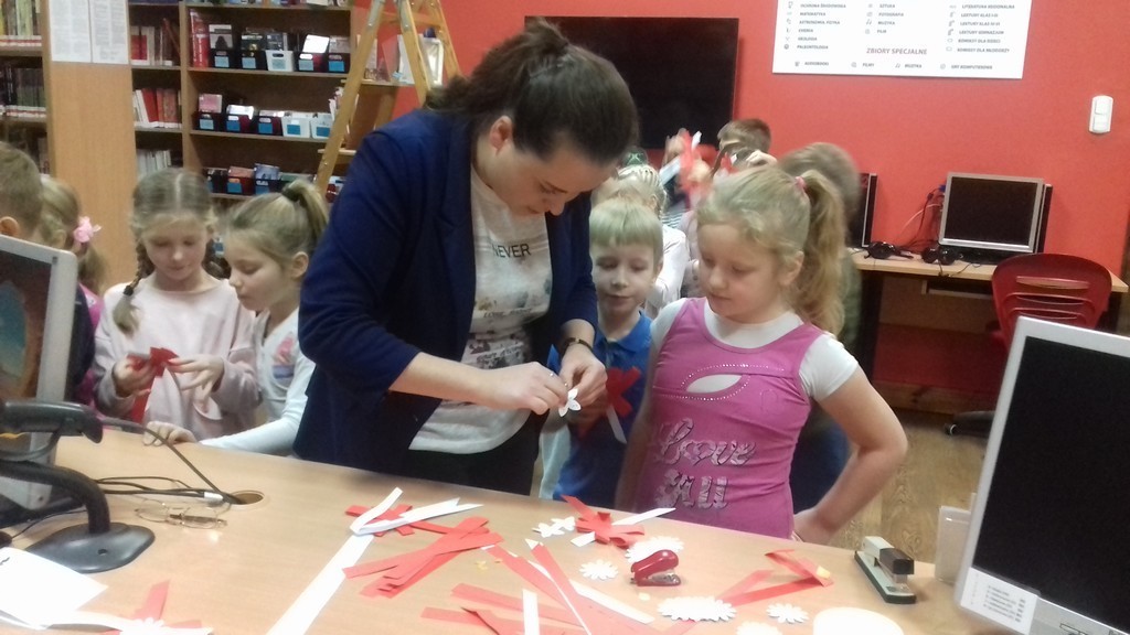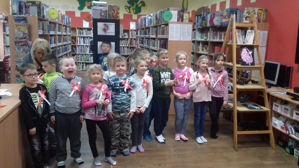 Na koniec wizyty, czyli w przed dzień Święta Niepodległości, uczniowie wykonali rozety narodowe oraz popisali się wiedzą historyczną dotyczącą tego święta.
