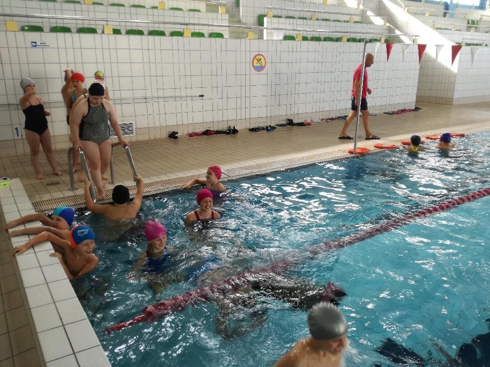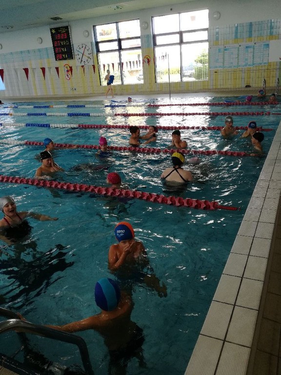 Jak wiadomo, zajęcia na basenie wpływają pozytywnie na rozwój psychofizyczny i sprawność dziecka. Wyzwalają one naturalną potrzebę ruchu . Dlatego w ramach zajęć z wychowania fizycznego uczniowie klas czwartych naszej szkoły: 4a i 4b w każdy piątek odbywają cotygodniowe lekcje pływania na Pływalni Miejskiej ,,Rafa". Pod okiem swoich nauczycieli i instruktorów mogą opanowywać podstawowe techniki pływackie, ponadto pływanie w znaczący sposób działa profilaktycznie na wady postawy oraz kształtuje prawidłową sylwetkę. Jest ono swoistą gimnastyką mięśni i stawów, poza tym zmniejsza napięcie mięśniowe. Krótko mówiąc, przynosi same korzyści tym, którzy nie boją się wody i chcą pływać.