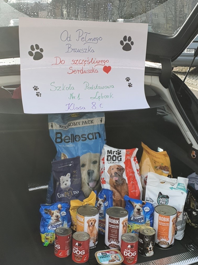 Nasi uczniowie to ludzie wielkiego serca, wrażliwi na krzywdę i los zwierząt. Młodzież z klasy 8c postanowiła zatem zebrać karmę dla podopiecznych schroniska w Małoszycach, by choć trochę wspomóc działalność tej placówki. Zebrane pakunki z żywnością dla psiaków i kociaków zostały dostarczone do Małoszyc przez rodziców uczniów klasy 8c. To ważne, by pomagać zwierzakom , zwłaszcza w tym trudnym jesienno- zimowym okresie.